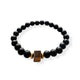 Elastic bracelet for men, handmade with matte black stone beads and a cross-shaped pendant. Minimalist design for casual outfits.