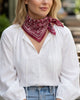 The Mini Caribe Red scarve is crafted from 100% silk, featuring exclusive hand-drawn designs created in France and expertly hand-printed in India.