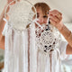 Diese Kreation ist vollständig handgefertigt mit ausgewählten Materialien (Federn, Wolle, weiße und beige Spitzen).