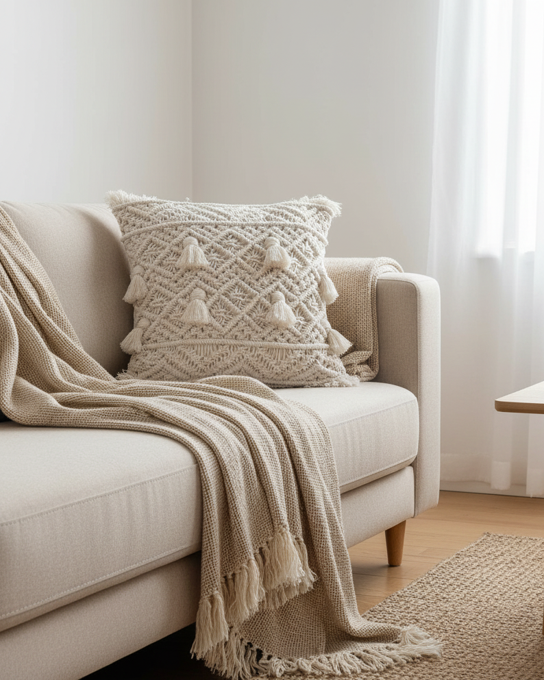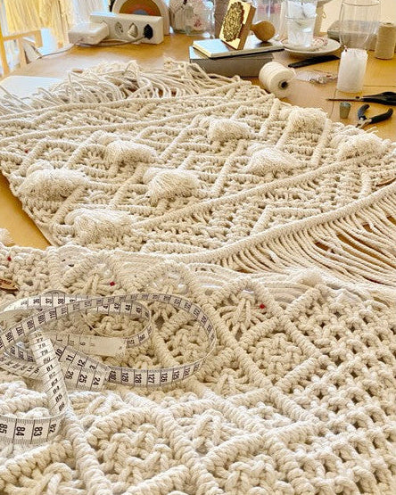 Handgefertigter Boho-Makramee-Kissenbezug. Der Kissenbezug besteht aus 100 % Baumwollseil.