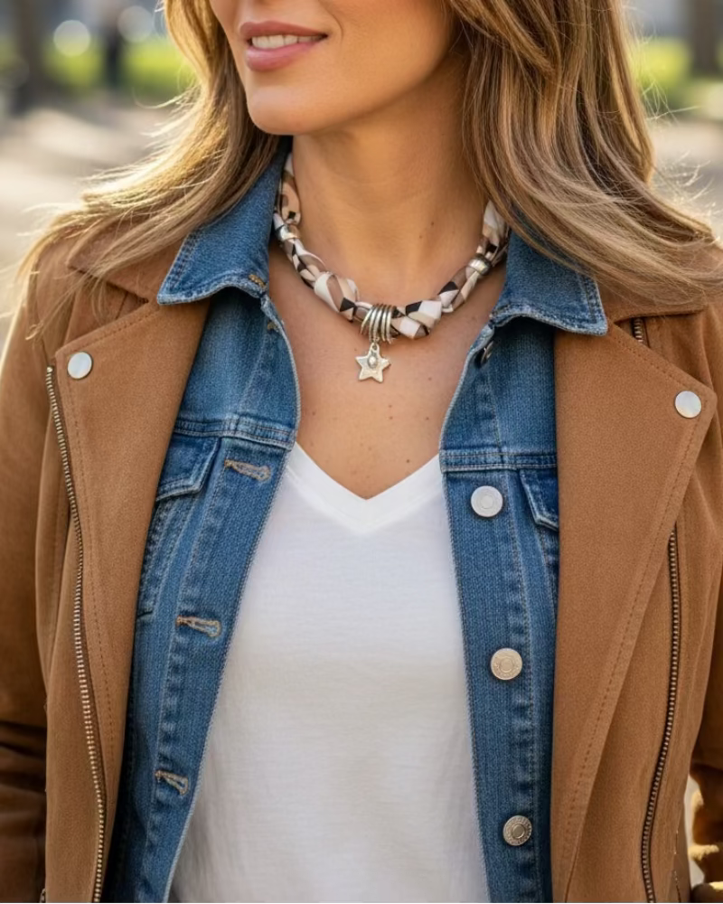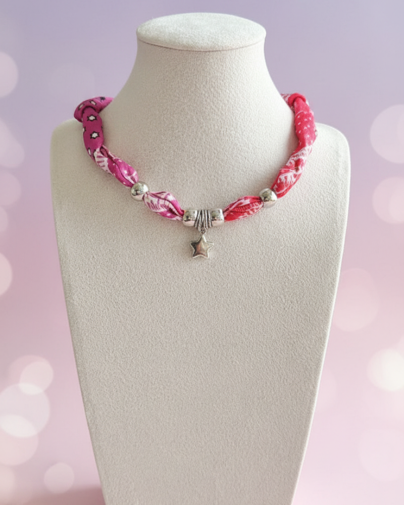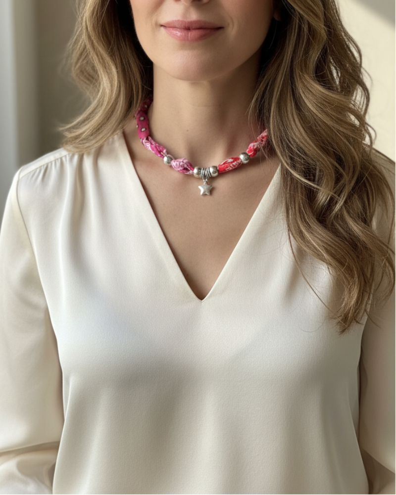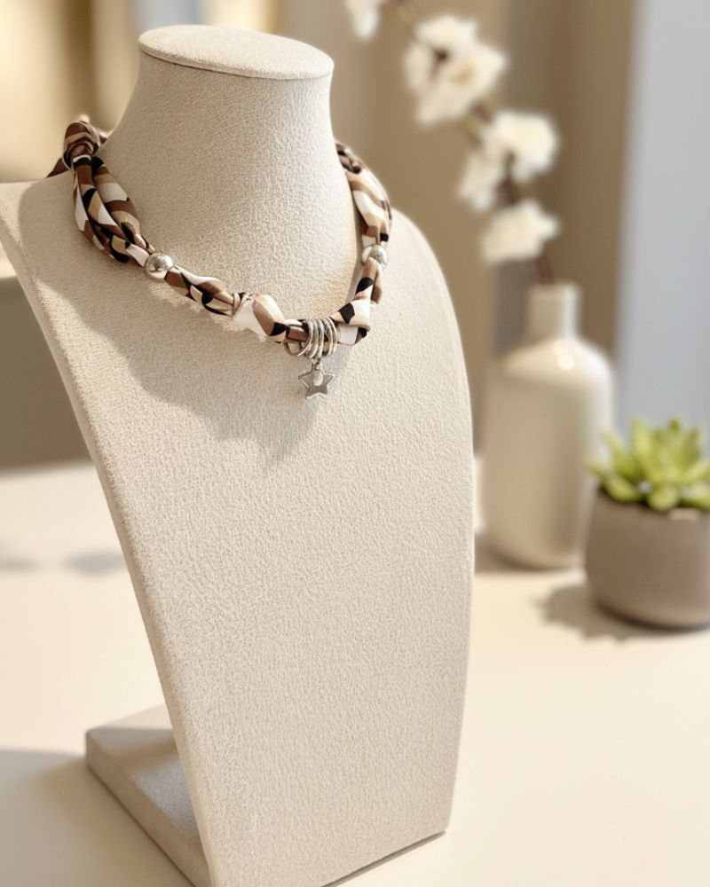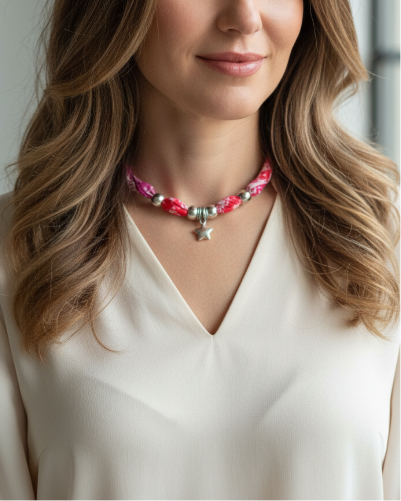 This necklace combines the softness of twisted fabric with the elegant shine of silver charms, creating a modern piece with lots of personality. It ties at the back with a knot.