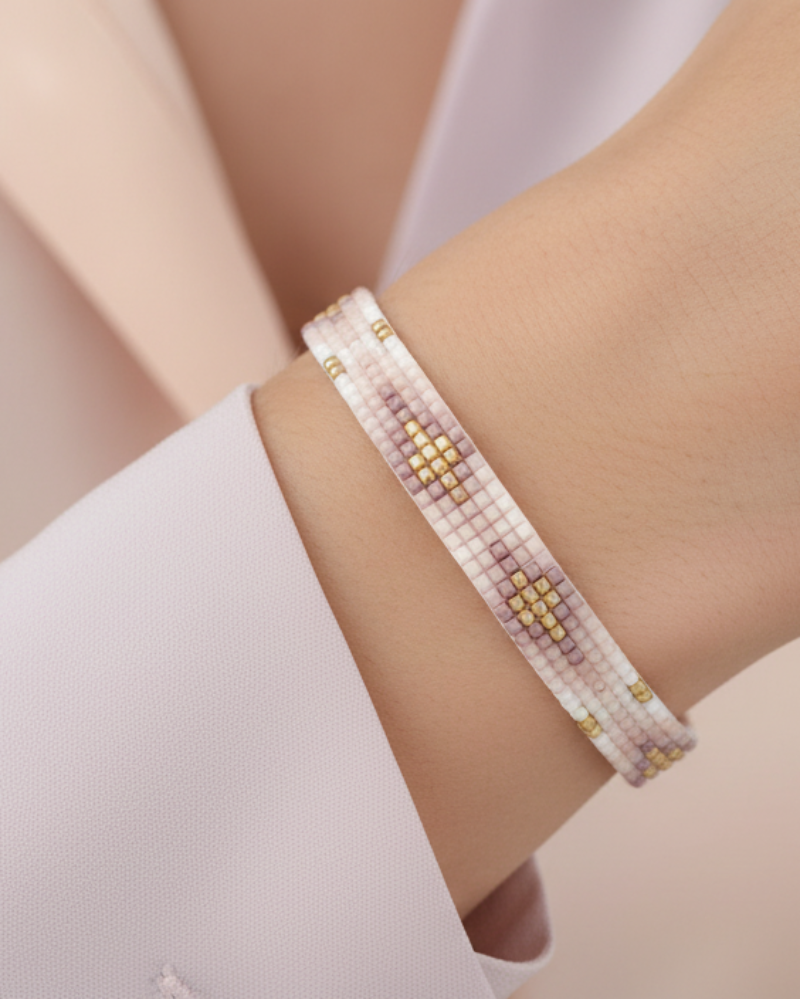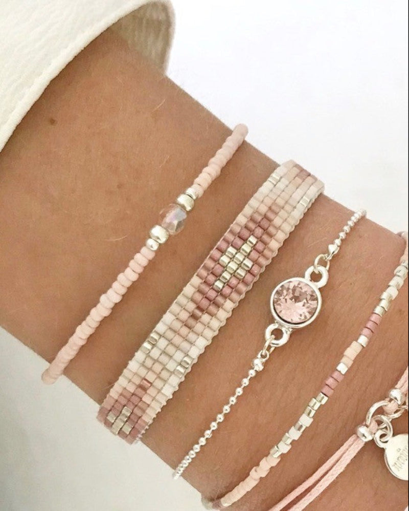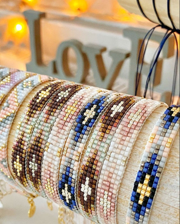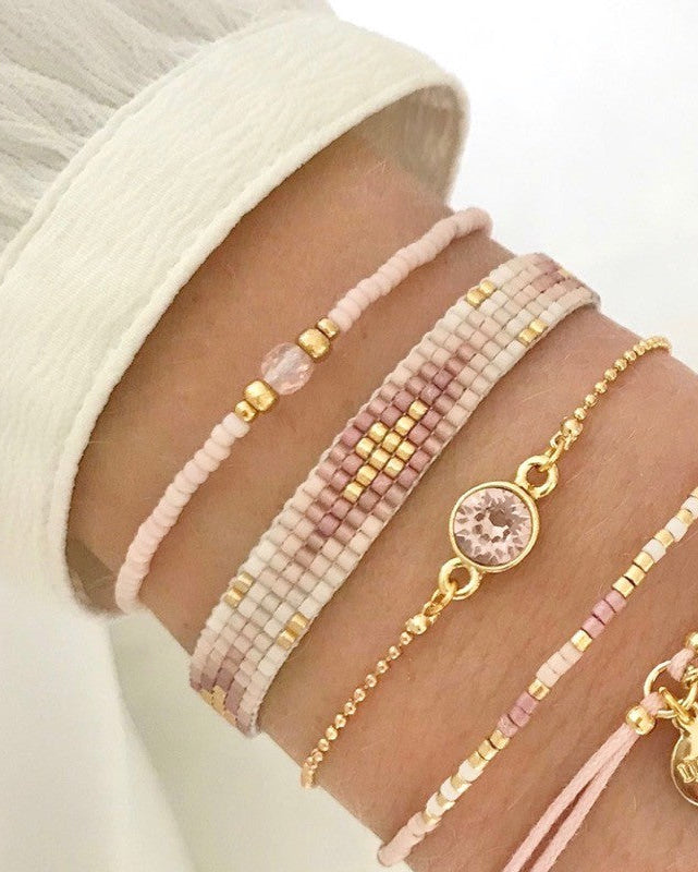 Woven bracelet of beautiful Miyuki beads. Each bracelet contains beautiful colours with a final touch of woven gold, silver and rose beads.