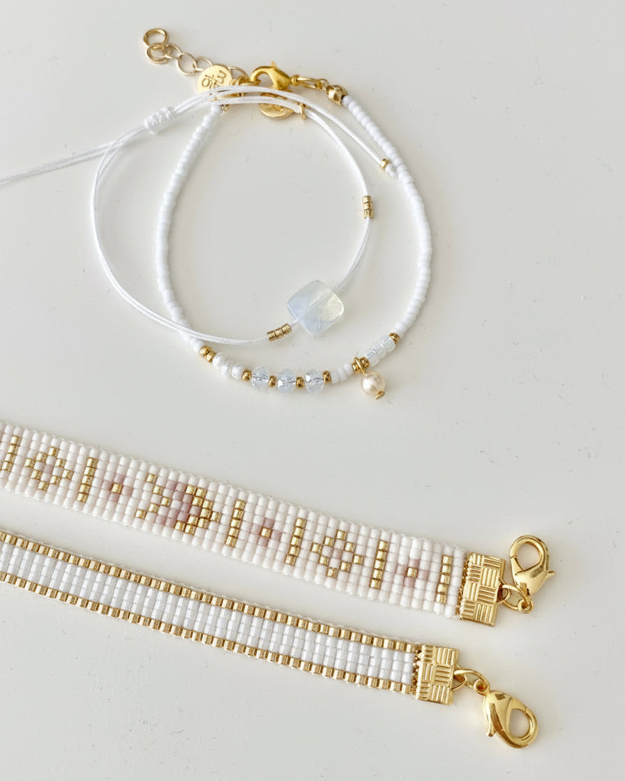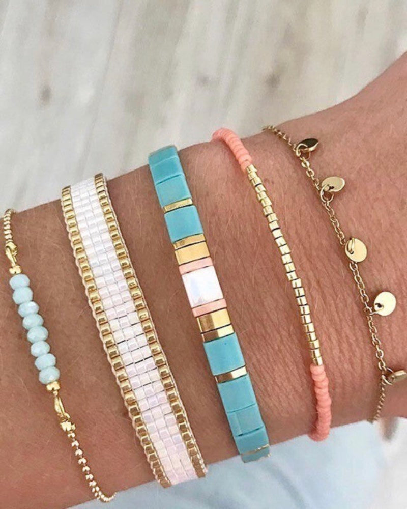 Woven bracelet of beautiful Miyuki beads. Each bracelet contains beautiful colours with a final touch of woven gold, silver and rose beads.