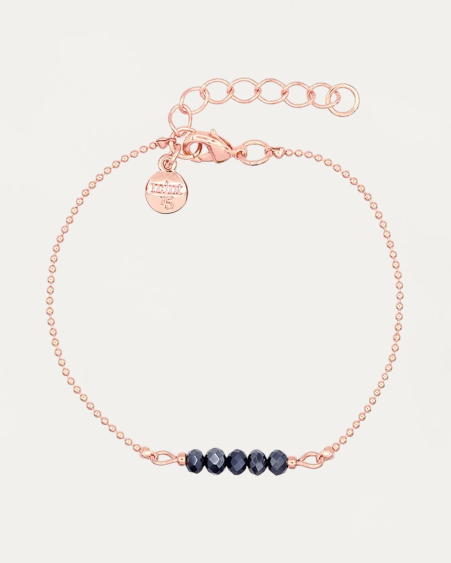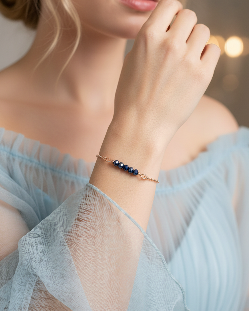 Beautiful bracelet of fine ball chain (1,2 mm) with in the middle 5 facet cut glass beads in a shiny blue color. Very subtle and wonderful to combine.