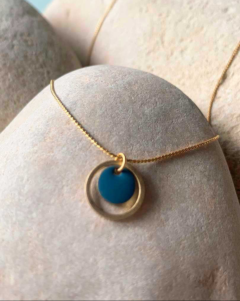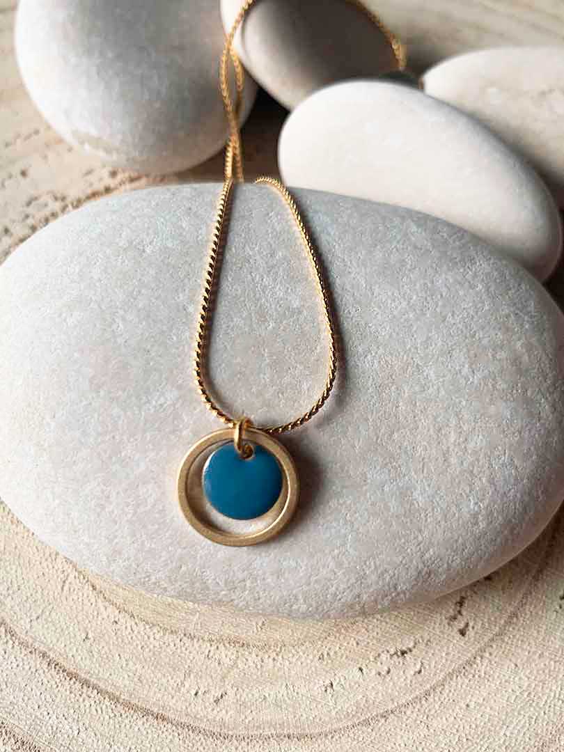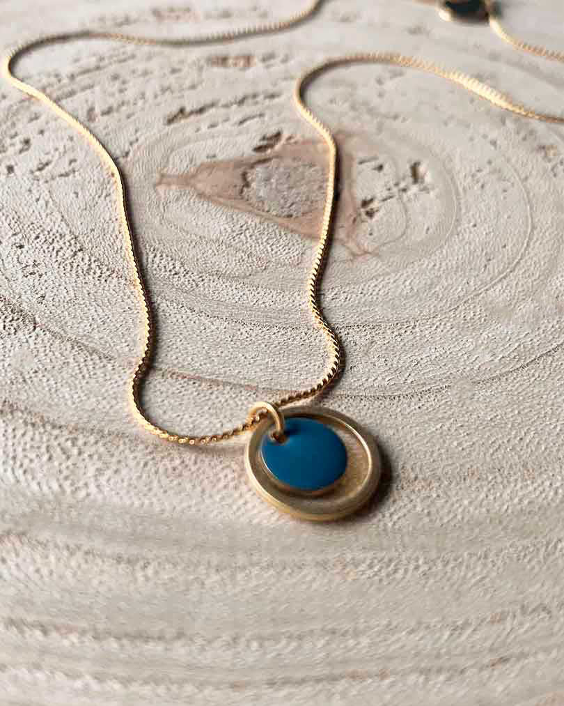 Gold plated brass and blue enamel. Necklace gold blue enameled sphere, with 11mm circle and 8mm blue enameled sphere with single 0.7mm gold plated chain with extension.