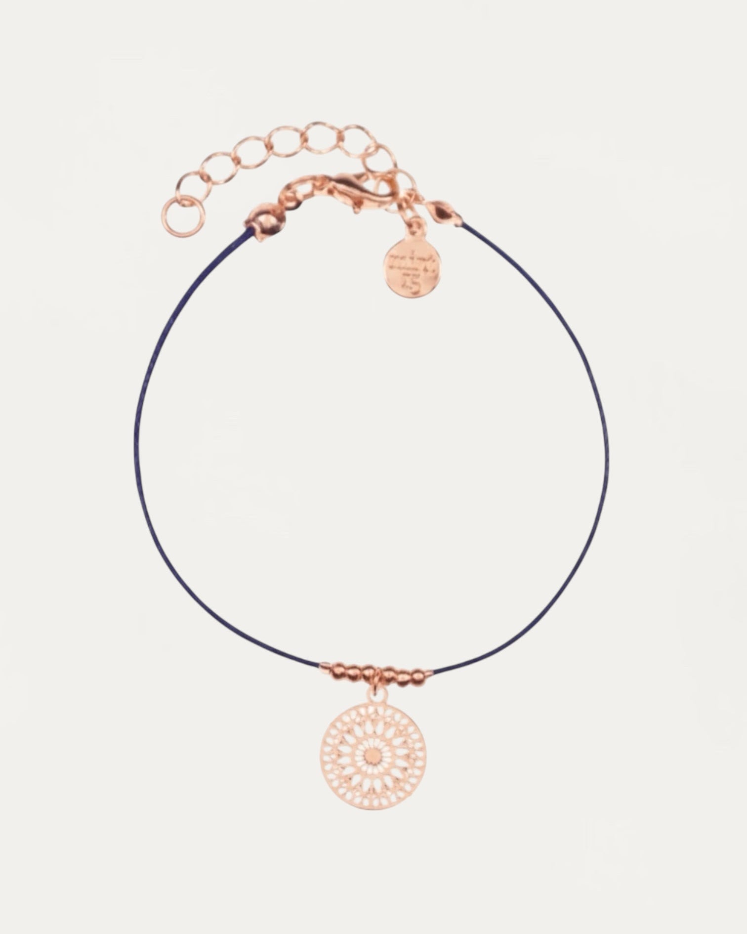 Pretty bracelet of rose gold beads in the center and a fine ornament made on a navy blue cord.