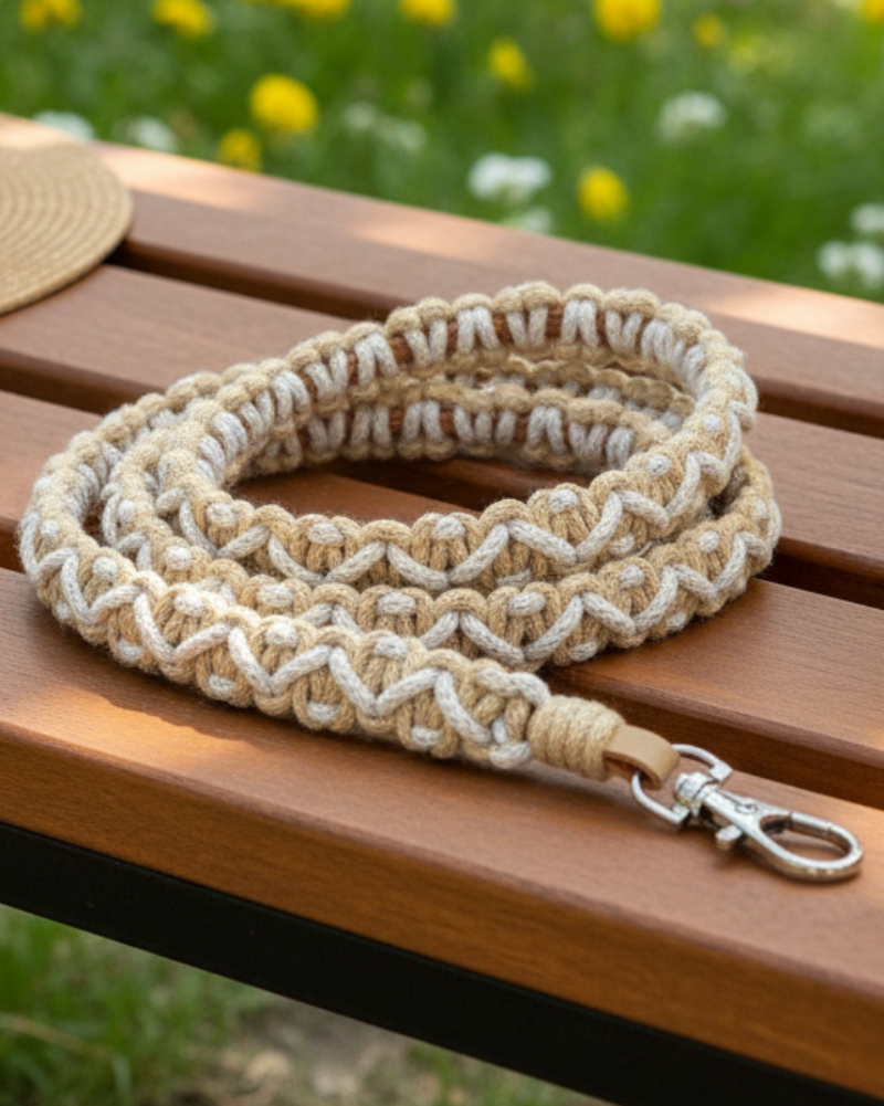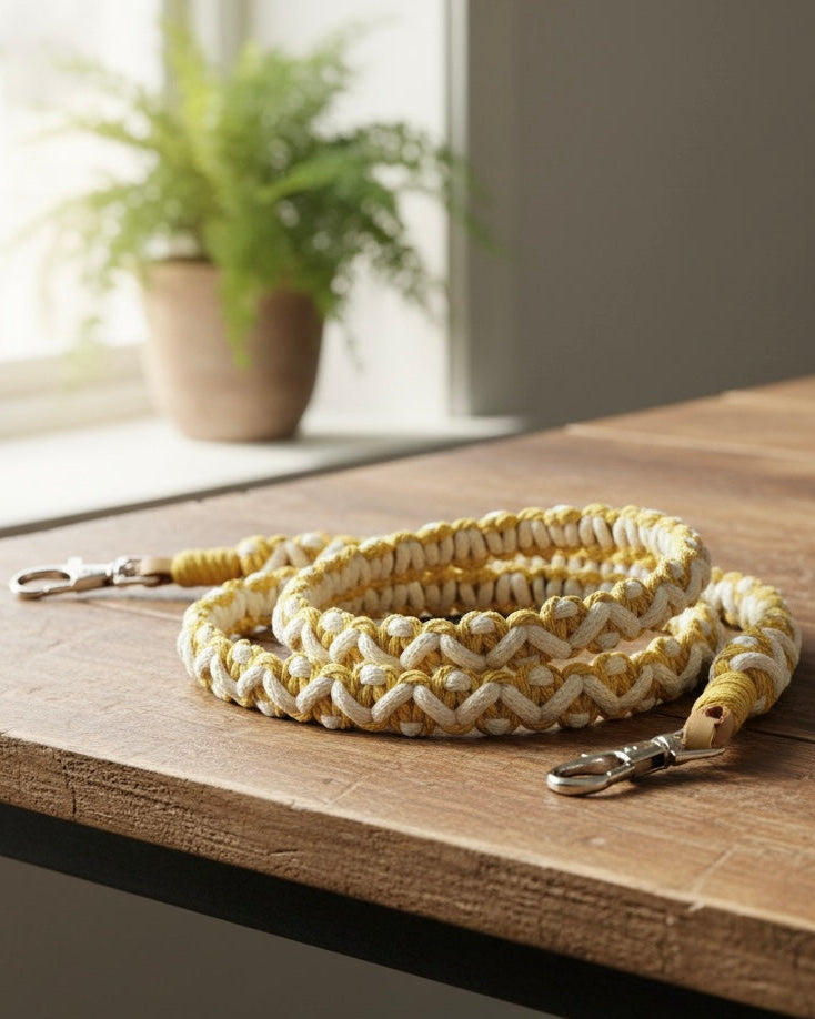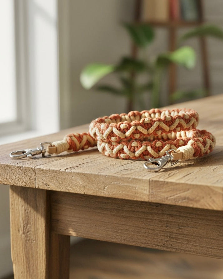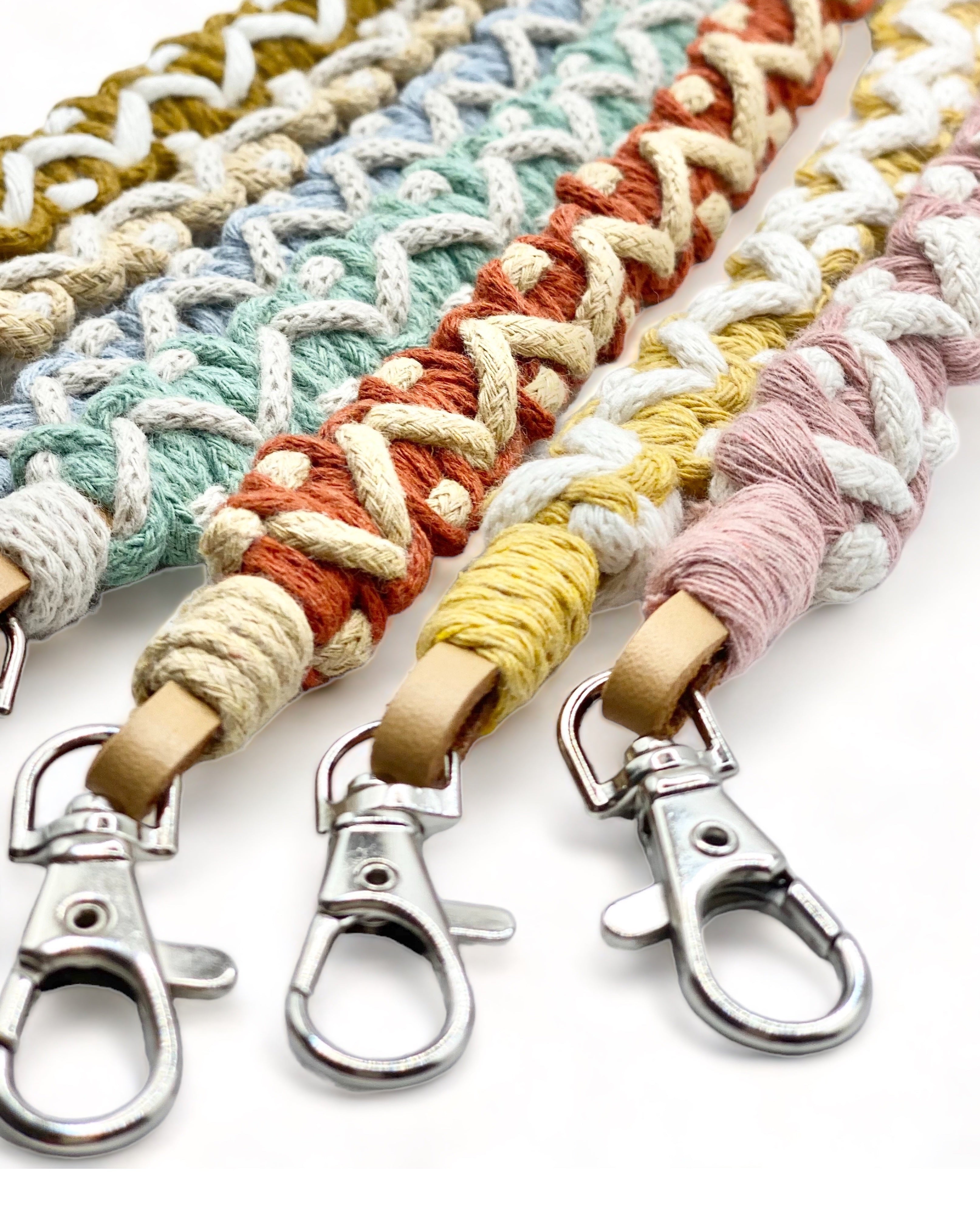 The base is made of leather woven in macrame with cotton cord combining different colors.