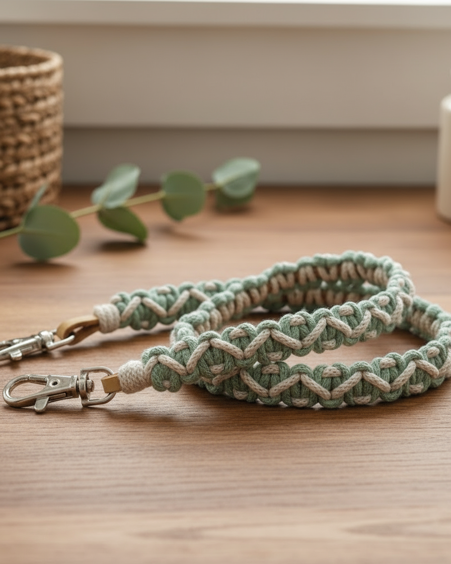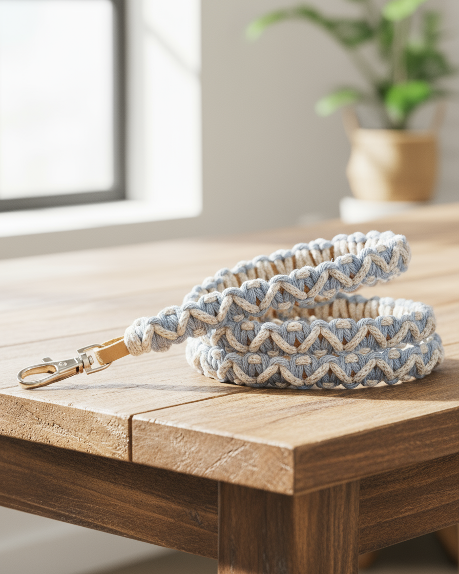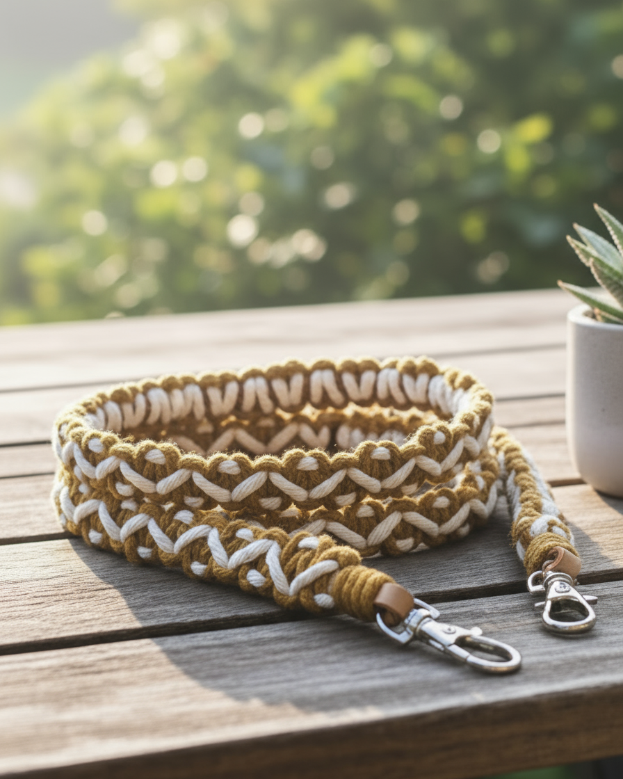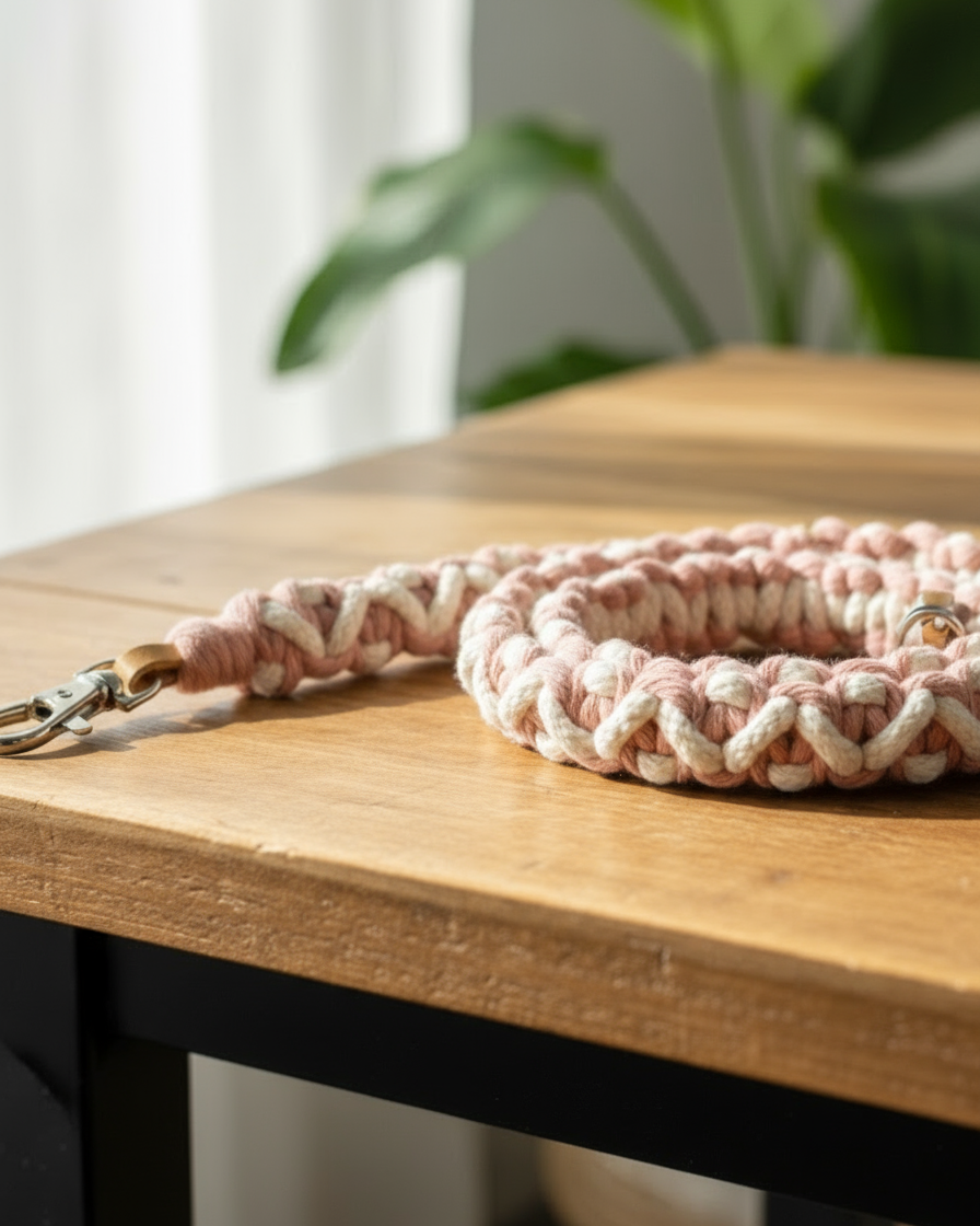 The base is made of leather woven in macrame with cotton cord combining different colors.