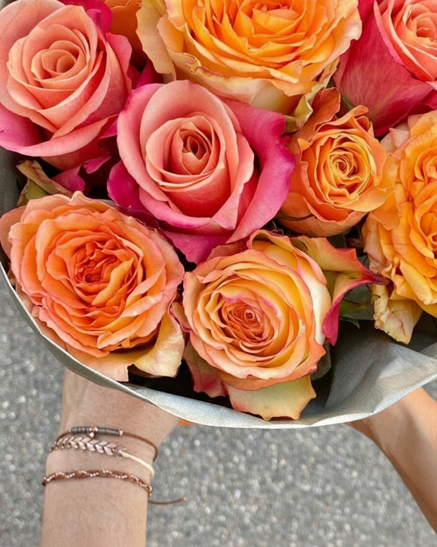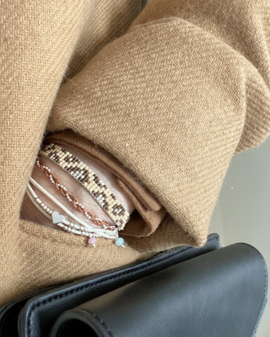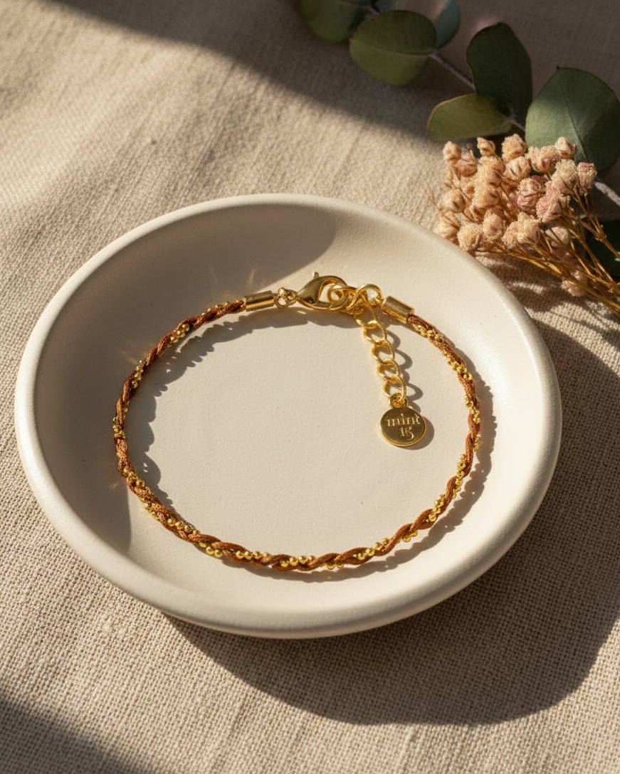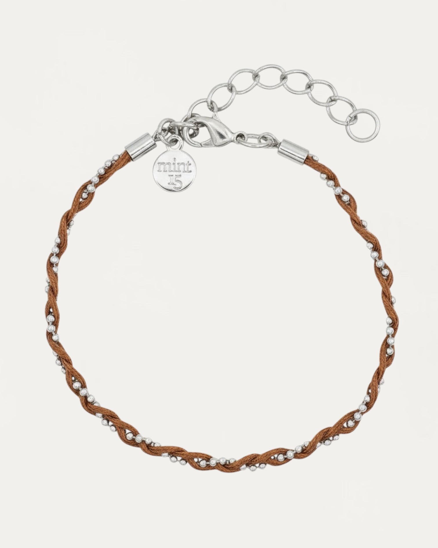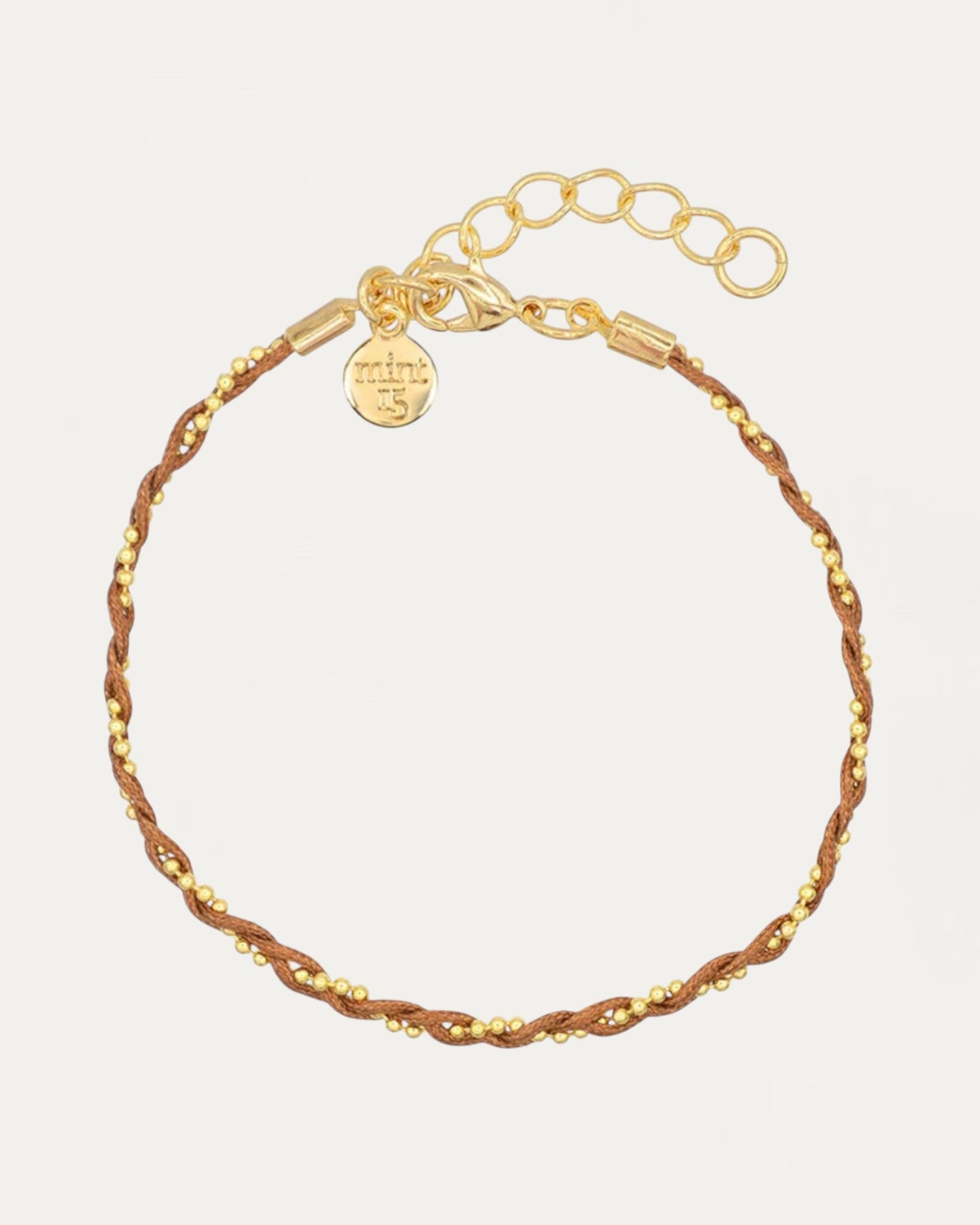 Braided bracelet with copper brown cord and fine ball chain. You can easily combine this bracelet with other summer bracelets.