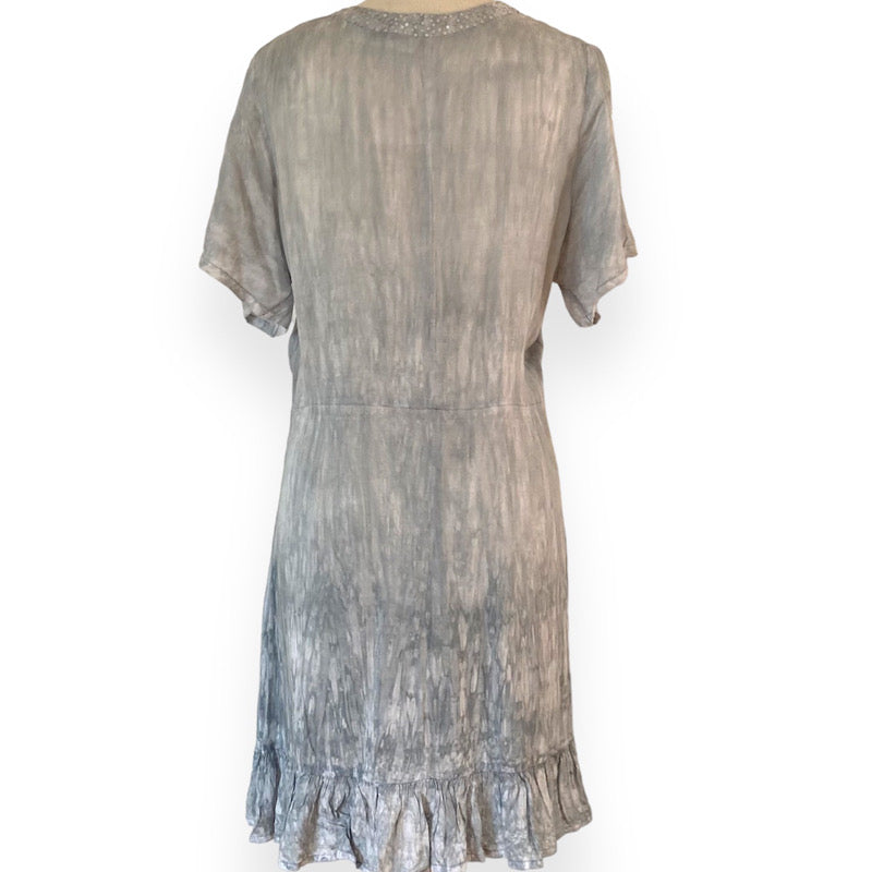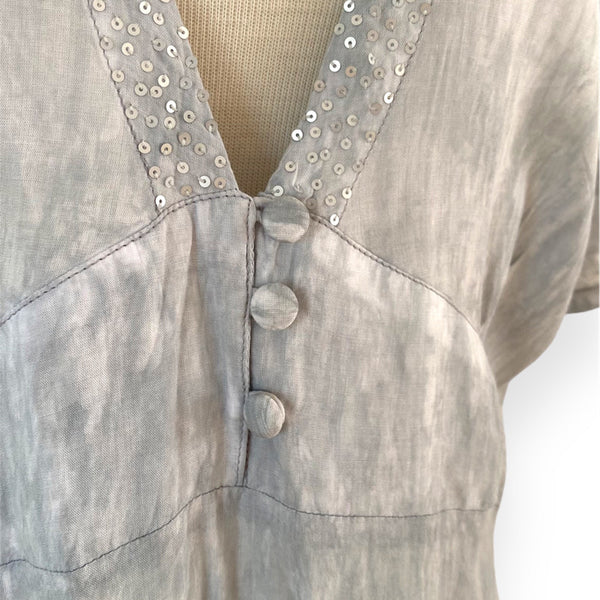 The most essential mini-dress for any special occasion, it features precious small sequin details on the neckline, loose-fitting sleeves and a defined waist to enhance the silhouette. It has a deep V-neckline.