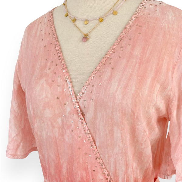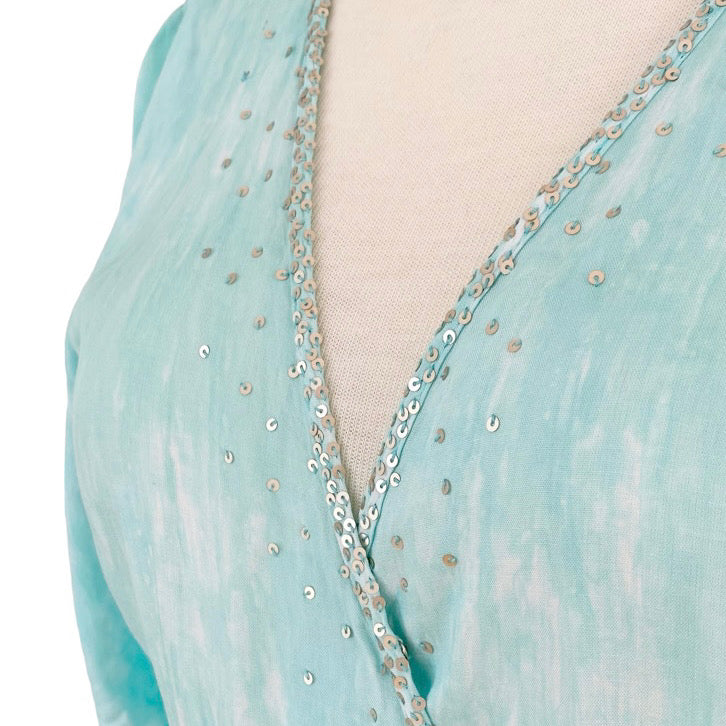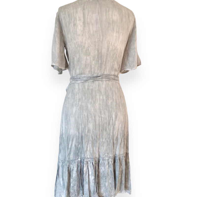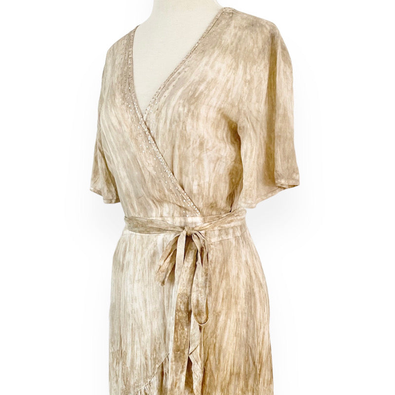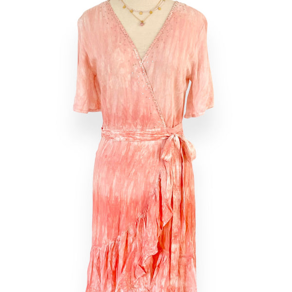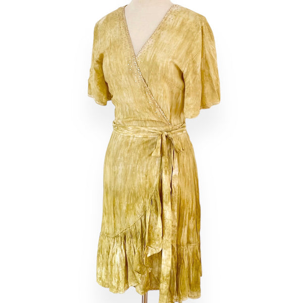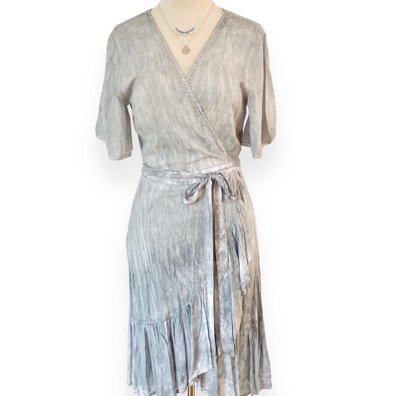 So fun and timelessly designed in a wrap style, this lovely dress features a scoop neck, short sleeves and front bow closure embellished with tiny sequins for added feminine flair. The crossover design ties with a wrap bow to create a fitted silhouette at the waist.