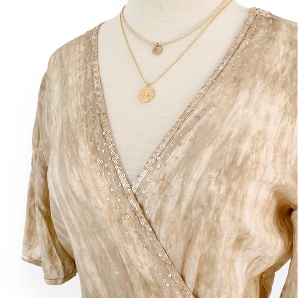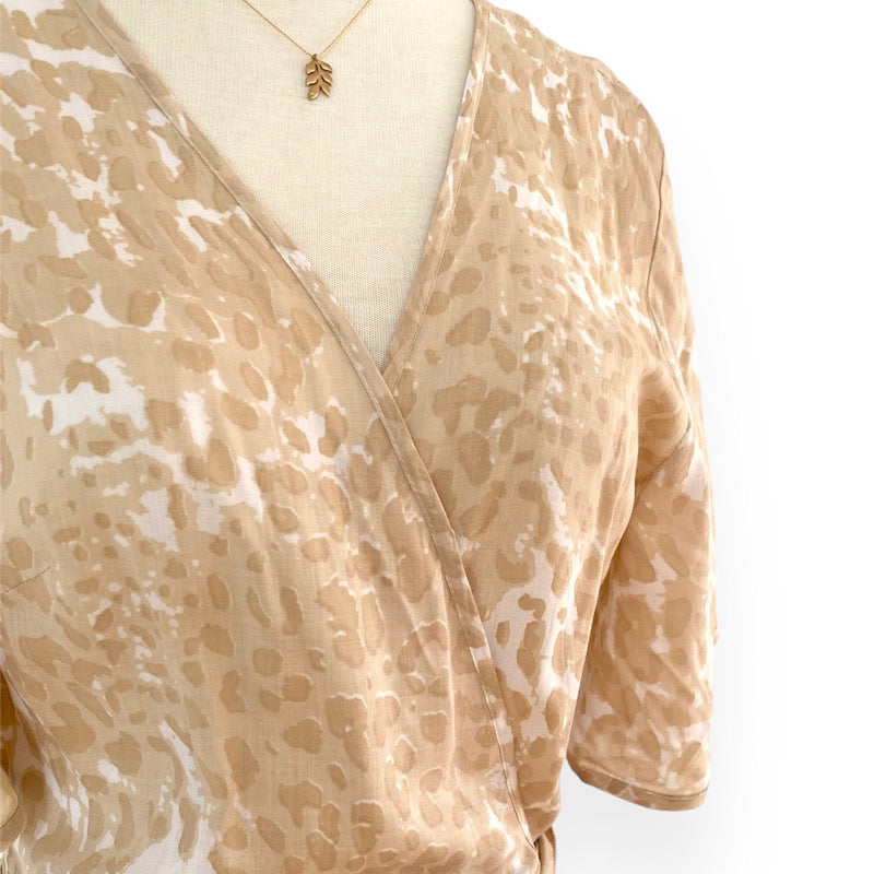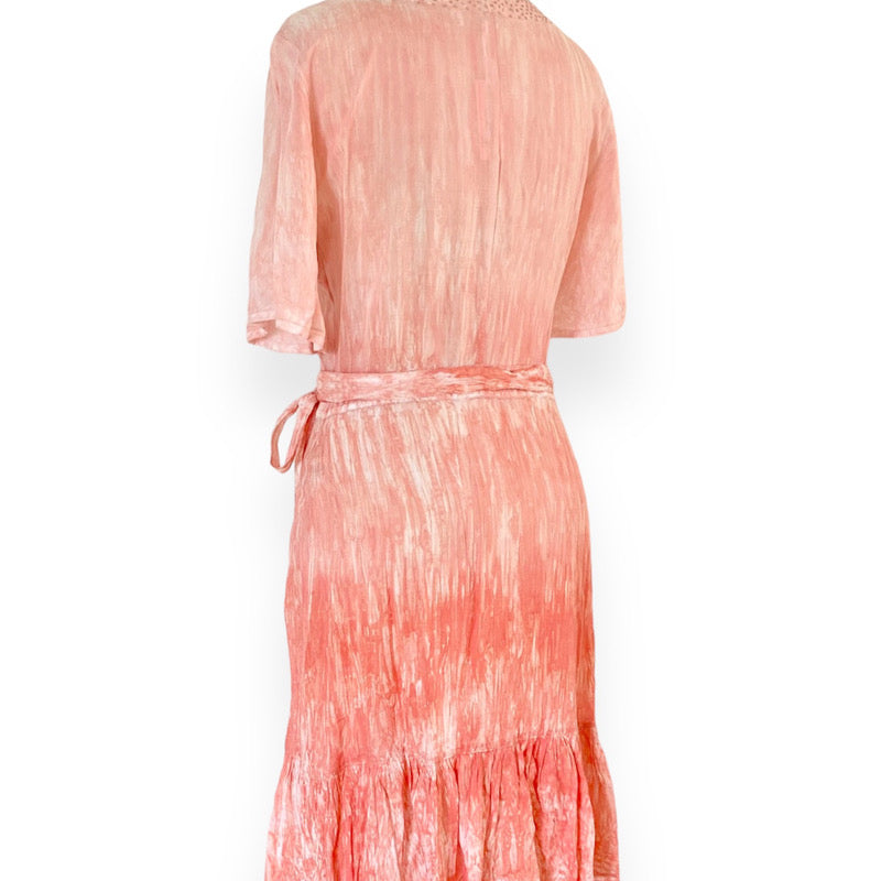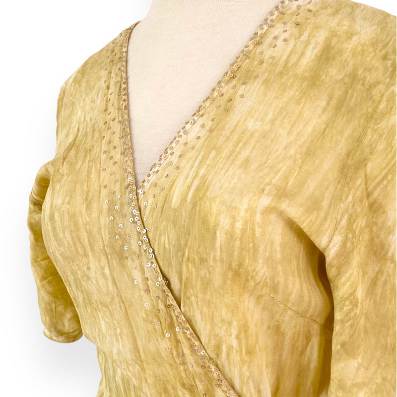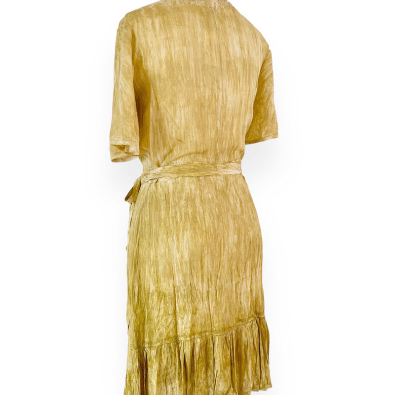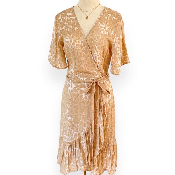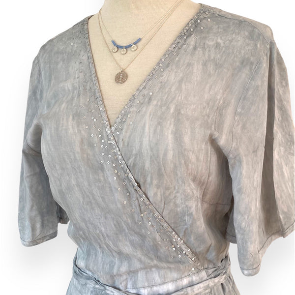 So fun and timelessly designed in a wrap style, this lovely dress features a scoop neck, short sleeves and front bow closure embellished with tiny sequins for added feminine flair. The crossover design ties with a wrap bow to create a fitted silhouette at the waist.
