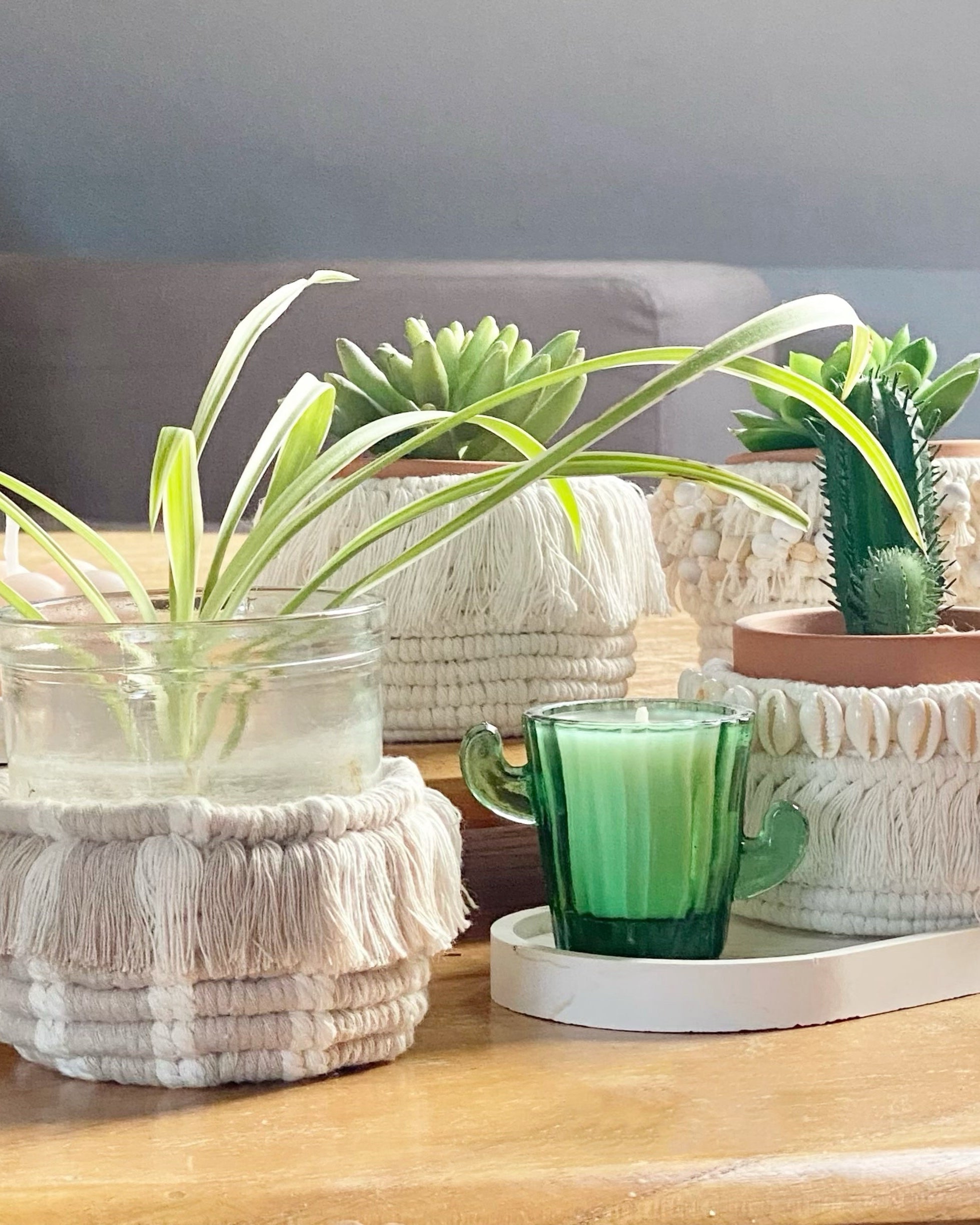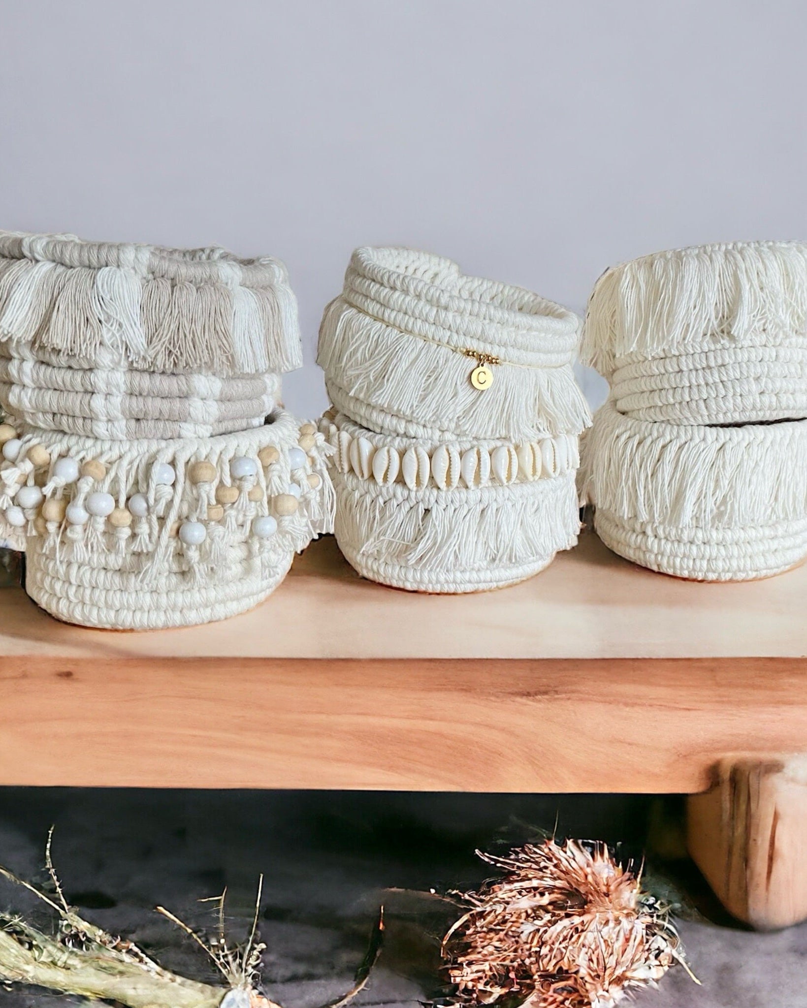 These macramé baskets are handmade by Muak with cotton rope and white/natural wooden beads or natural snails. When you buy one of these products, you always have an original in your hand. Each piece is unique. Choose the design you like!