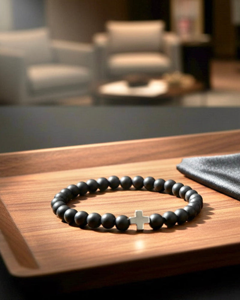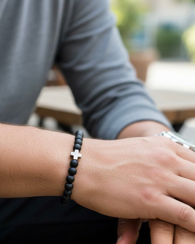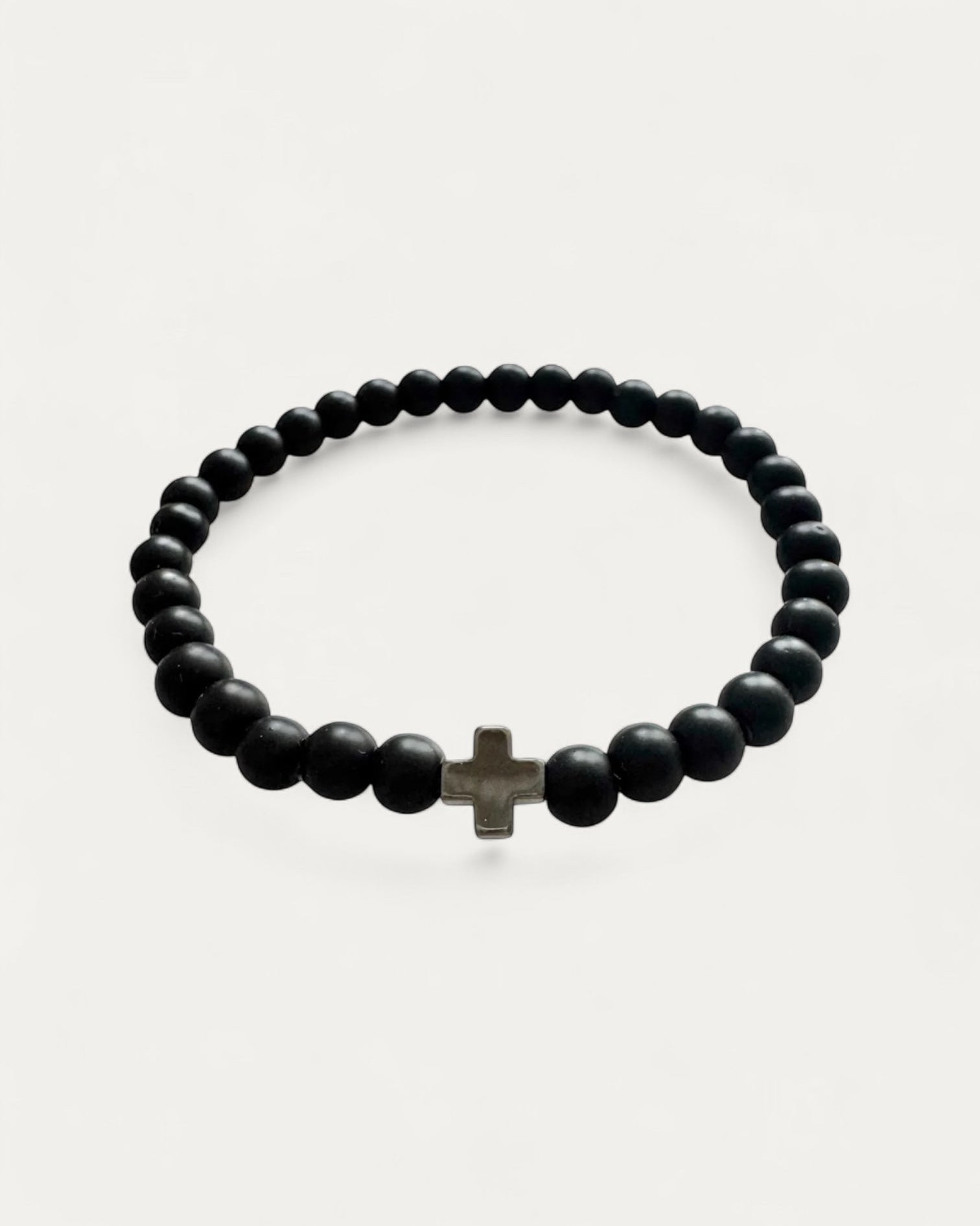 Elastic bracelet for men, handmade with matte black stone beads and a cross-shaped pendant. Minimalist design for casual outfits.