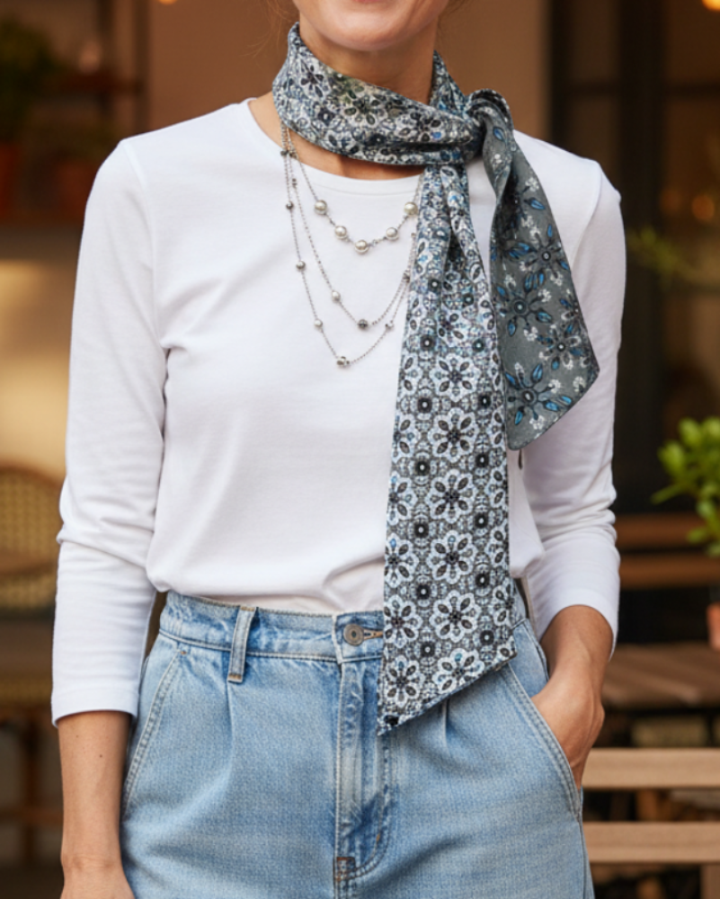 Its luxurious silk texture offers a lightweight feel and elegant drape, making it a sophisticated accessory for any wardrobe.