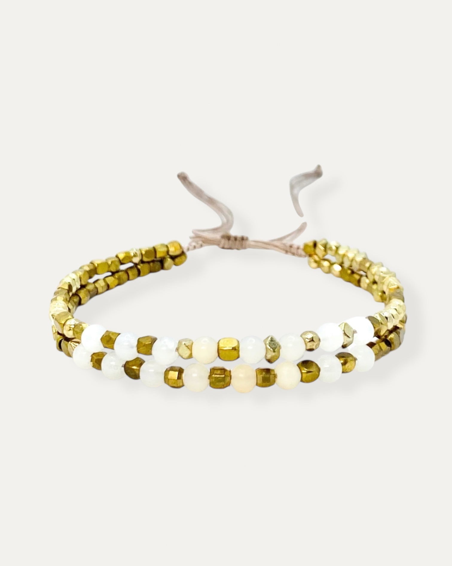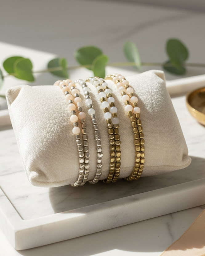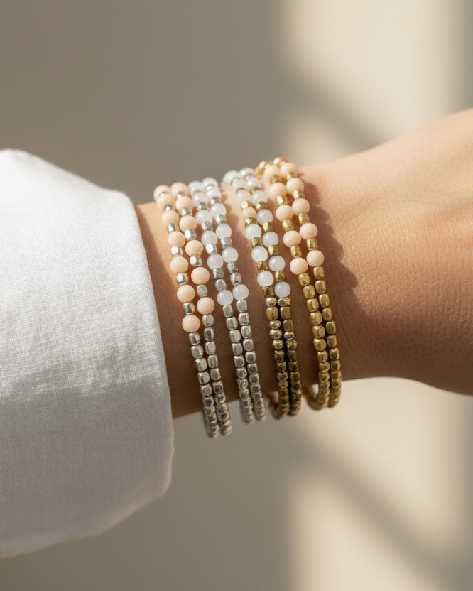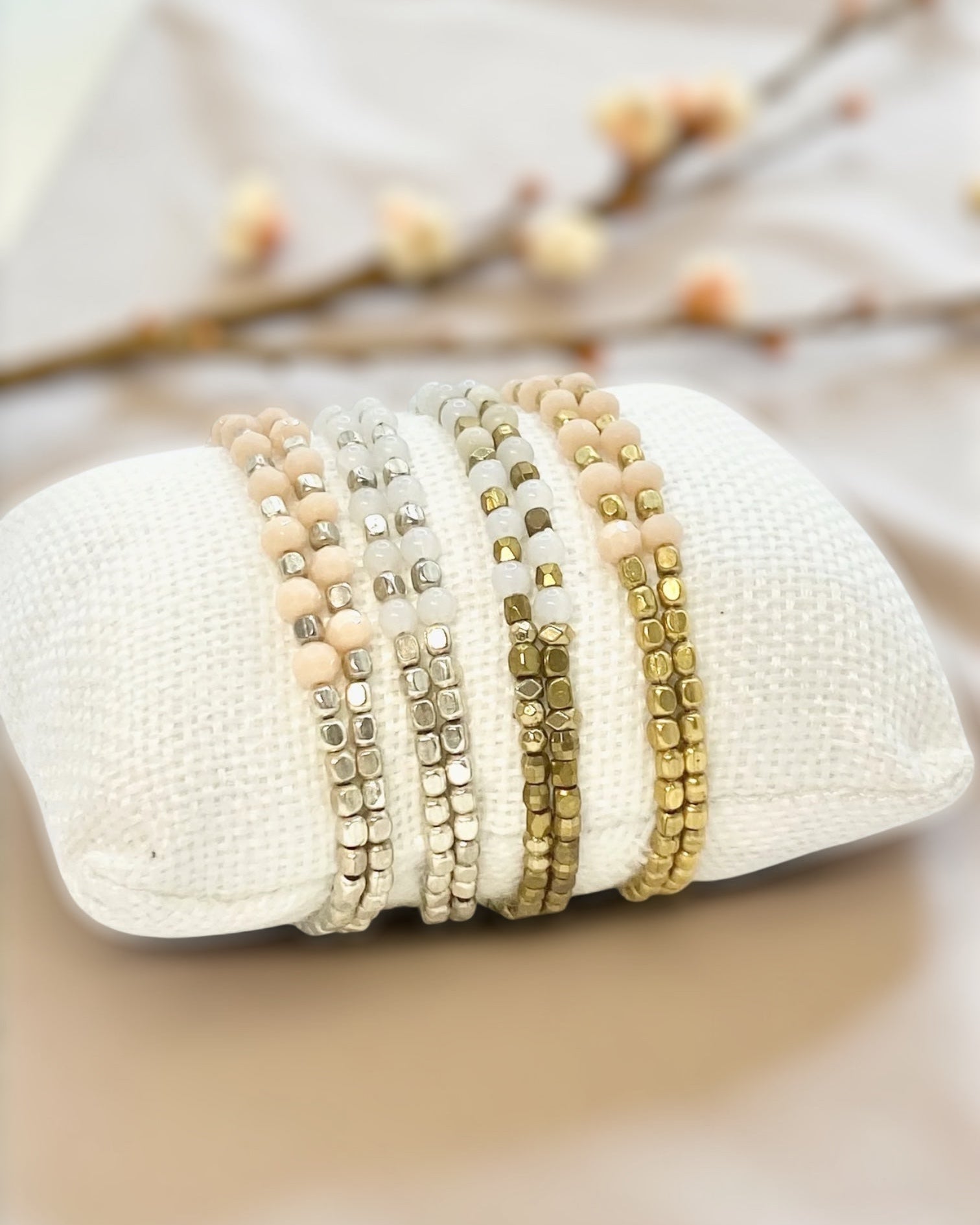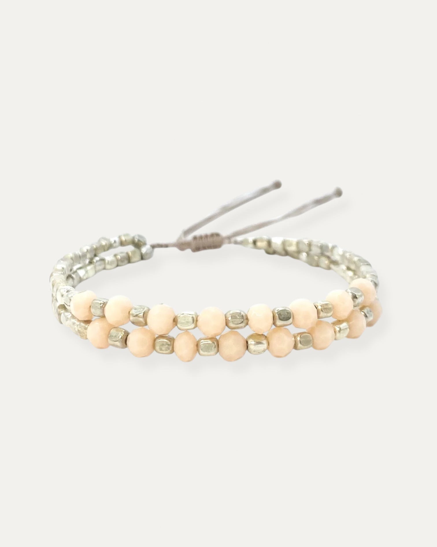Double bracelet of small beads, combined with other silver-plated beads and delicate cord. It will fit comfortably on your wrist.