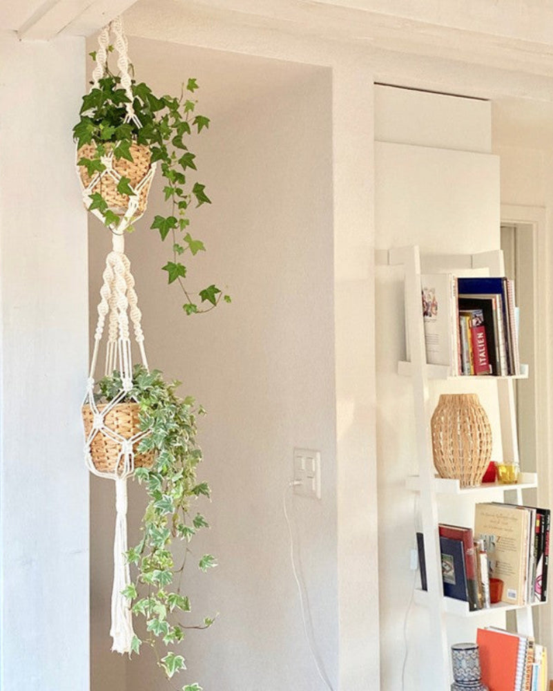 Handmade plant hanger made with 100% natural cotton cord, for two plant pots.
