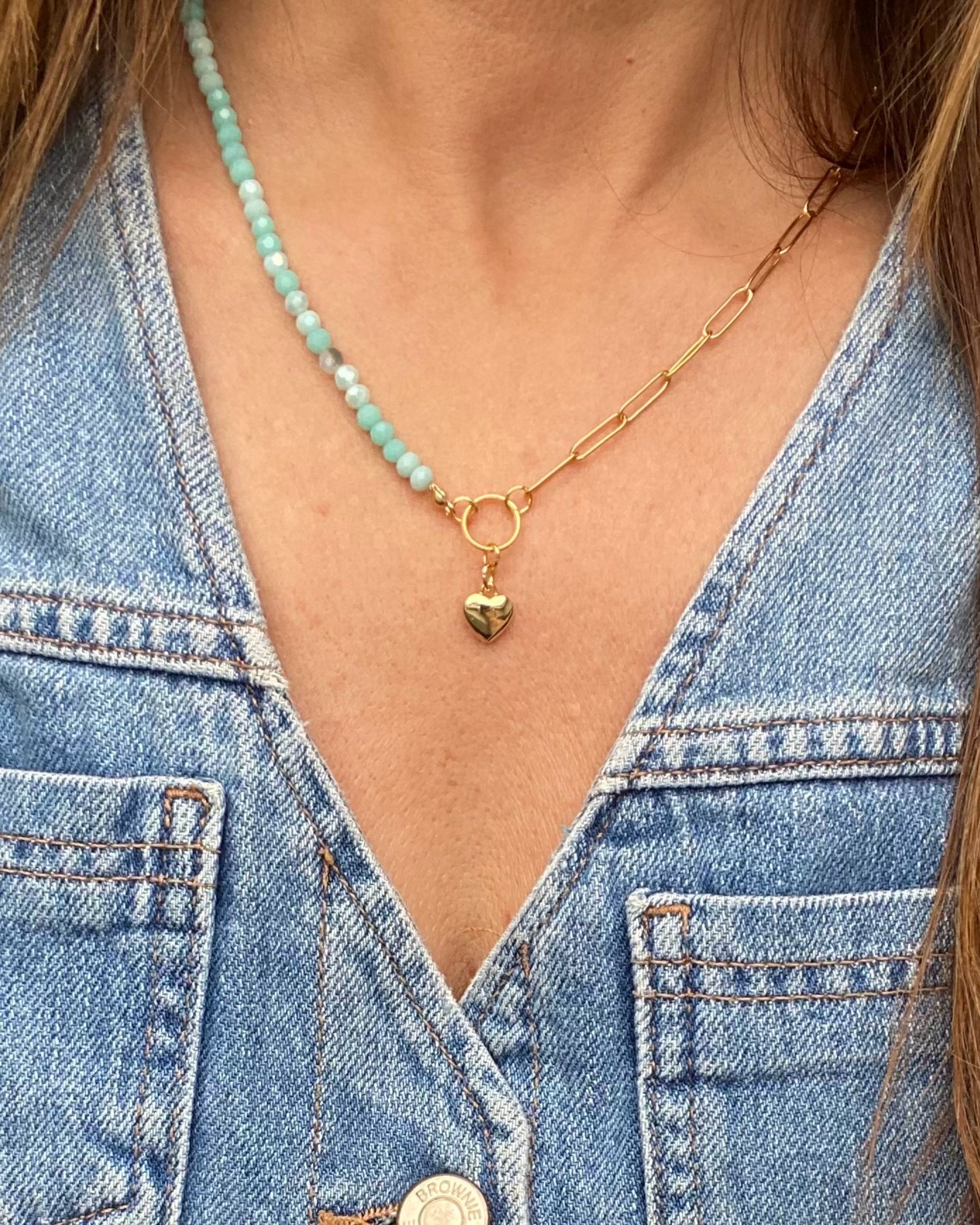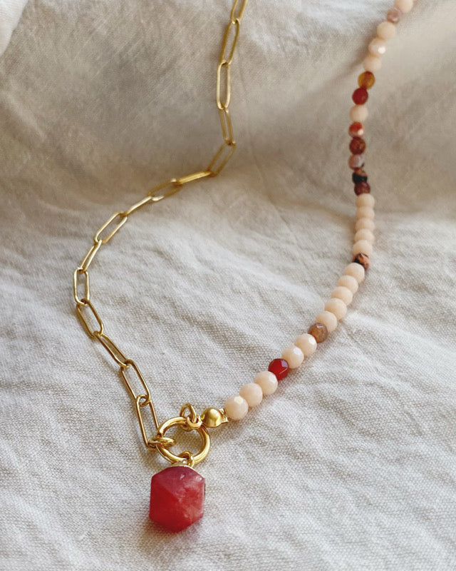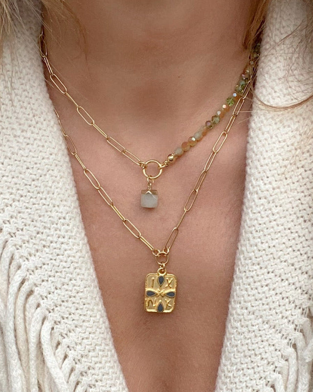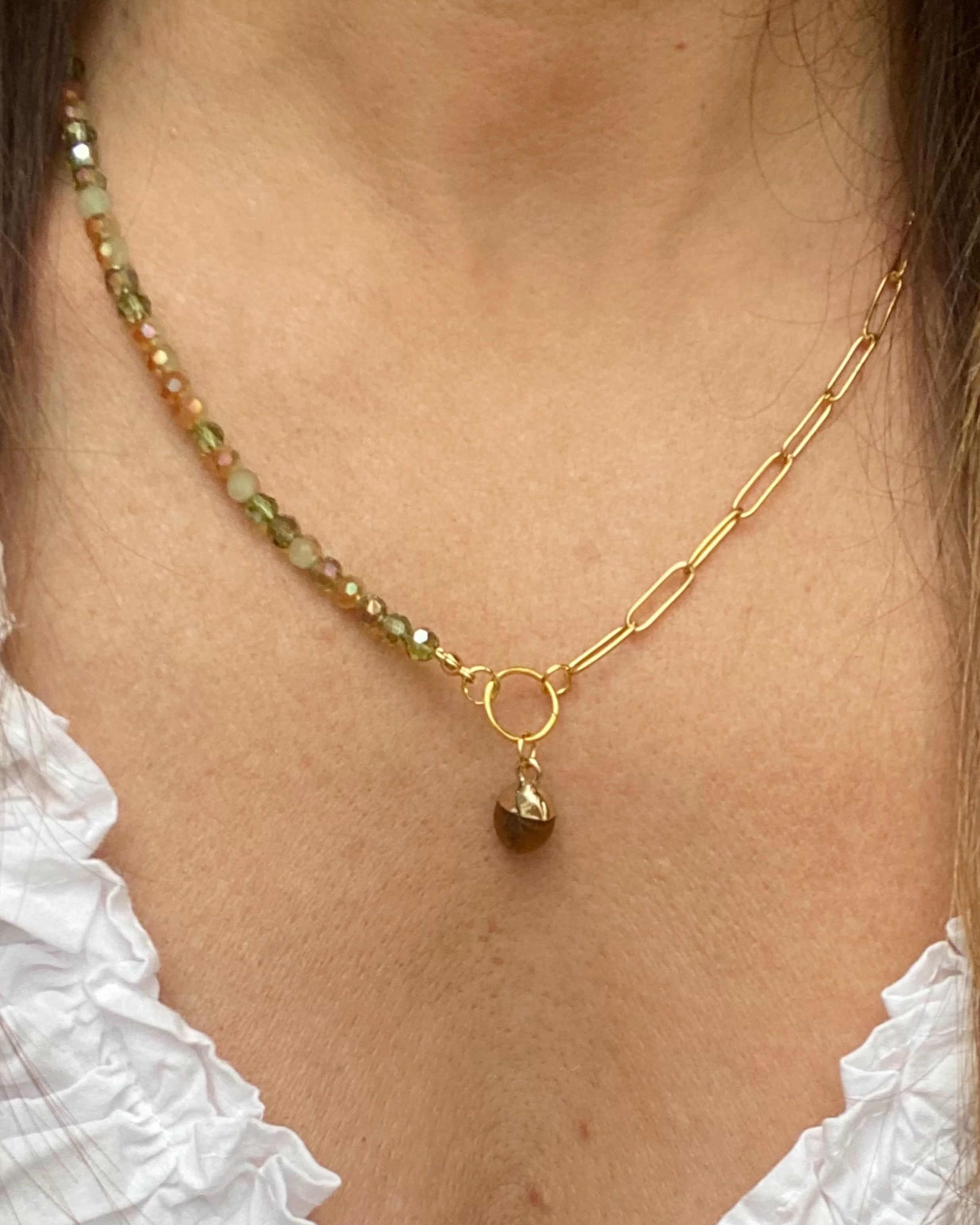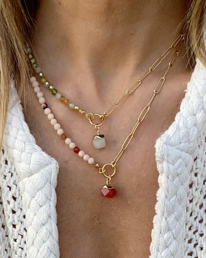 We used a gold plated stainless steel chain and facetted glass beads, combining different tones. In the center of the necklace, we hang a gemstone that matches perfectly with the tone of each necklace.