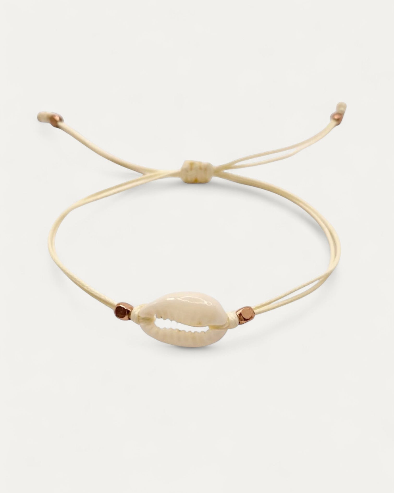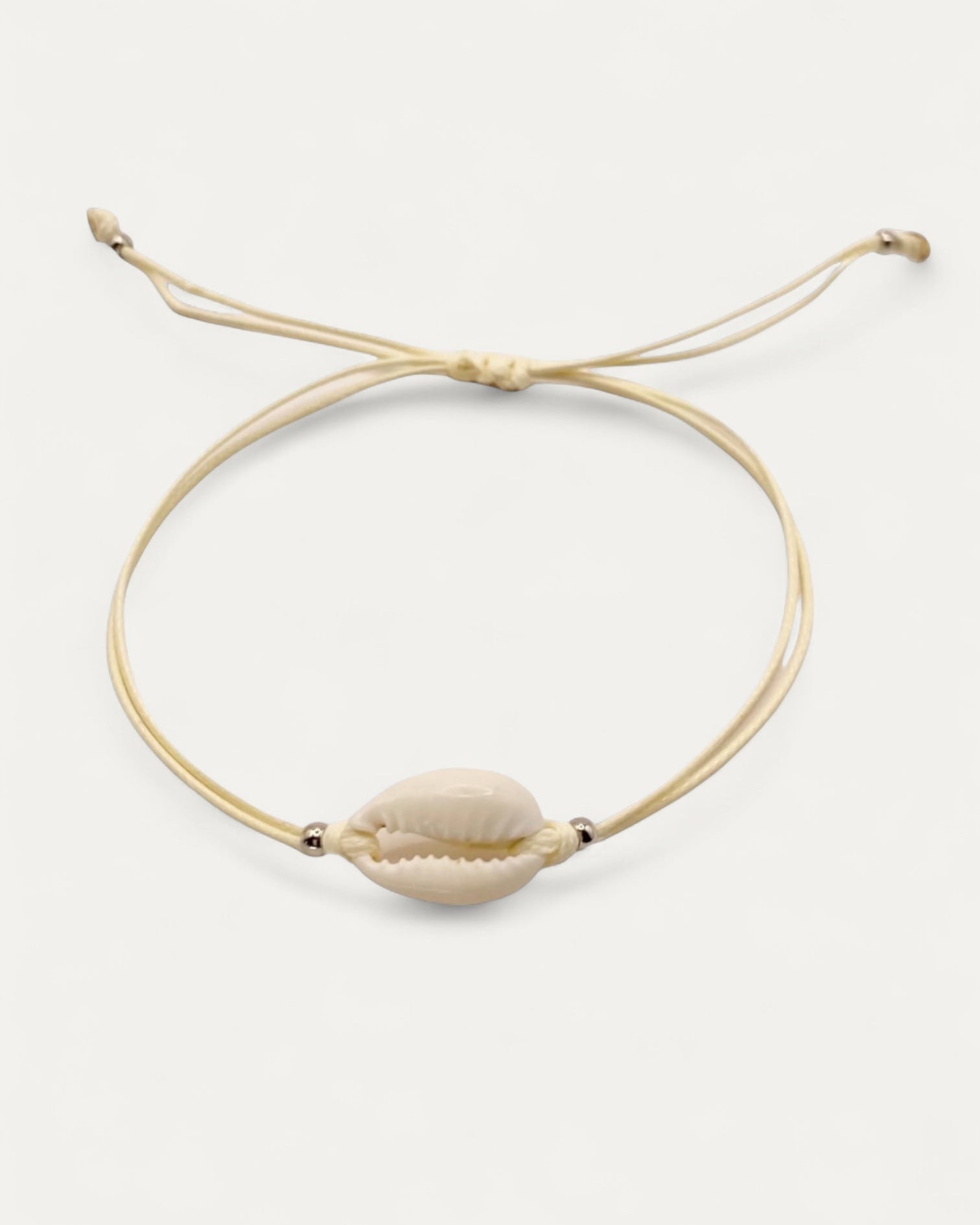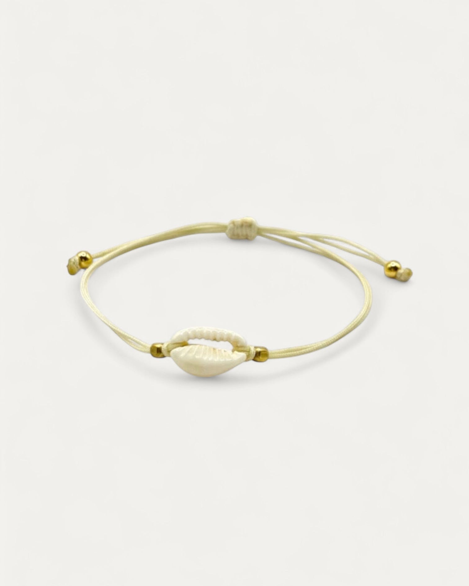 This handmade bracelet is made of strong nylon thread and adorned with natural shells and golden or silver-plated pearls.