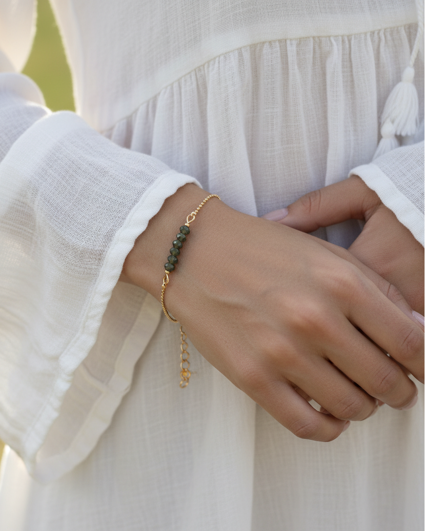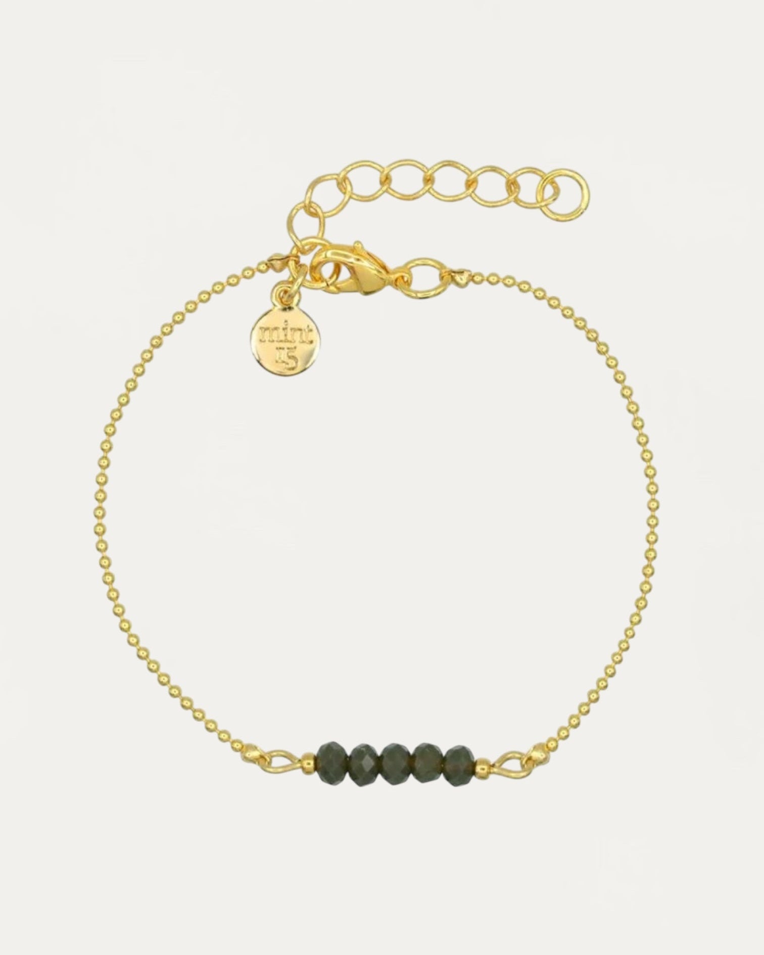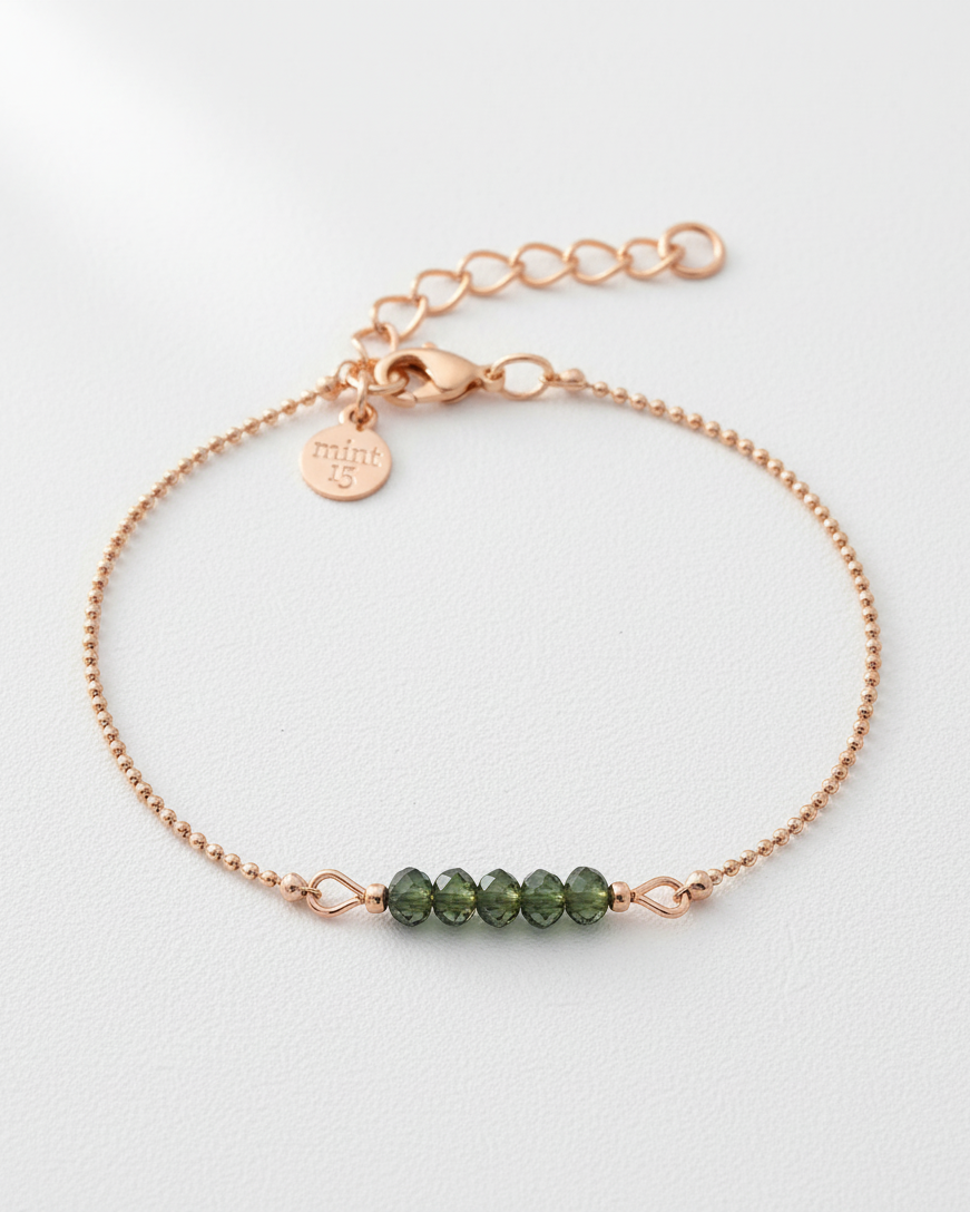 Beautiful bracelet of fine ball chain (1,2 mm) with in the middle 5 facets cut glass beads in a shiny mint green color. Very subtle and wonderful to combine.