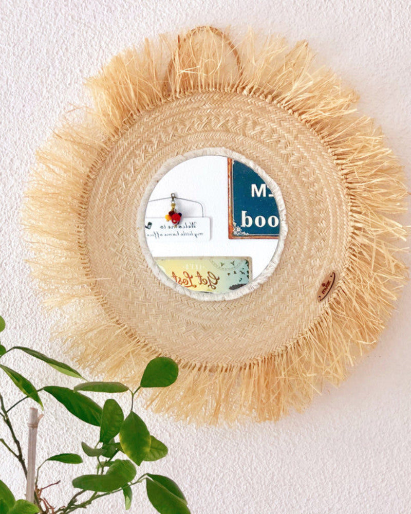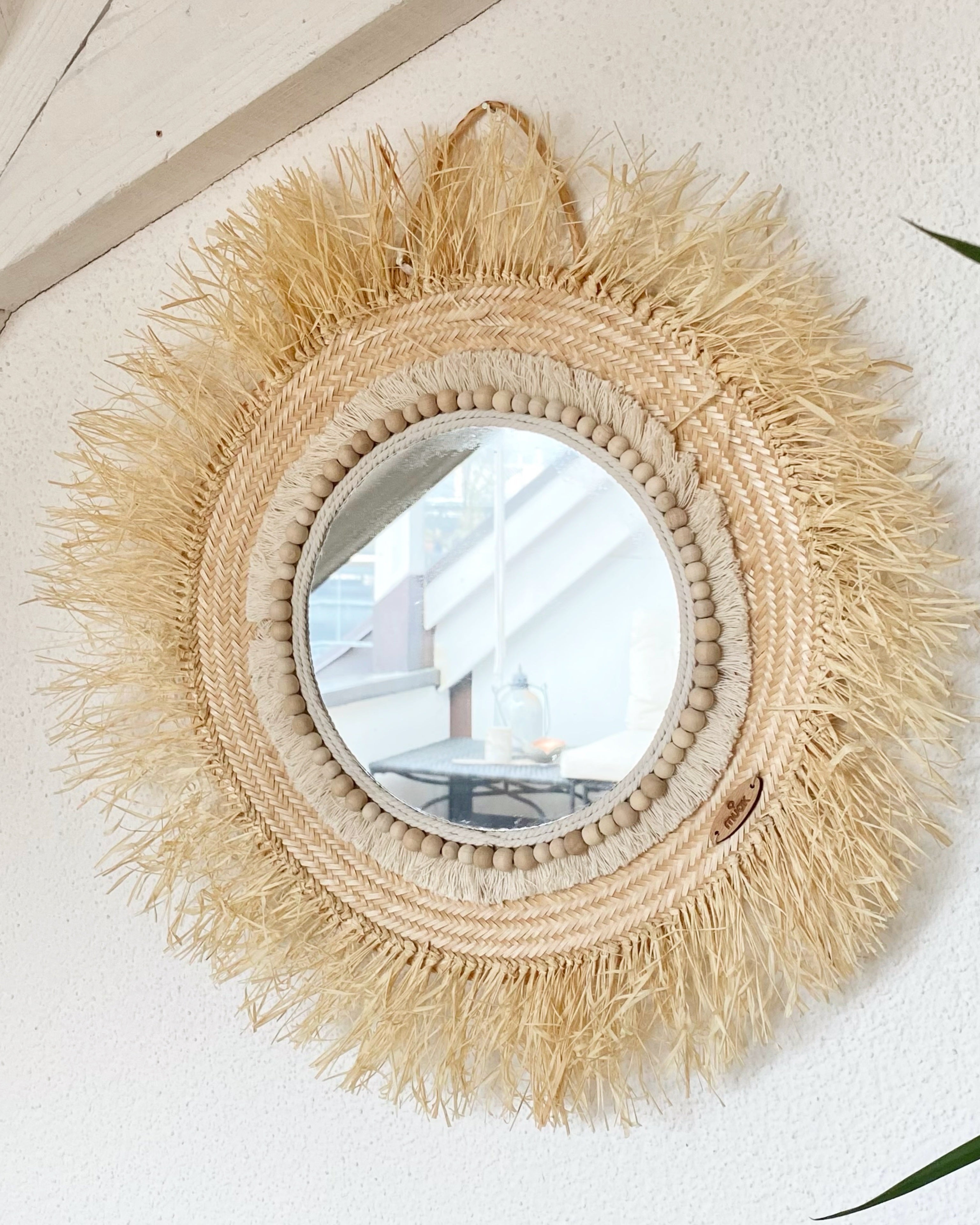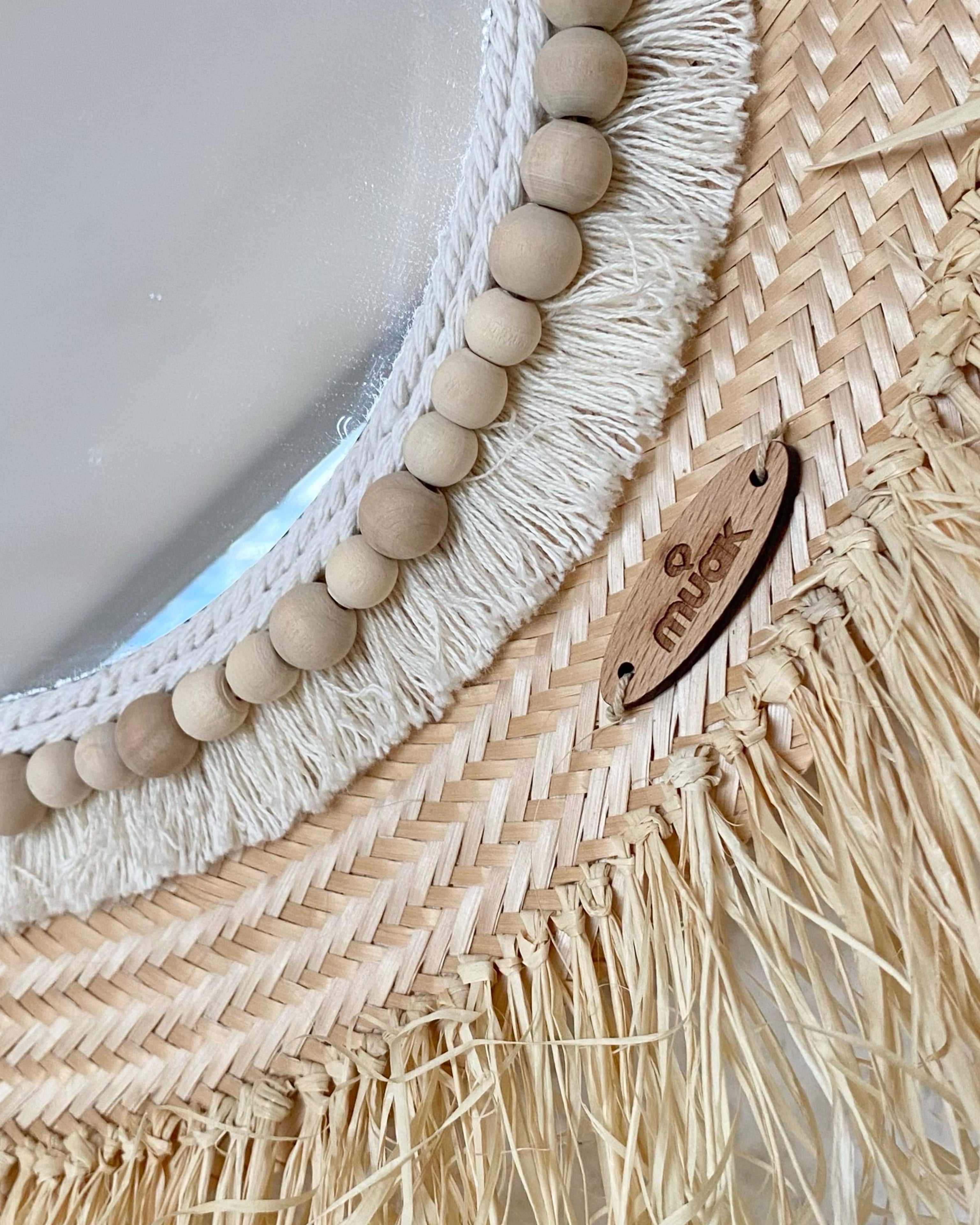 These mirrors are handmade with palm leaves, by the indigenous Wayuu of Venezuela. The raffia fringes, wood beads and mirror are added by Muak. It is a 100% handmade work.
