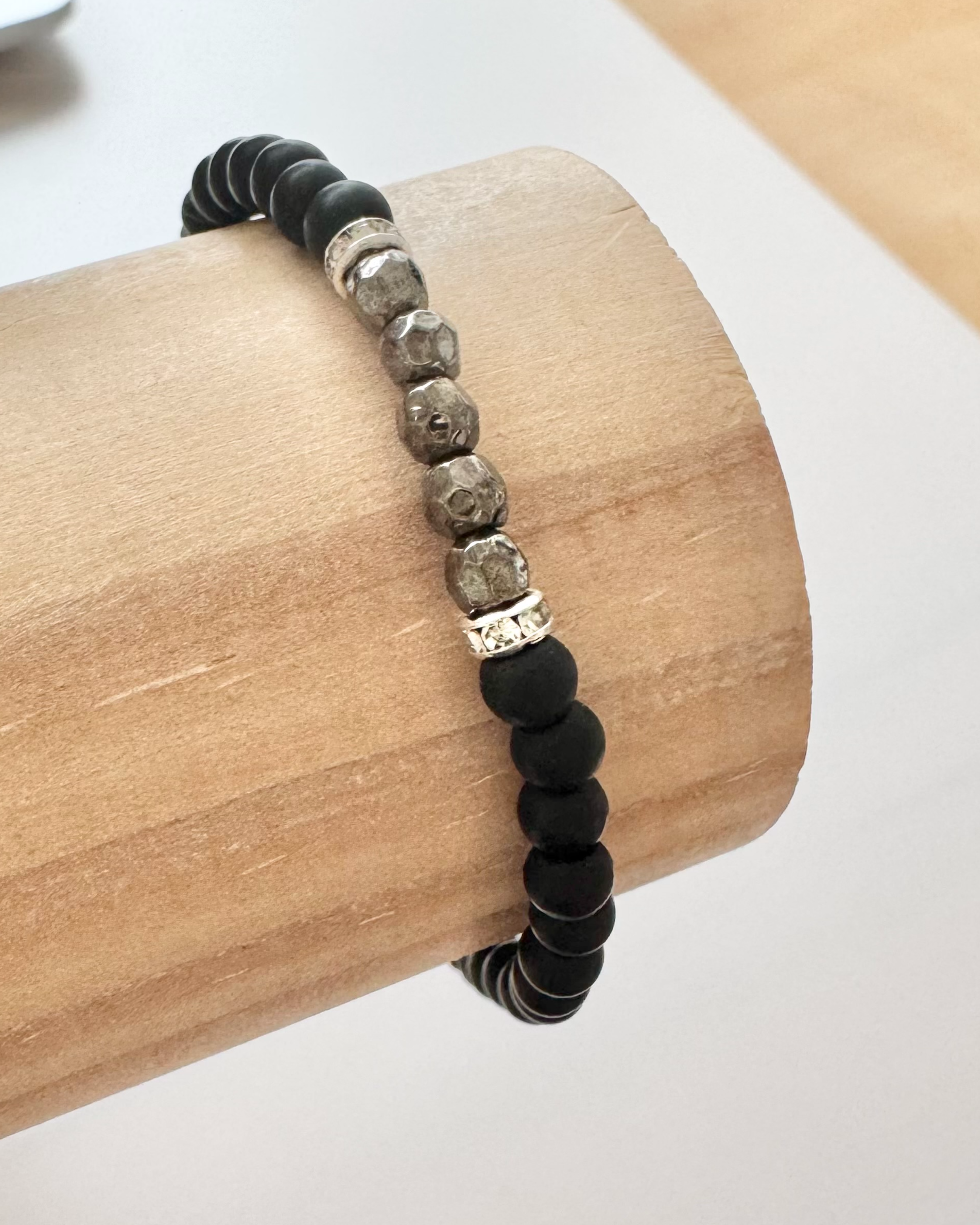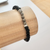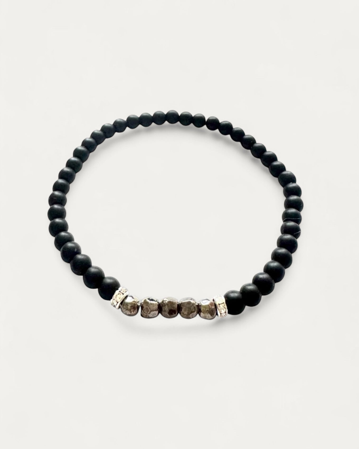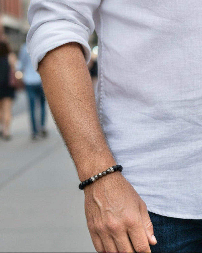 Elastic bracelet for men, handmade with black and gray glass beads, 4mm. Minimalist design for casual outfits.
