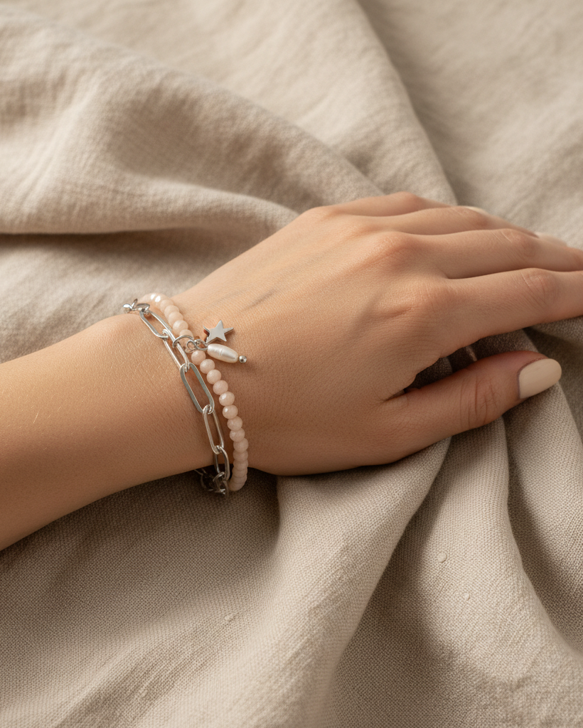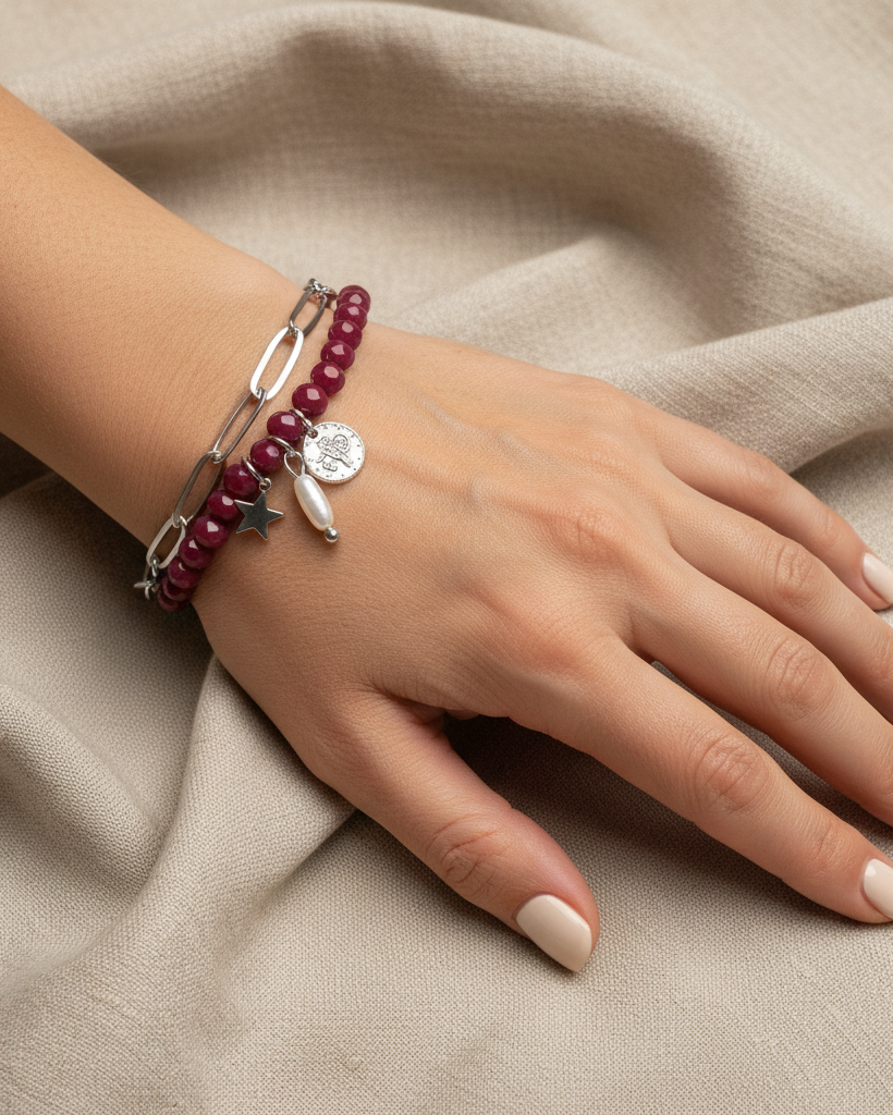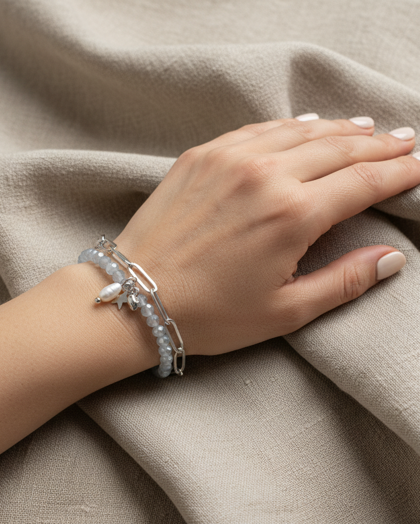 A nice bracelet in beautiful faceted glass beads combined with silver-plated chain and charms
