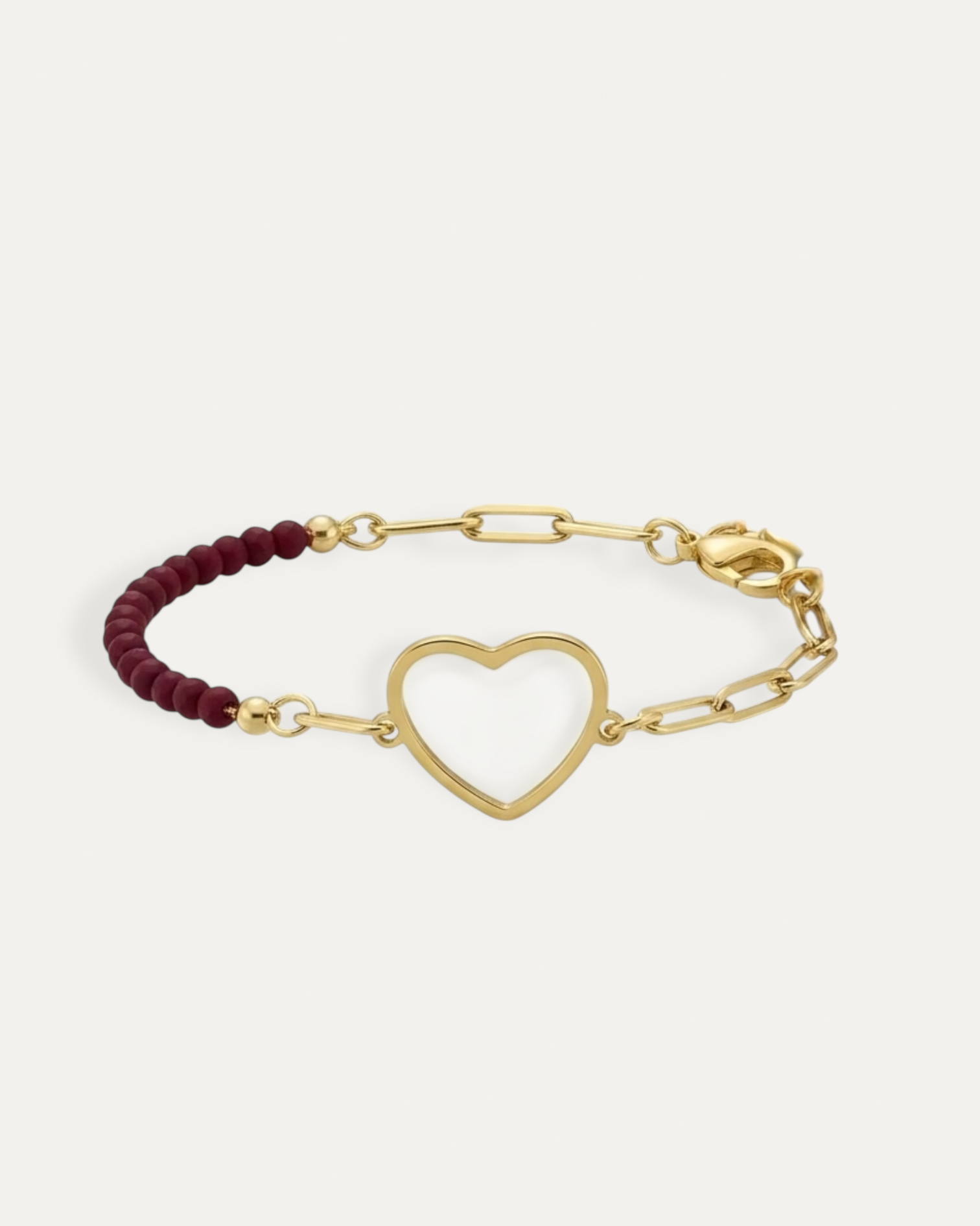 A nice bracelet in beautiful faceted glass beads combined with gold-plated chain. In the middle, it has a golden heart.