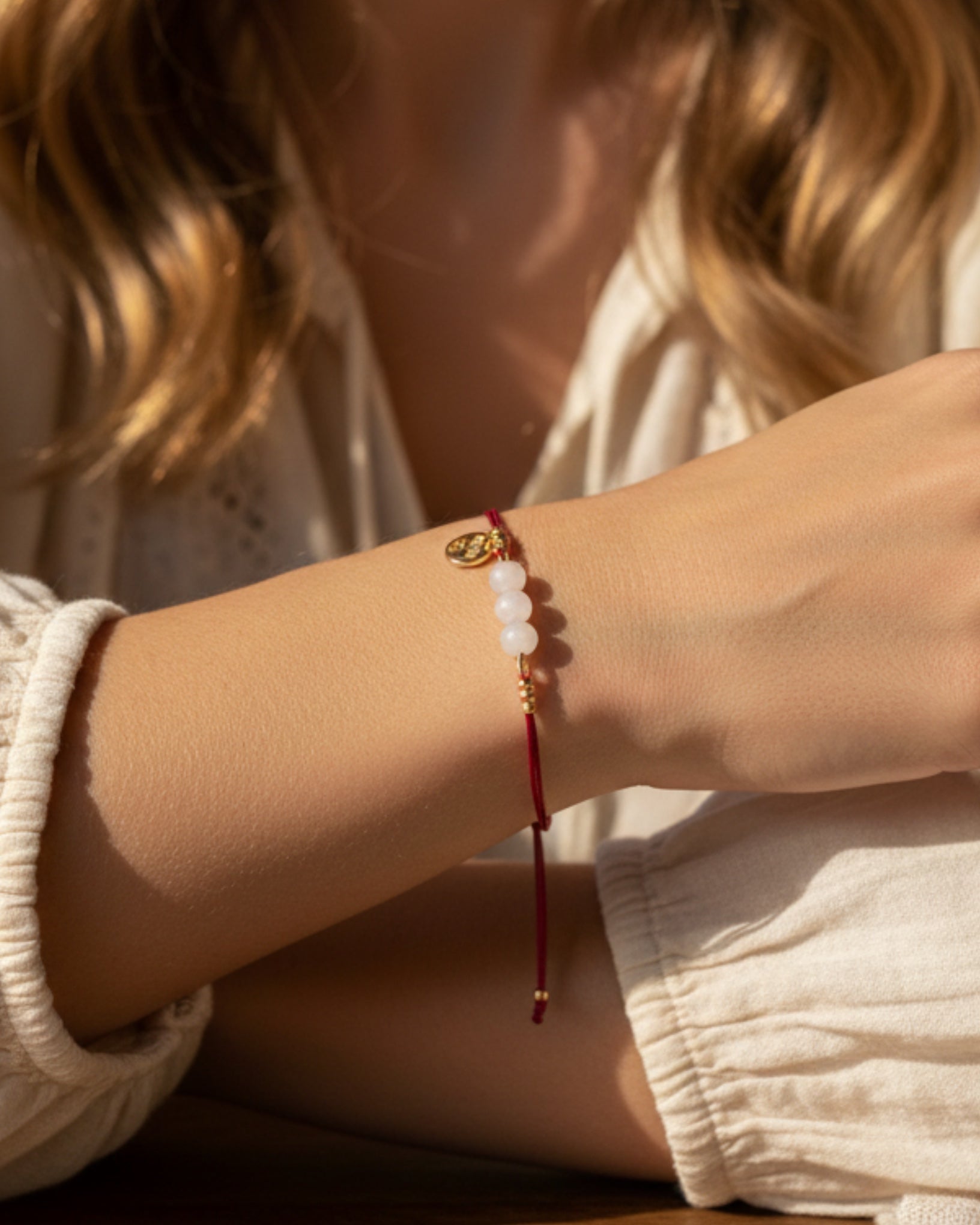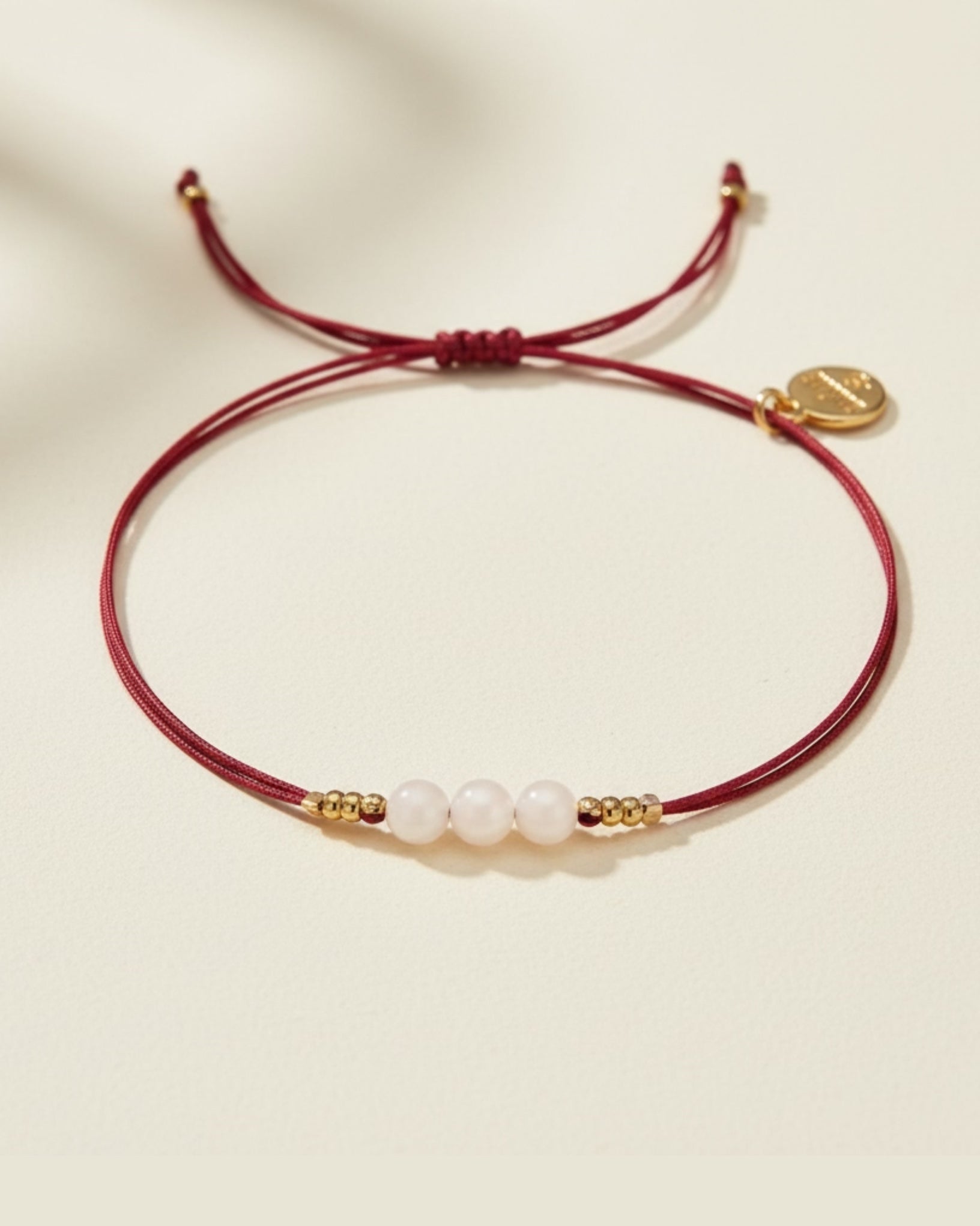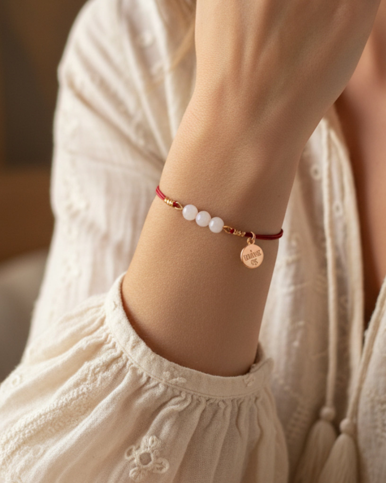 Bracelet of fine cord and in the middle row of beads.