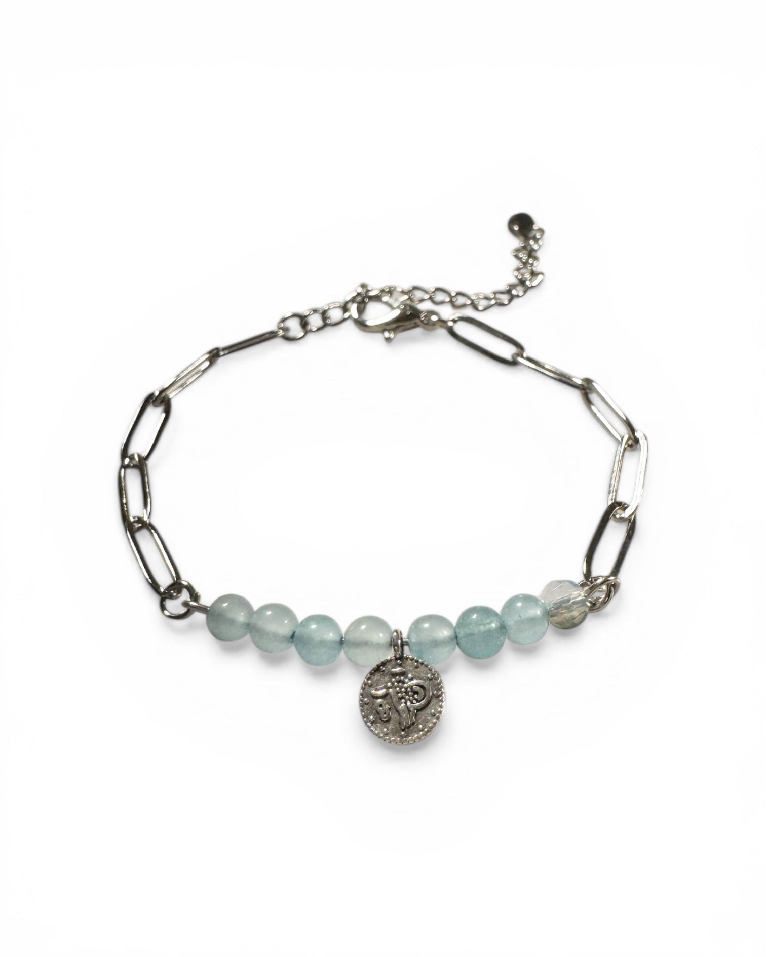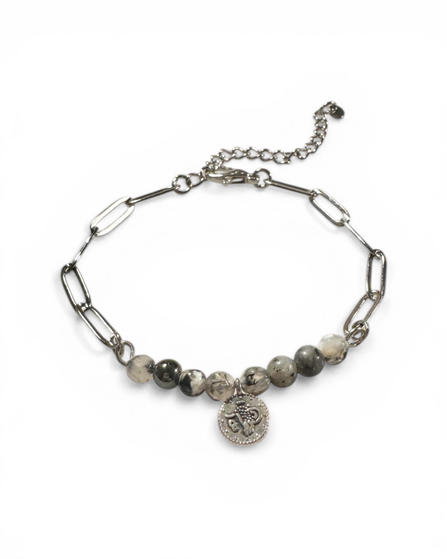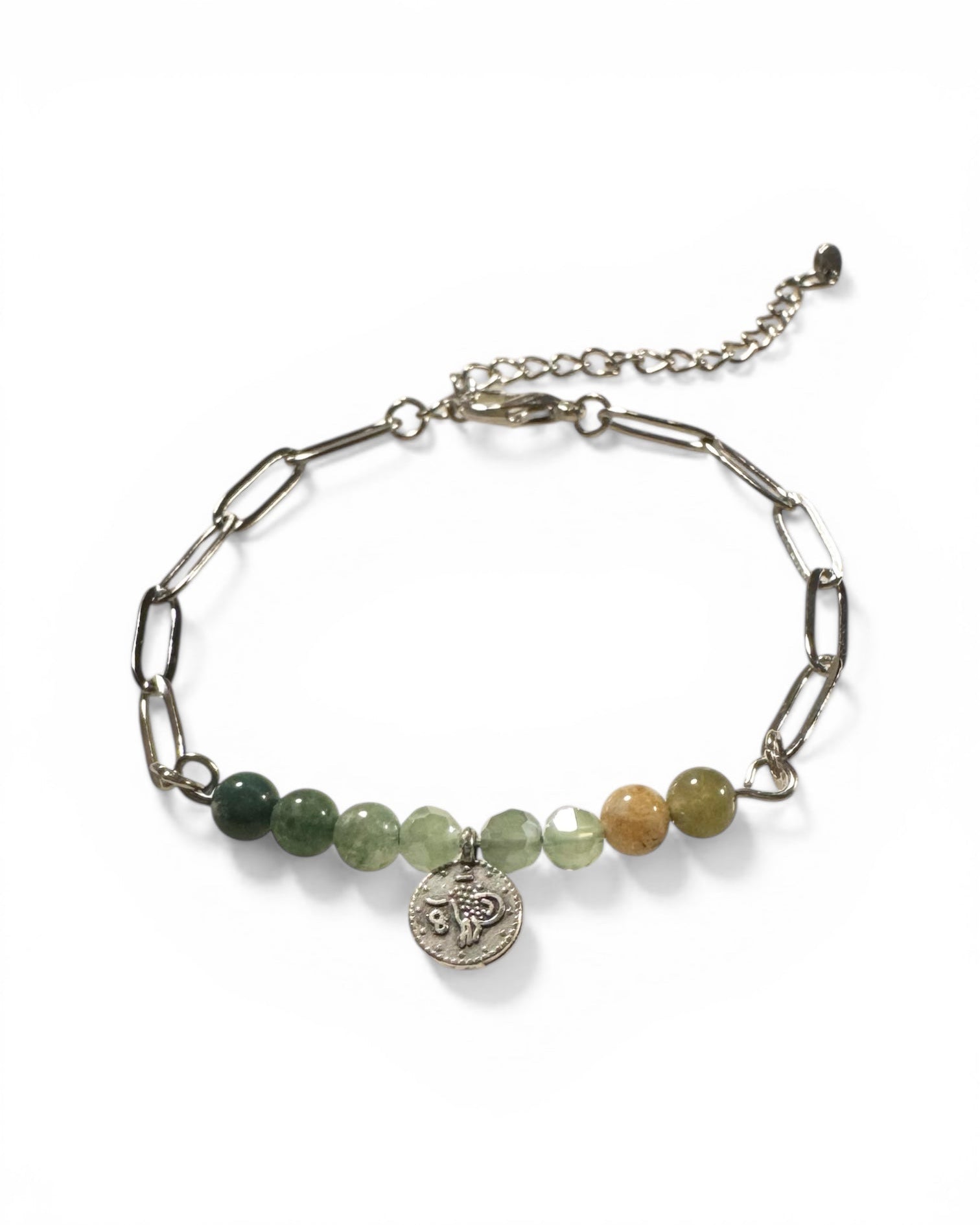 A beautiful bracelet with precious coloured glass beads and a silver-plated chain. In the centre is a small silver coin.