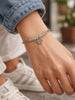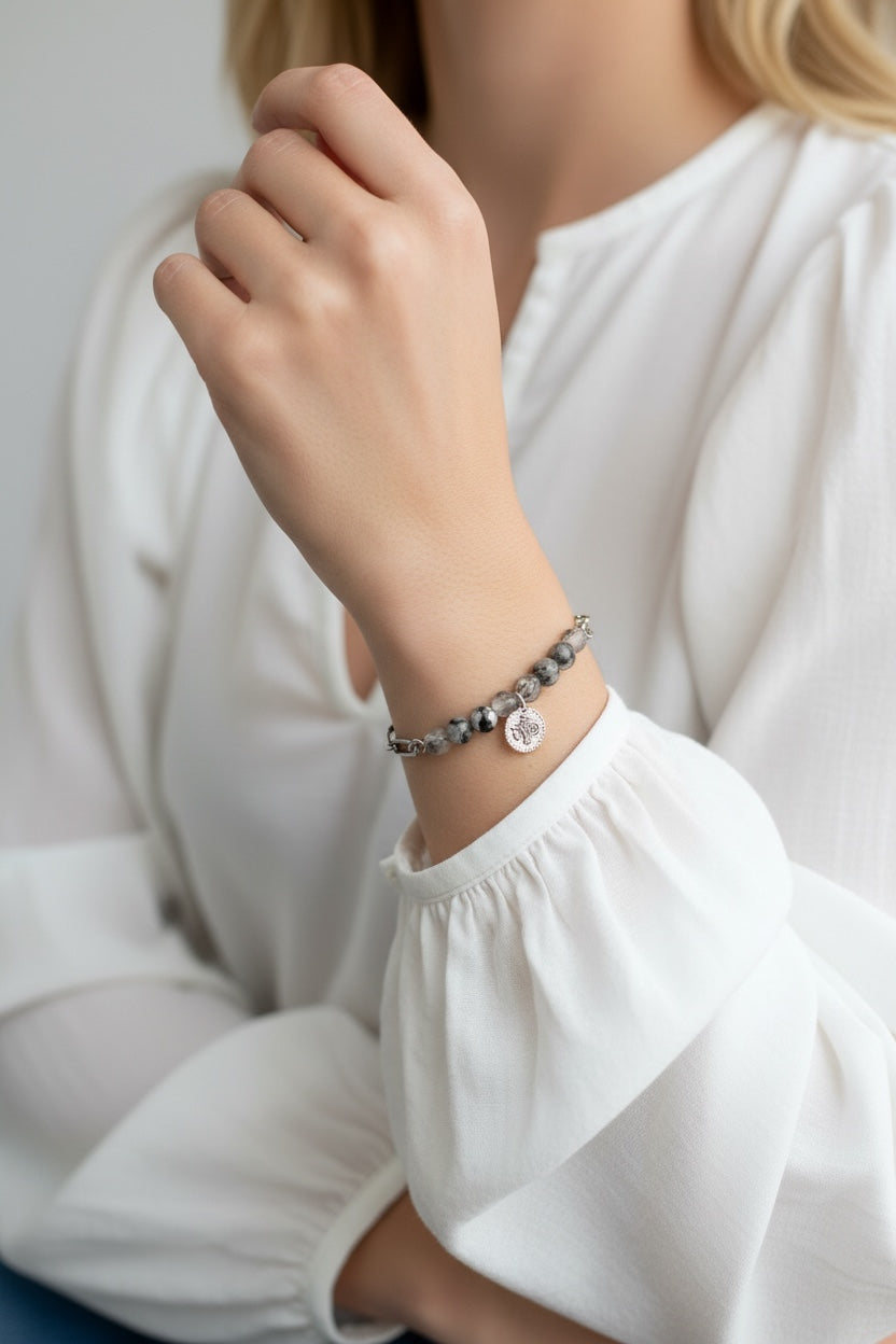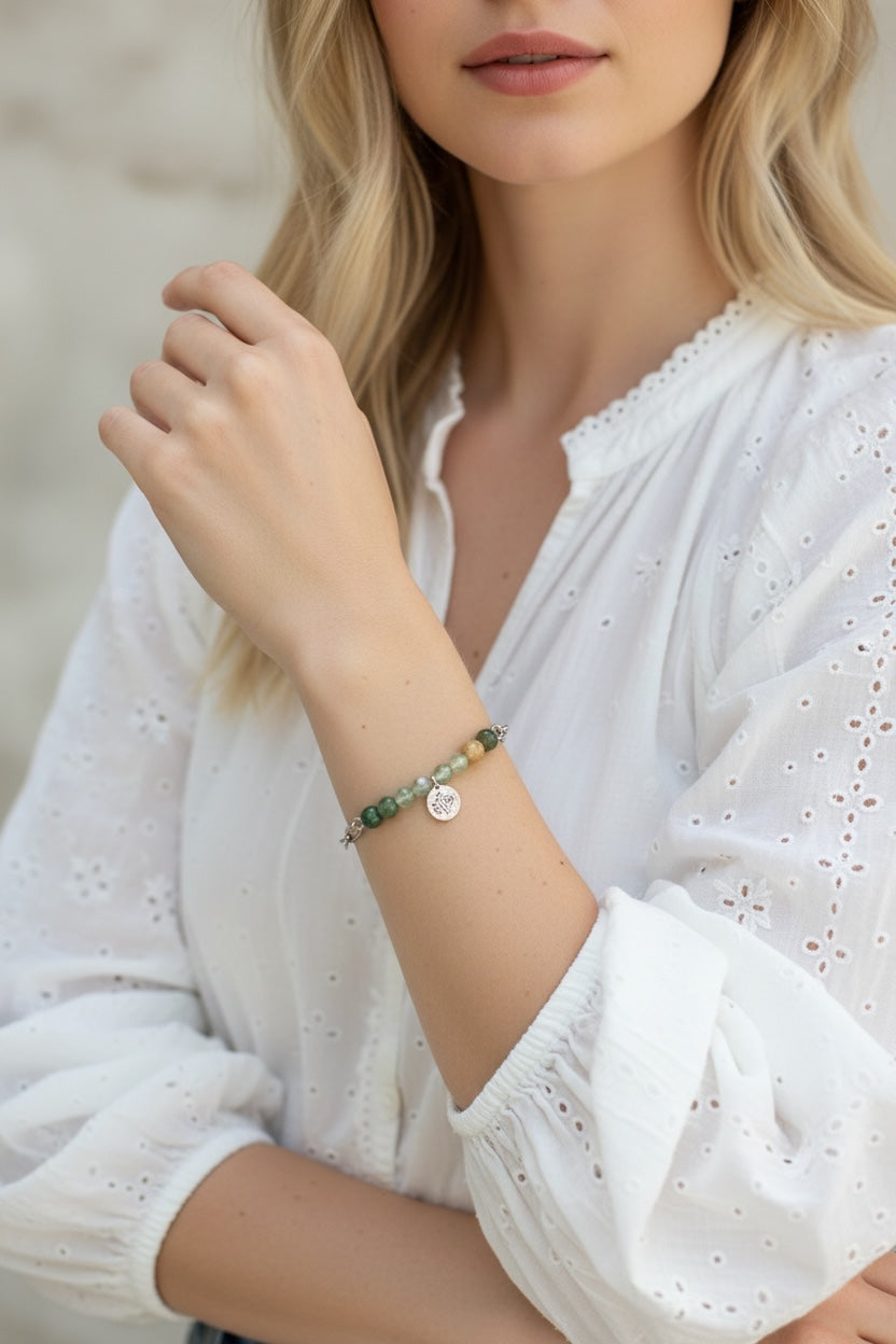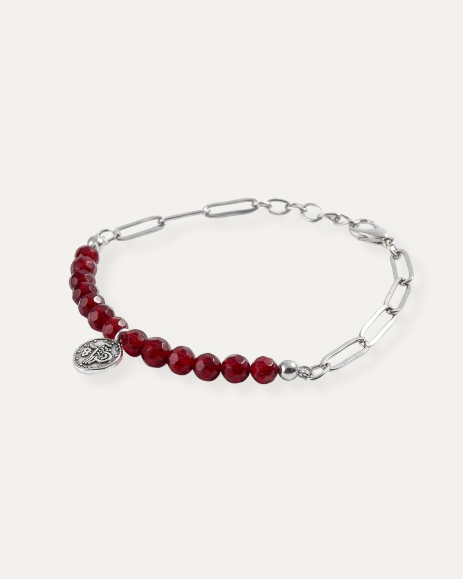 A beautiful bracelet with precious coloured glass beads and a silver-plated chain. In the centre is a small silver coin.