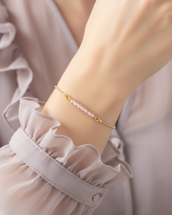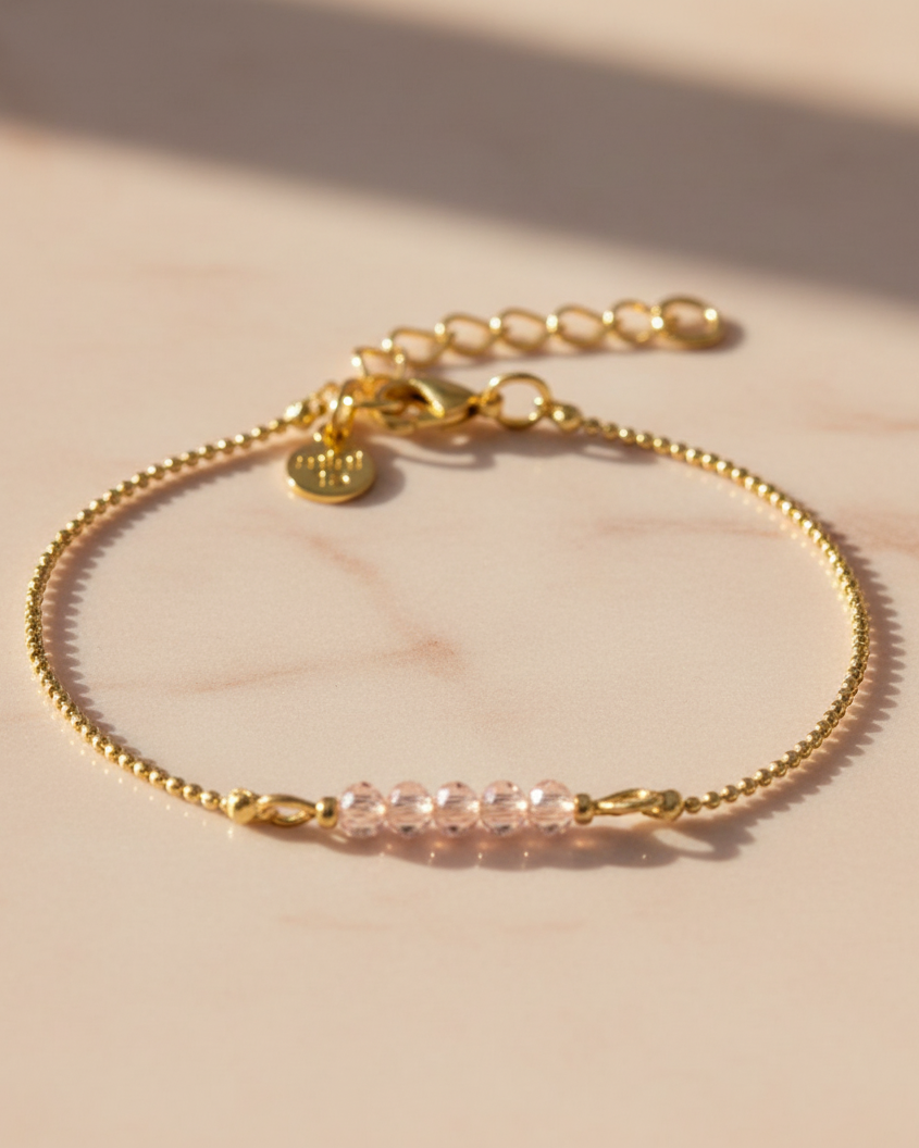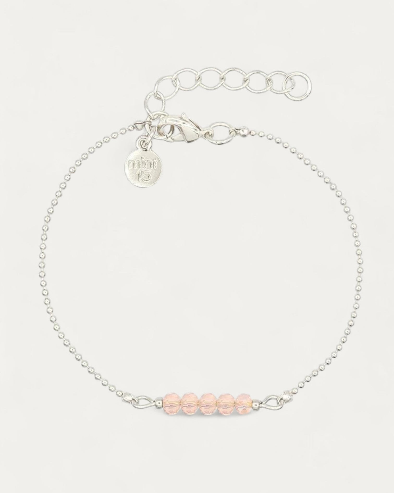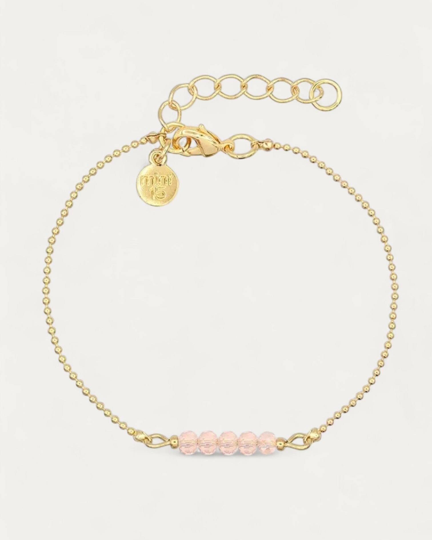 Beautiful bracelet of fine ball chain (1,2 mm) with in the middle 5 facet cut glass beads in a shiny color. Very subtle and wonderful to combine.