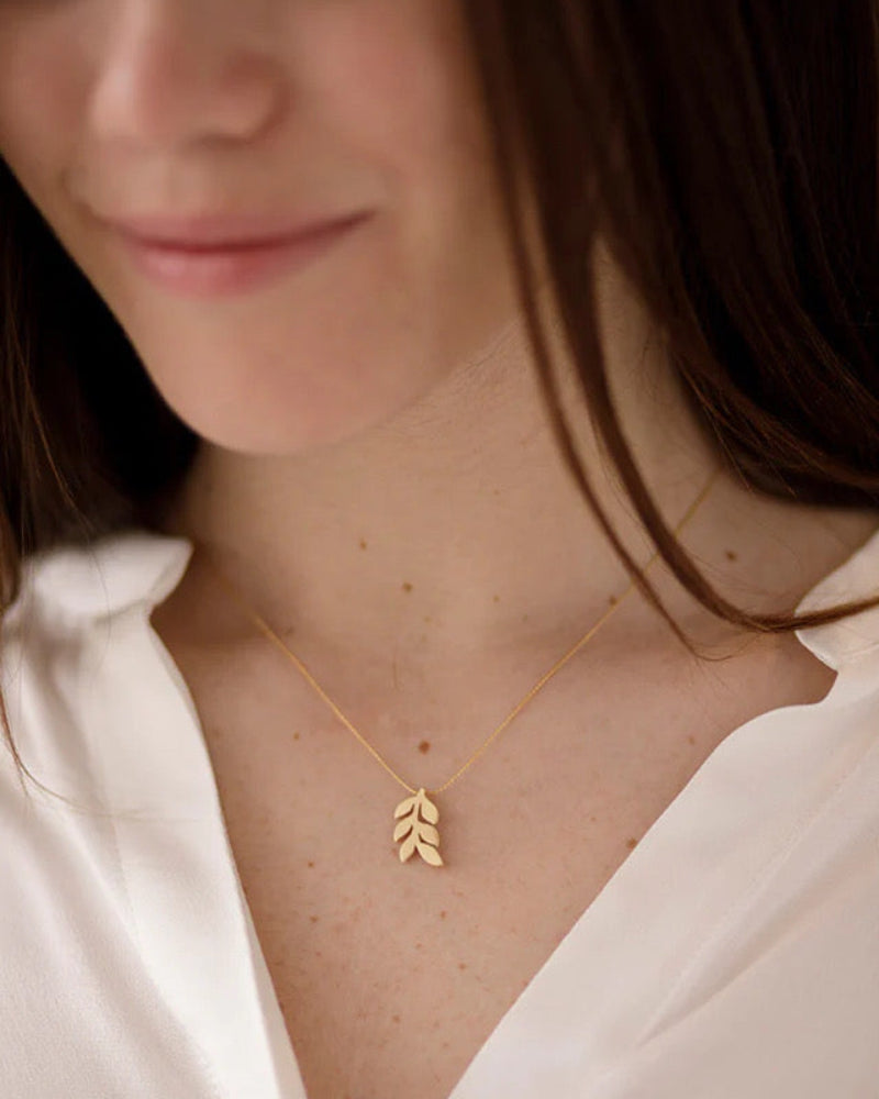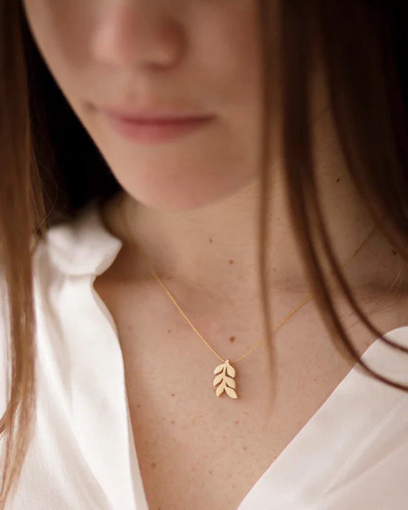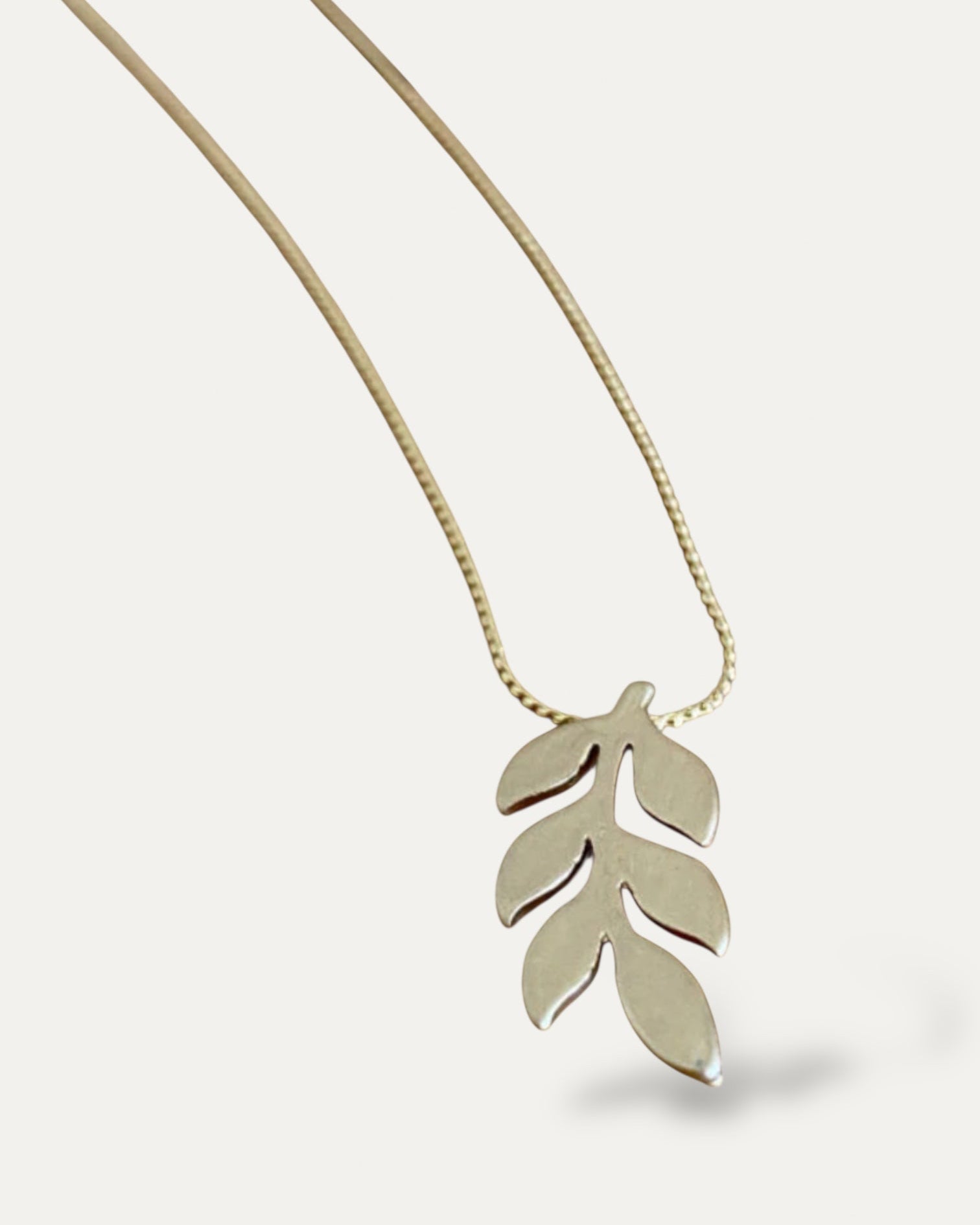 Necklace in matte gold with flat leaf. Very elegant. A tribute to nature.