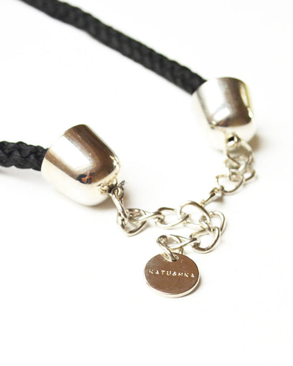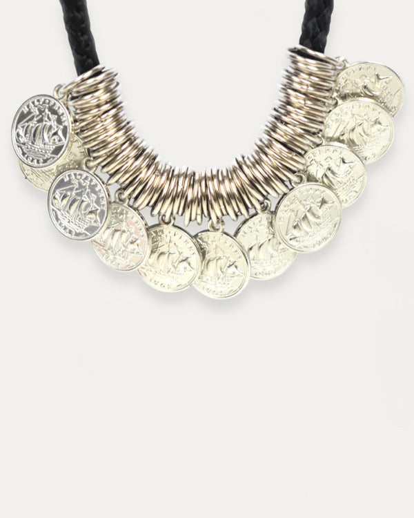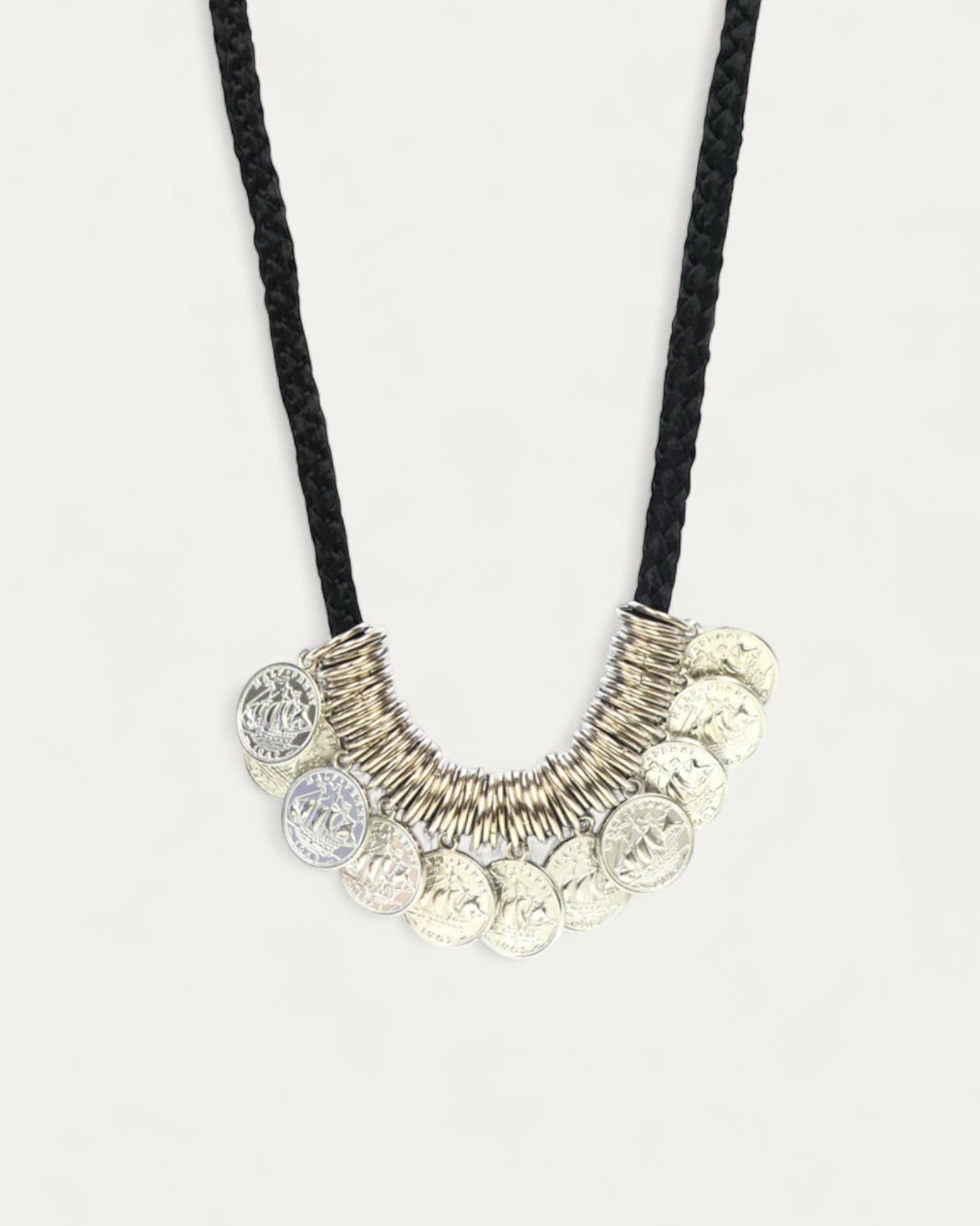 Necklace made of cotton cord and stainless steel coins.