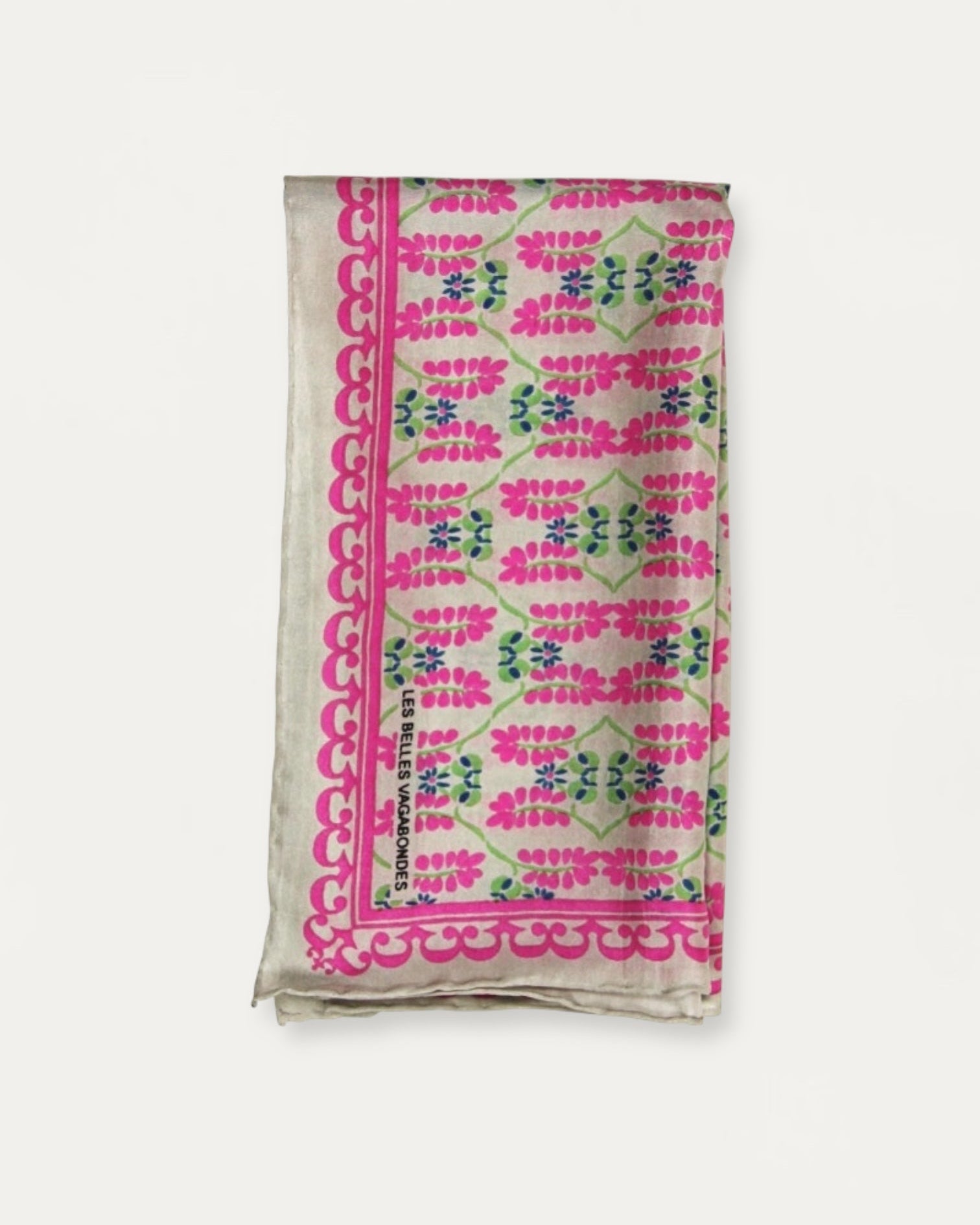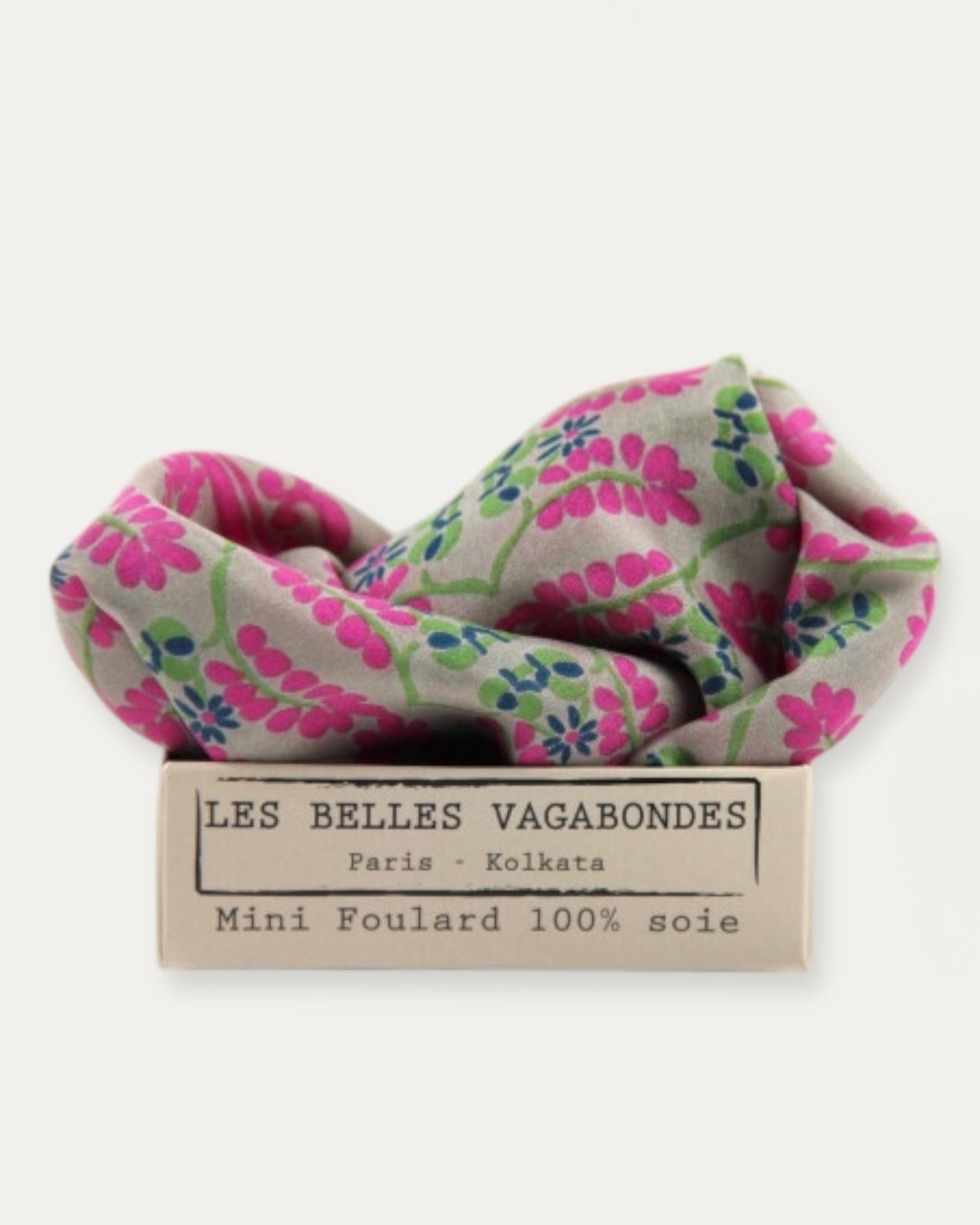 The Mini Albertine Pink scarve is crafted from 100% silk, featuring exclusive hand-drawn designs created in France and expertly hand-printed in India.