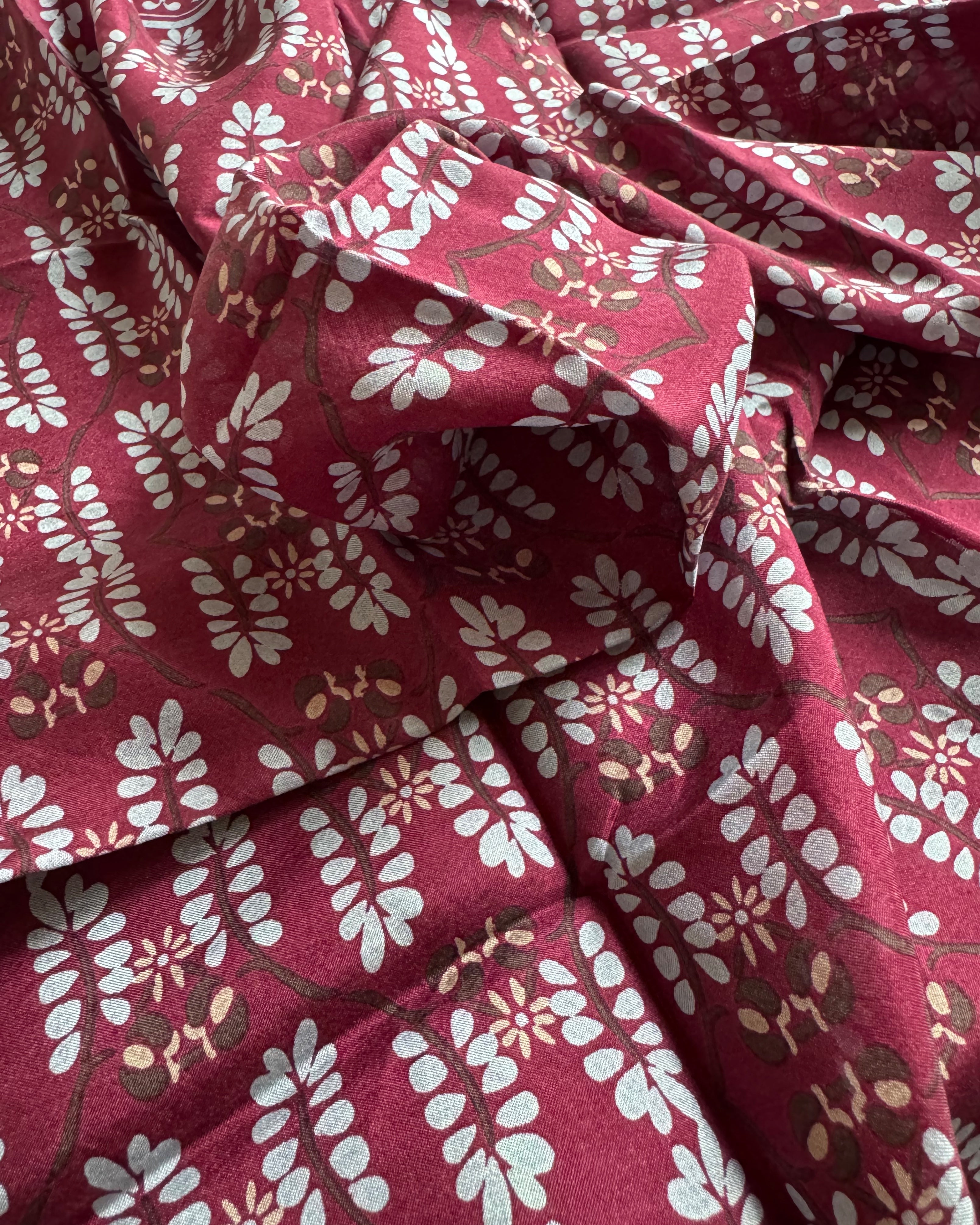 The Mini Albertine Burdeos scarf is crafted from 100% silk, featuring exclusive hand-drawn designs created in France and expertly hand-printed in India.