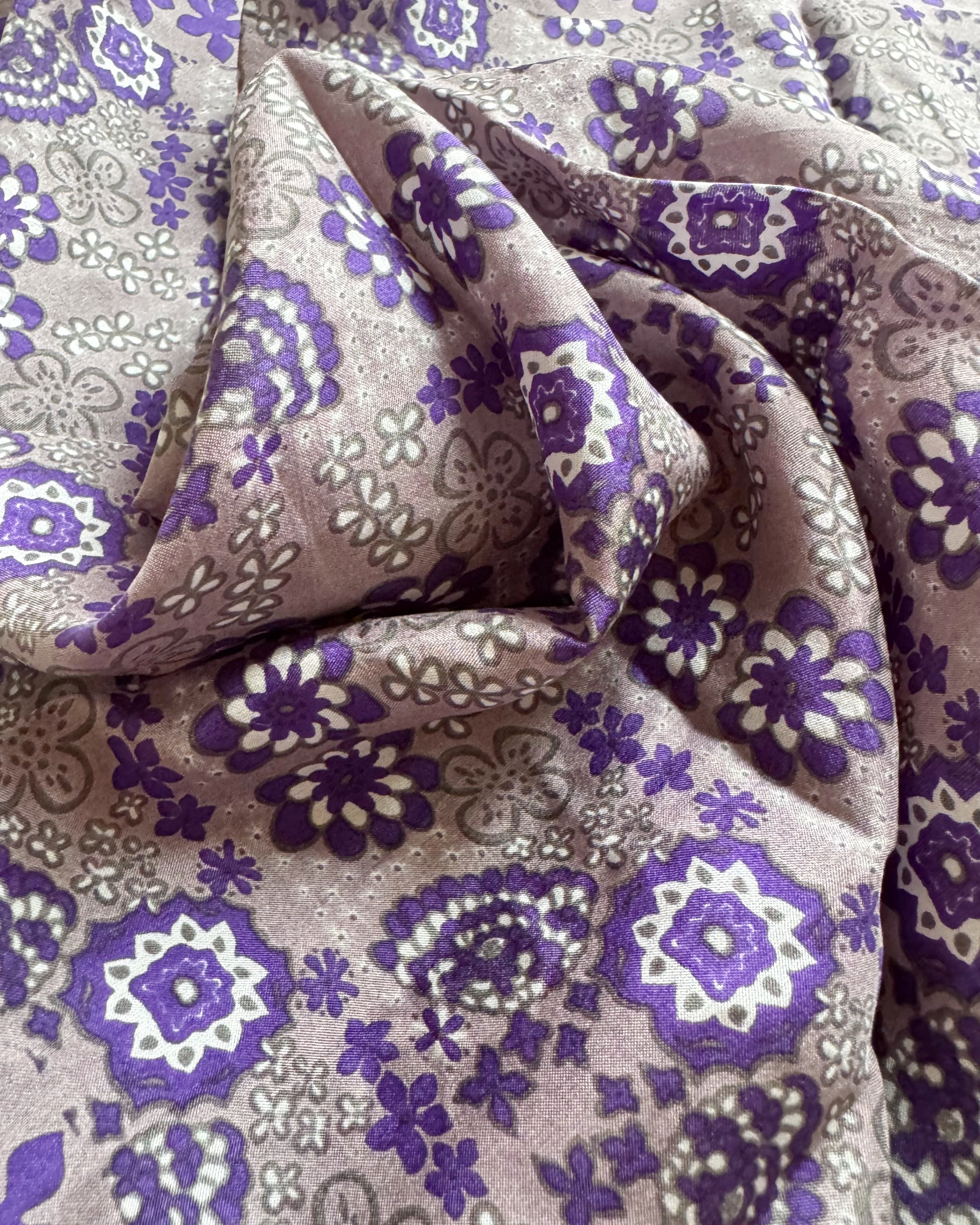 The Mini Caribe Purple scarf is crafted from 100% silk, featuring exclusive hand-drawn designs created in France and expertly hand-printed in India.