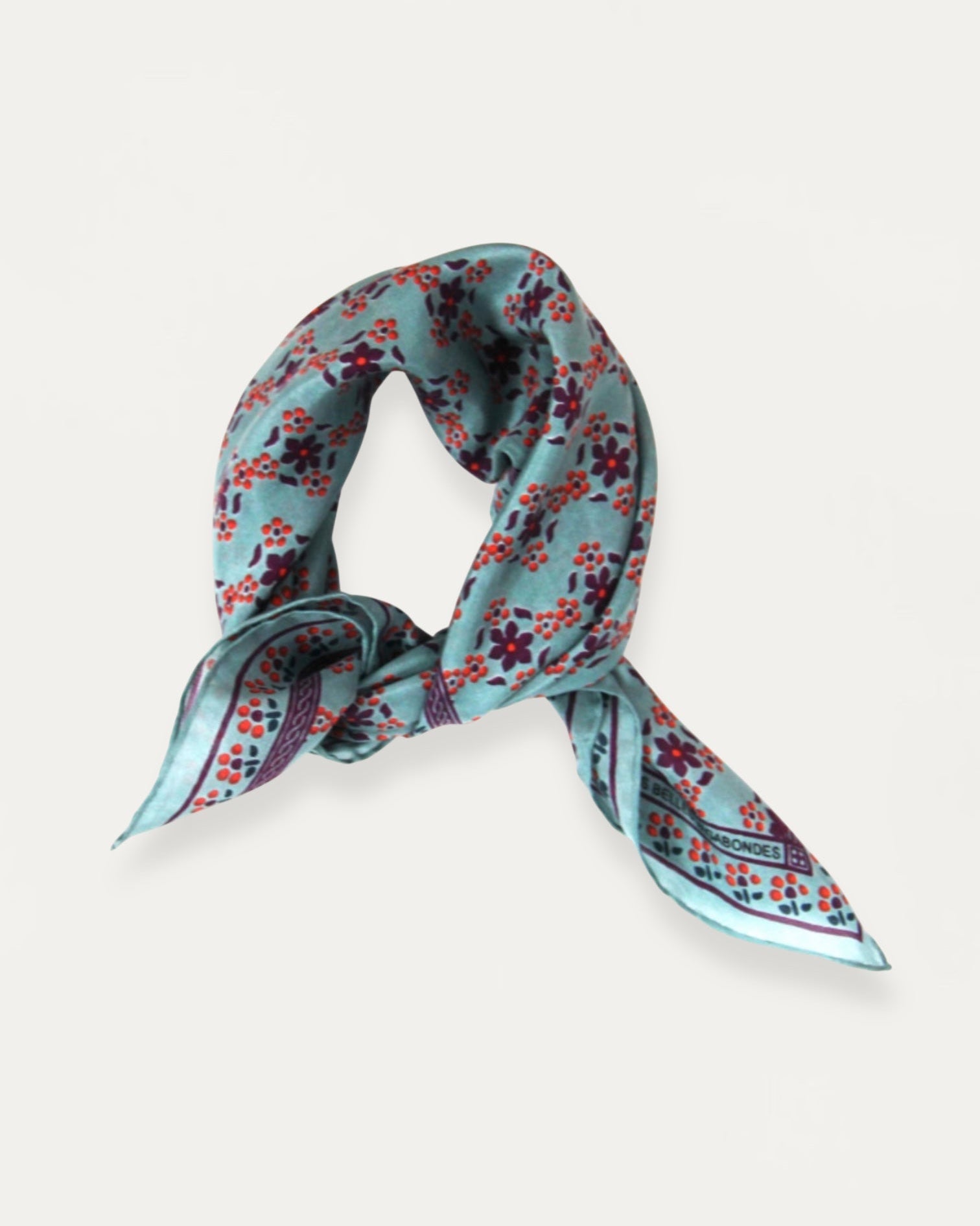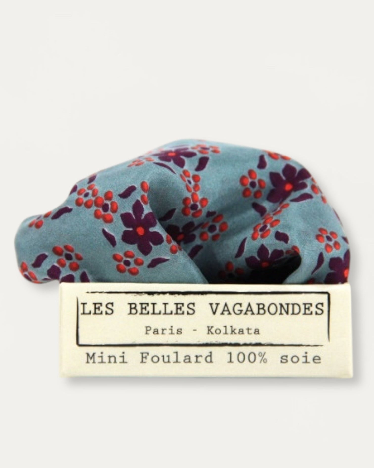 The Mini Natasha Light Blue scarve is crafted from 100% silk, featuring exclusive hand-drawn designs created in France and expertly hand-printed in India.