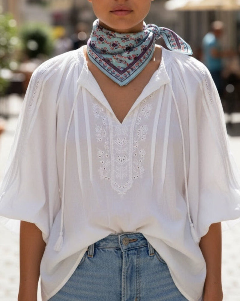 About the brand: Quality and originality are the keywords at "Les Belles Vagabondes". They choose their fabrics with the utmost care, using only 100% natural materials such as silk, wool, and cotton. Similarly, for printing, they choose traditional Indian techniques that produce excellent results. They print their products in a socially responsible workshop using ASO-free inks. The designs are created in Paris-France, by Les Belles Vagabondes, inspired by travel and all the discoveries that surround and surprise them, which means that every piece from "Les Belles Vagabondes" is a fashion accessory born out of passion.