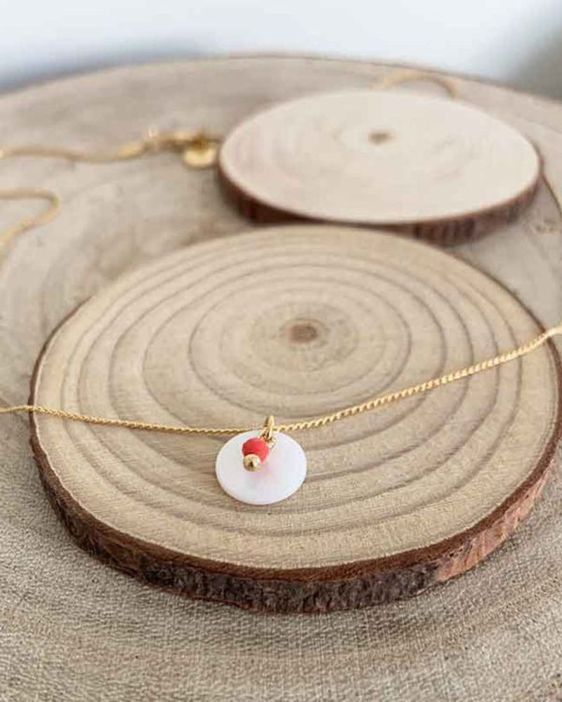 Material: 2mm gold mother-of-pearl coral bead necklace and 10mm mother-of-pearl 10mm with a single 0,7mm gold plated chain and a length of 37cm with extension for different sizes.