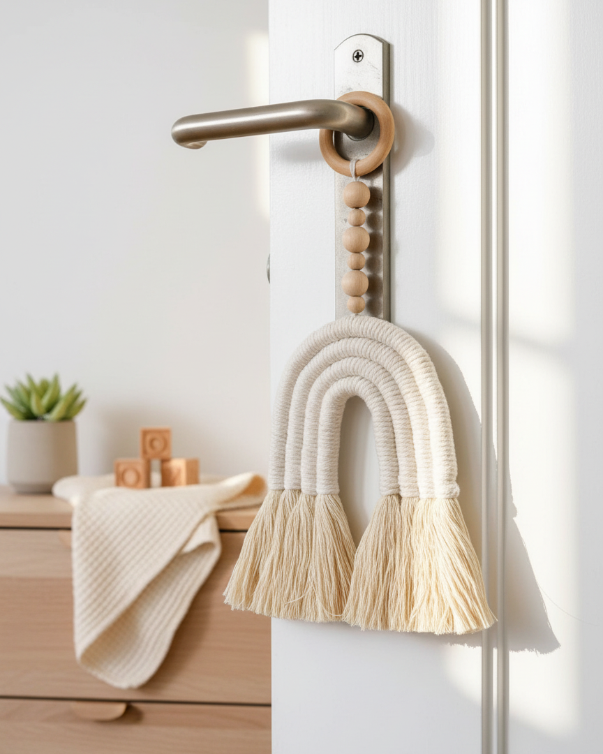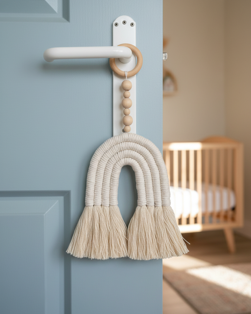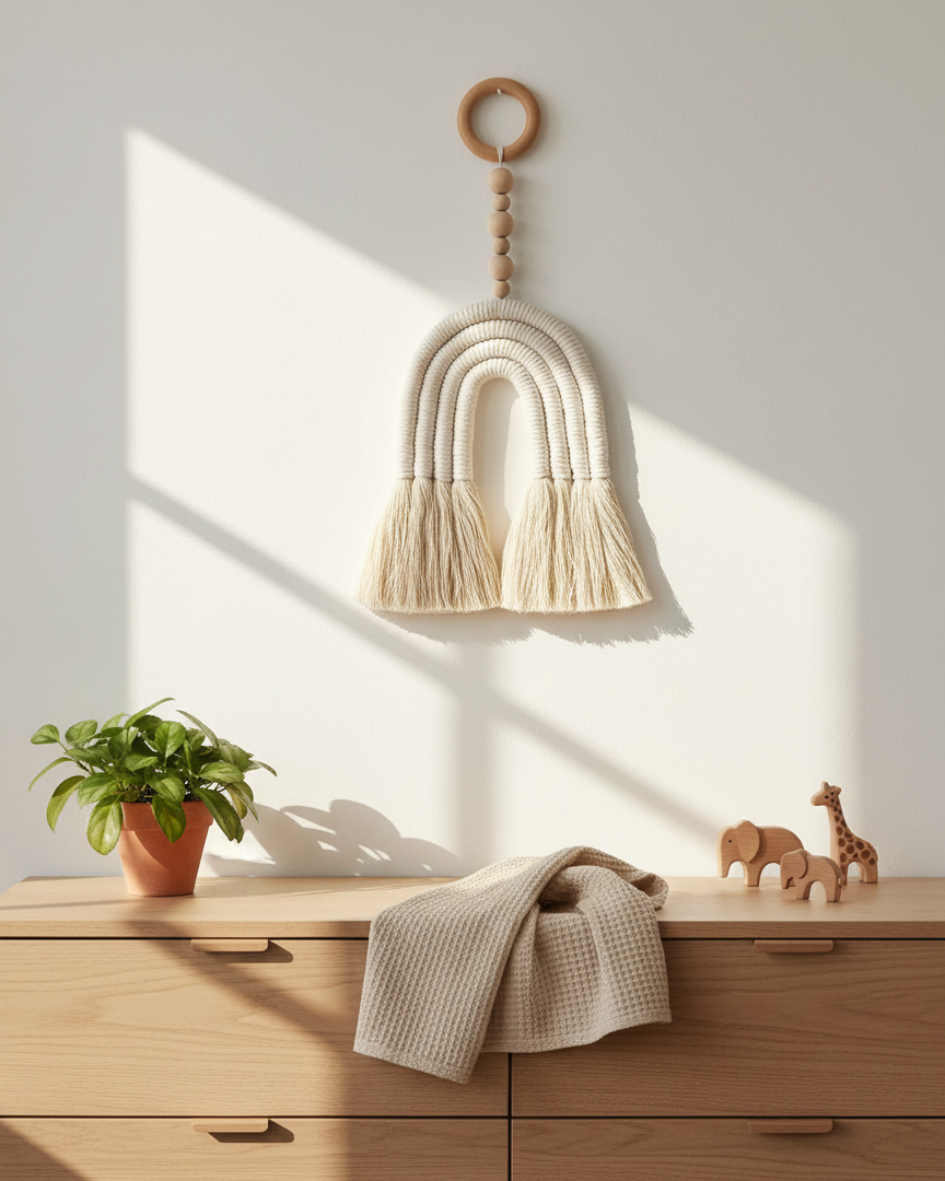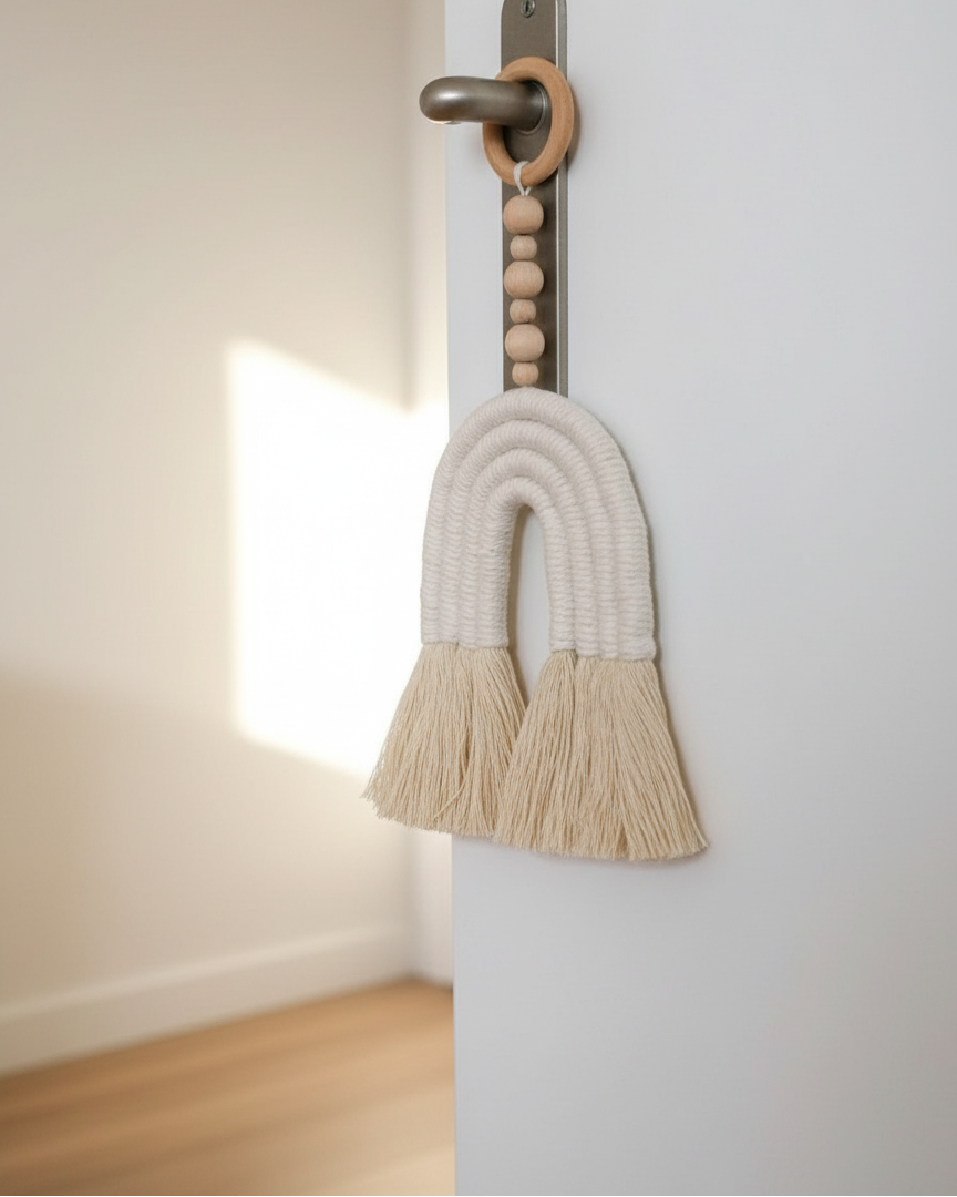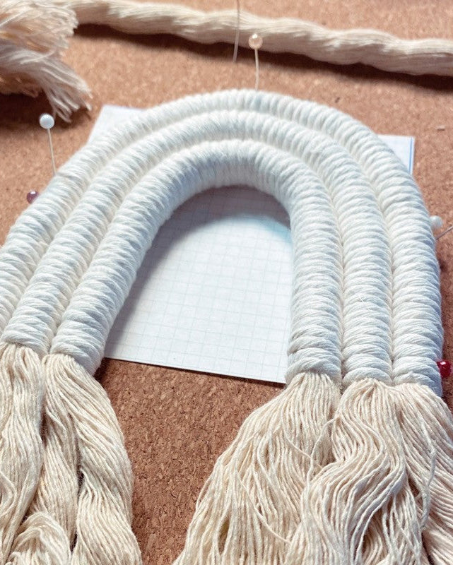 4 row rainbow wall hanging in cream color, wooden pearls and a wood ring.