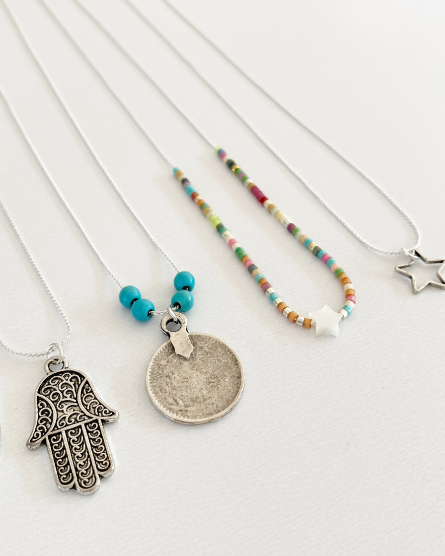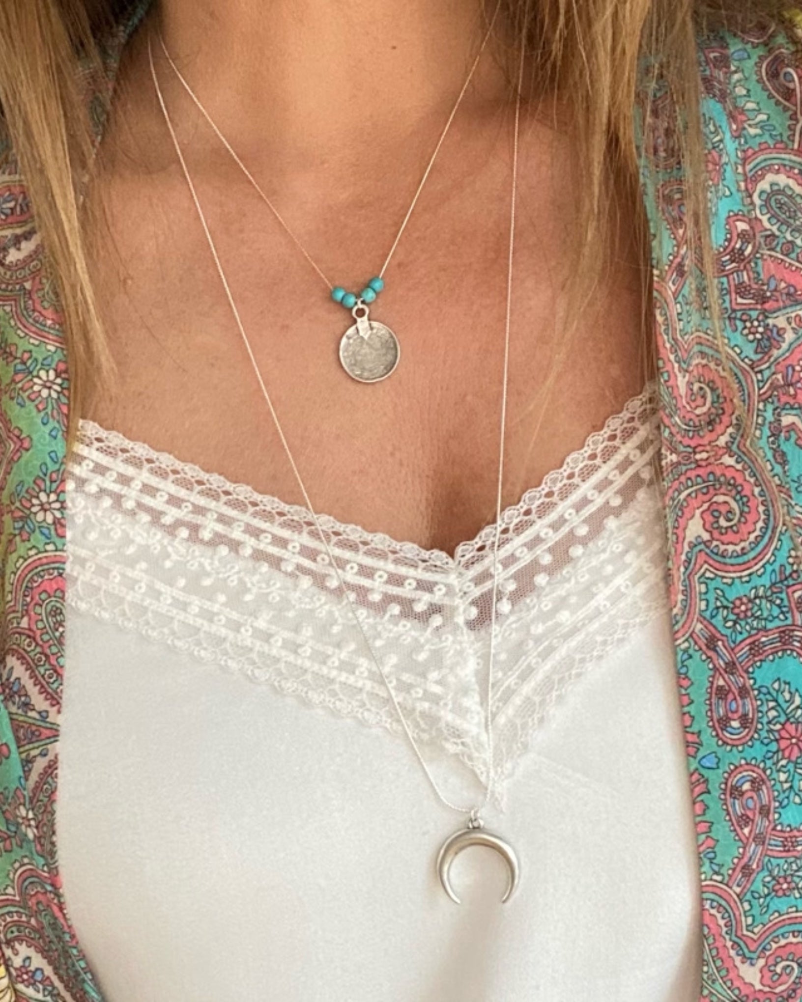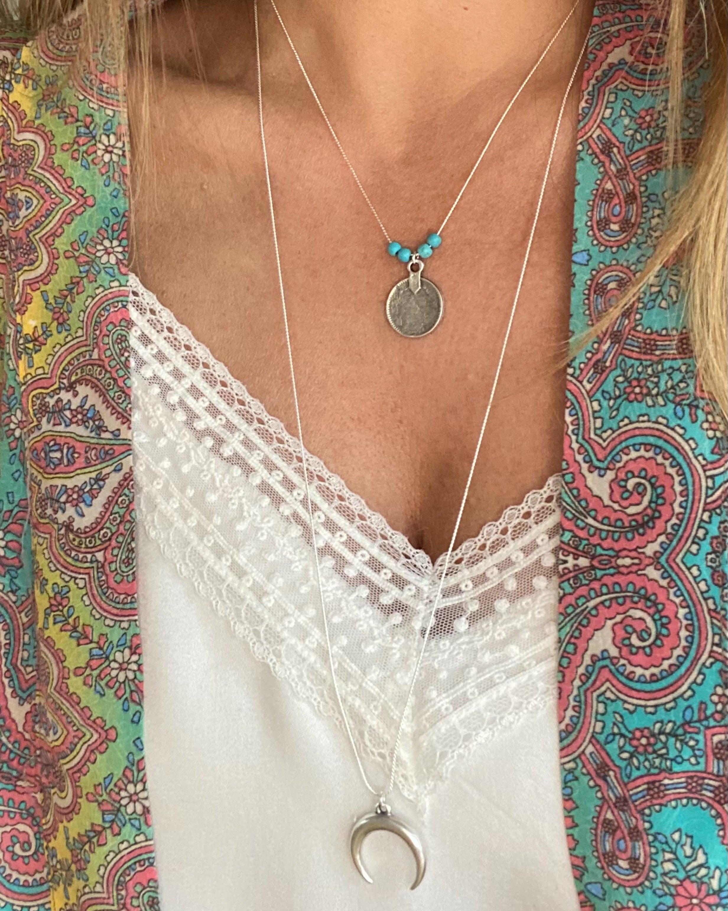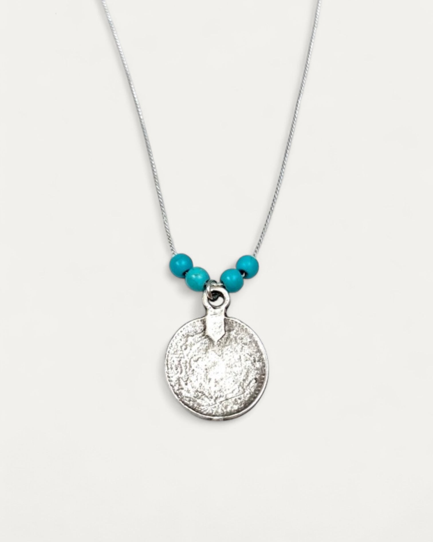 Necklace with 17 mm old matt silver coin with turquoise detail, 0.7 mm silver plated brass chain.