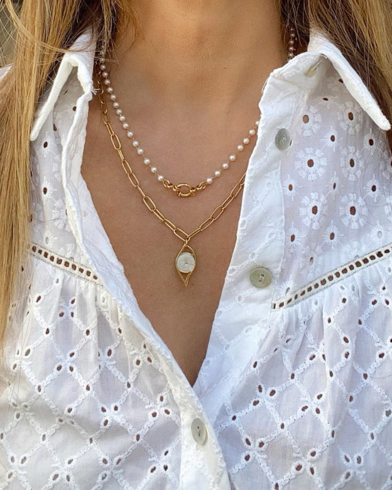This necklace features an elegant and simple stainless steel chain. In the center of the chain hung an exquisite eye-shaped charm, also gold-plated and adorned with smooth mother-of-pearl.