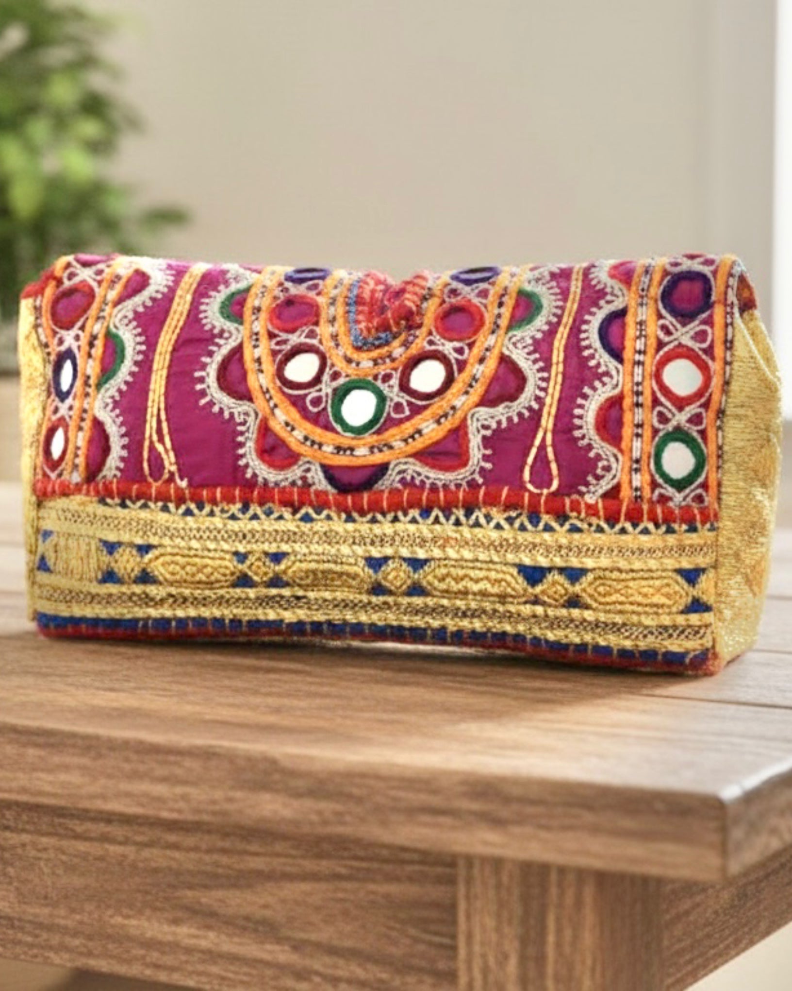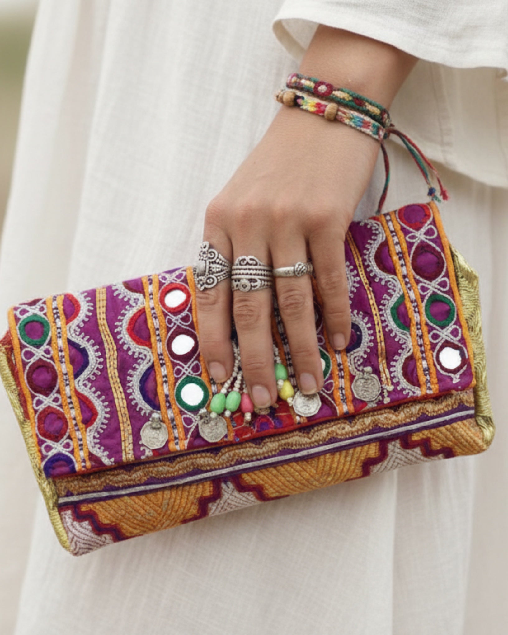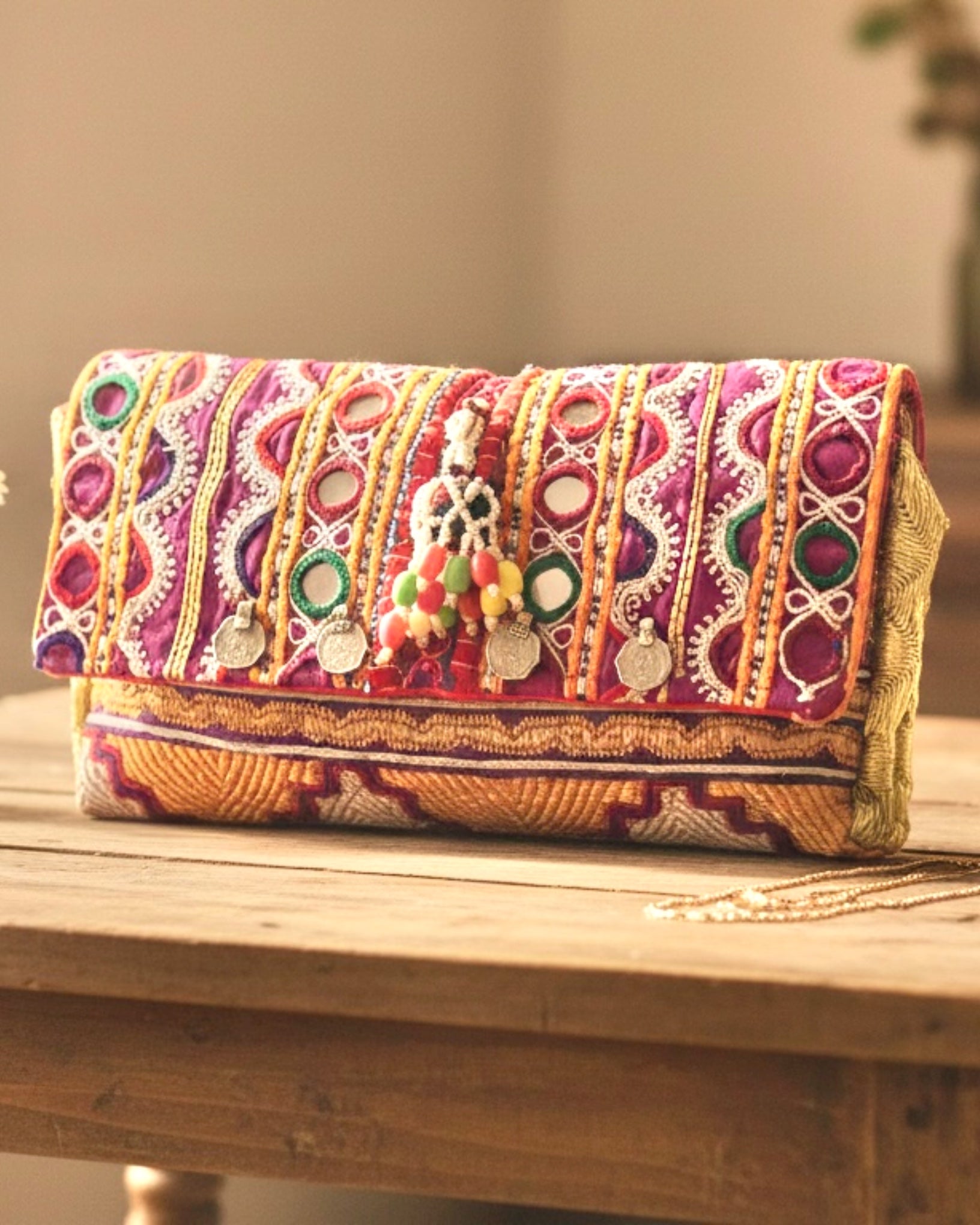 This colorful ethnic clutch bag was carefully handmade with vintage fabrics from Afghanistan and decorated with old tribal accessories on top.