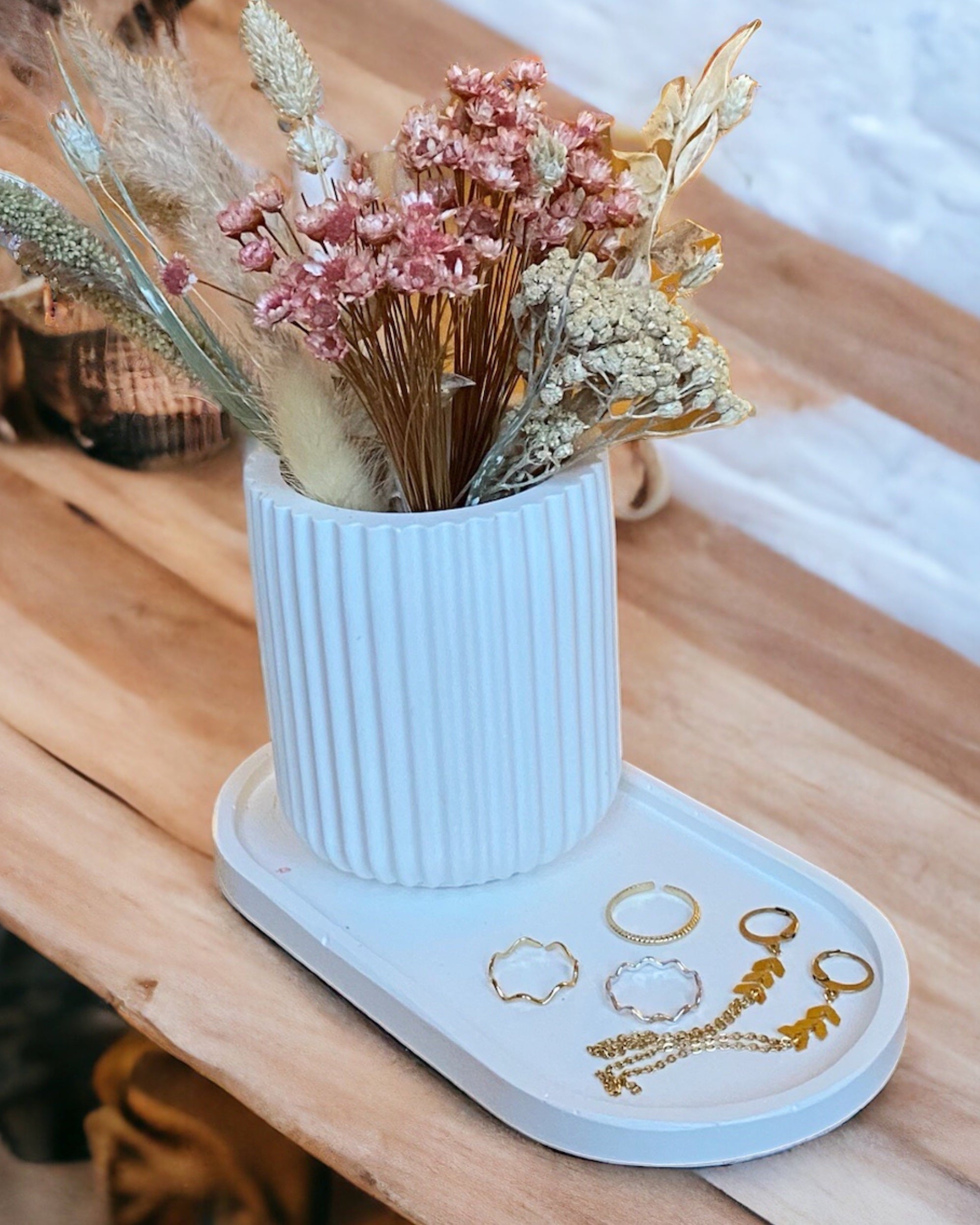 Discover artisanal elegance with our handmade set: irregularly shaped vase and tray, meticulously crafted by Muak. Each piece is unique, crafted from white raisin ceramic that brightens any space. Add a touch of sophistication to your home with this set that combines beauty and craftsmanship.