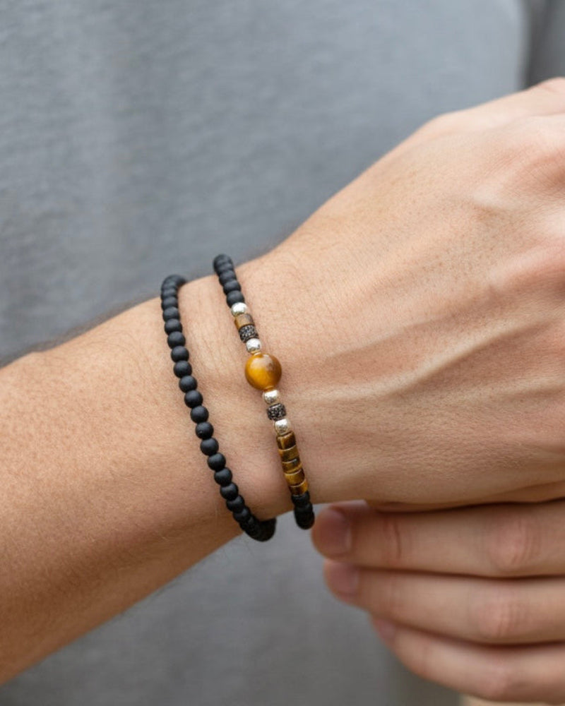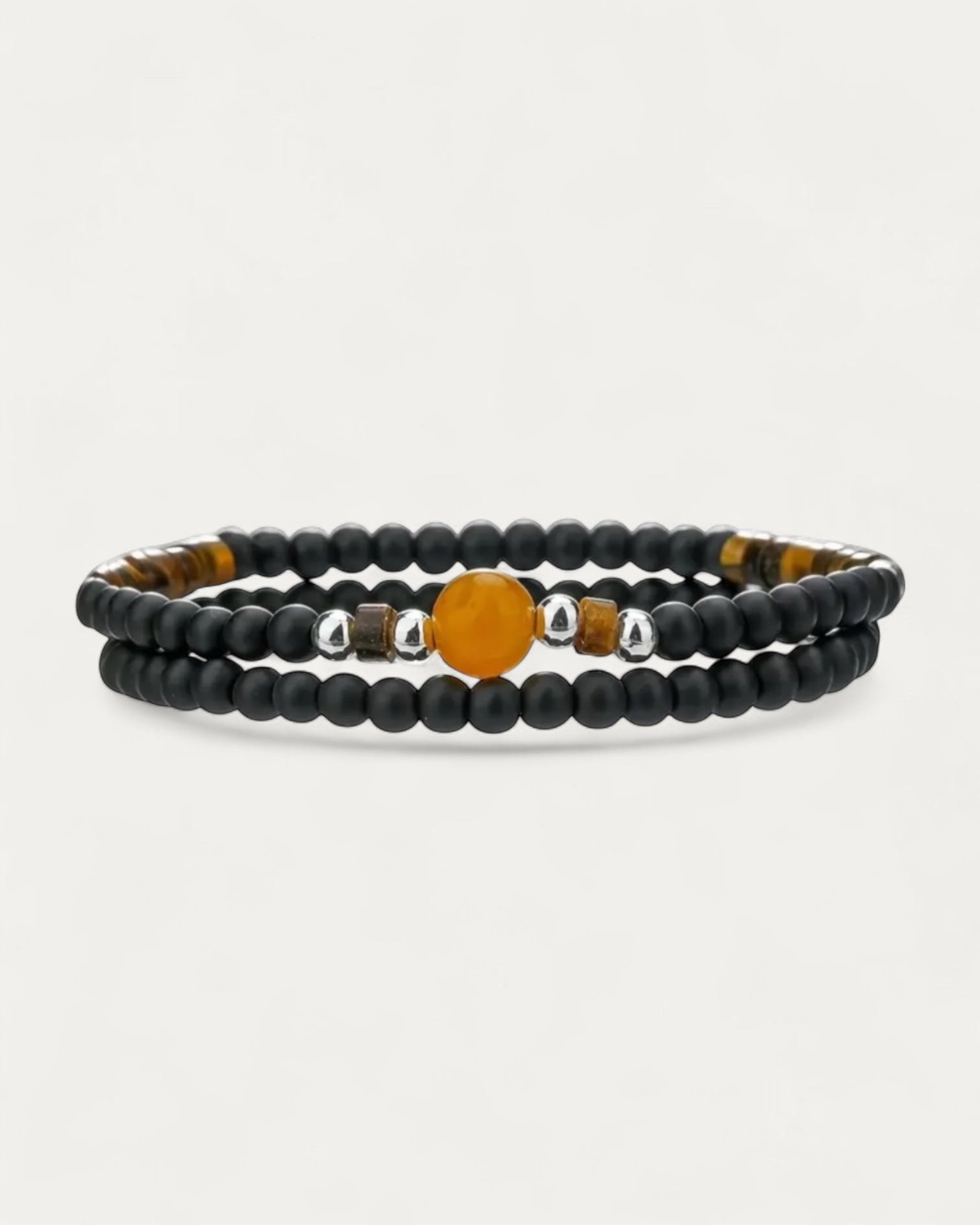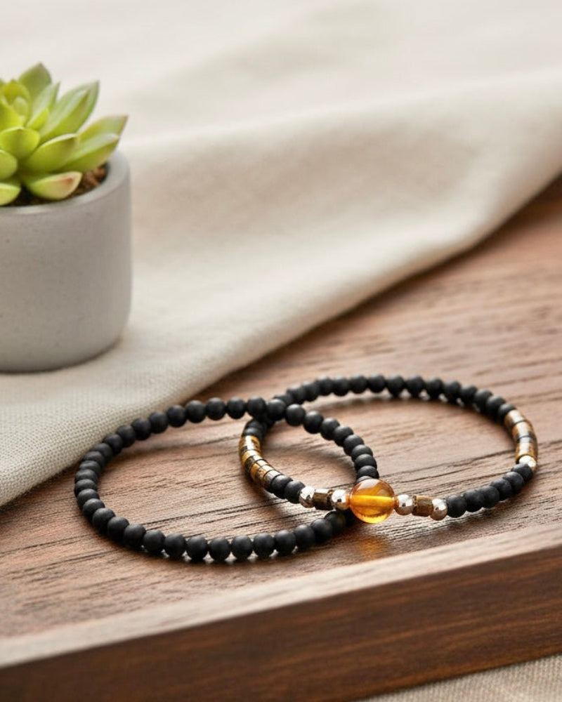 This double set of elastic bracelets is made with black onyx, tiger's eye, and amber stones. Wear this versatile set alone or combine it with your other bracelets.