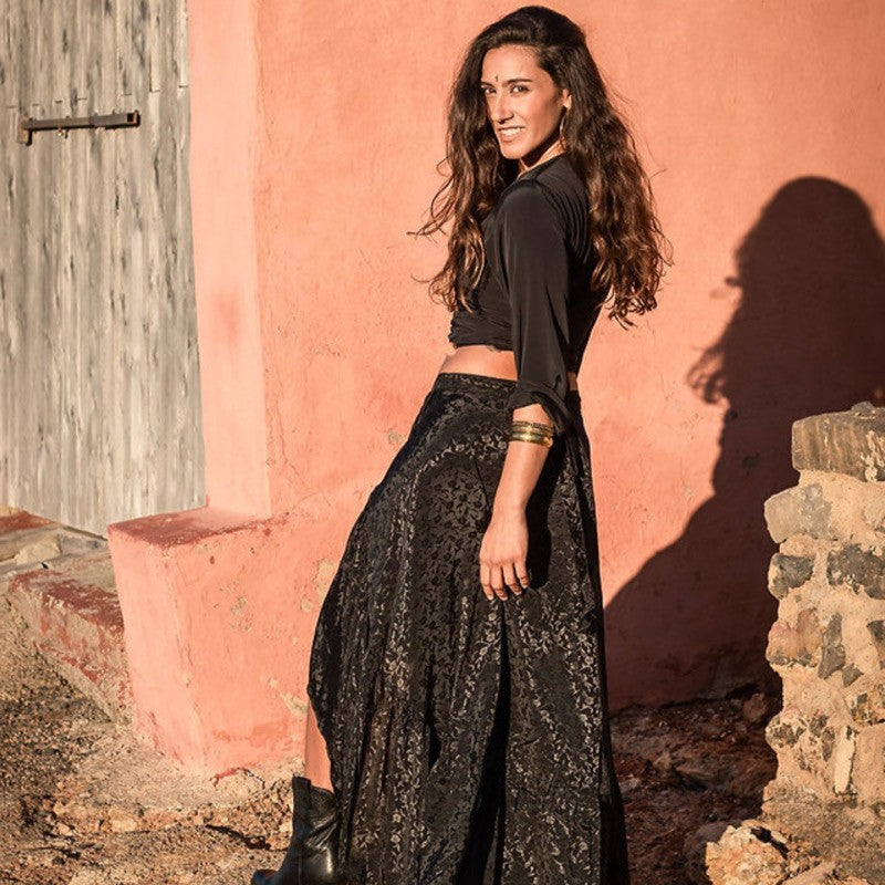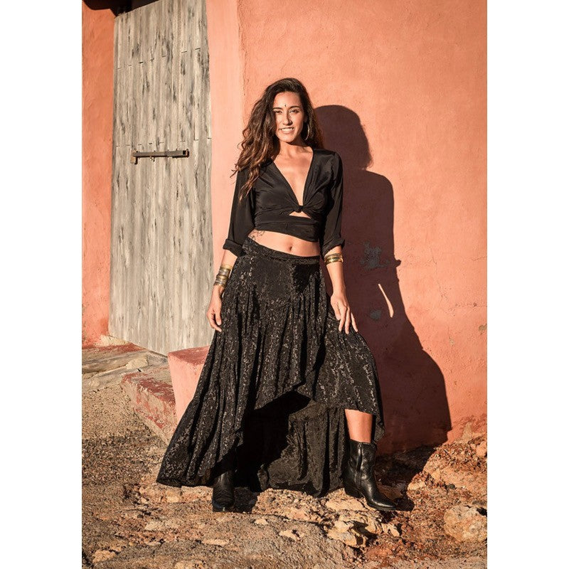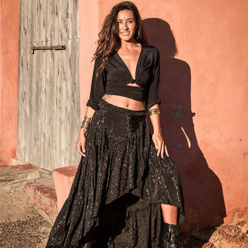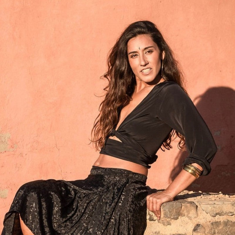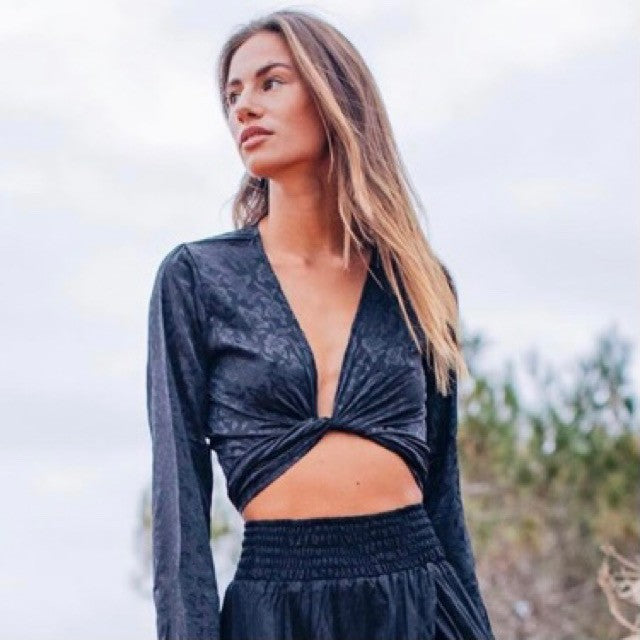 Satin top with shirt sleeve. You can tie it in front double back, back, it has several ways to wear it.