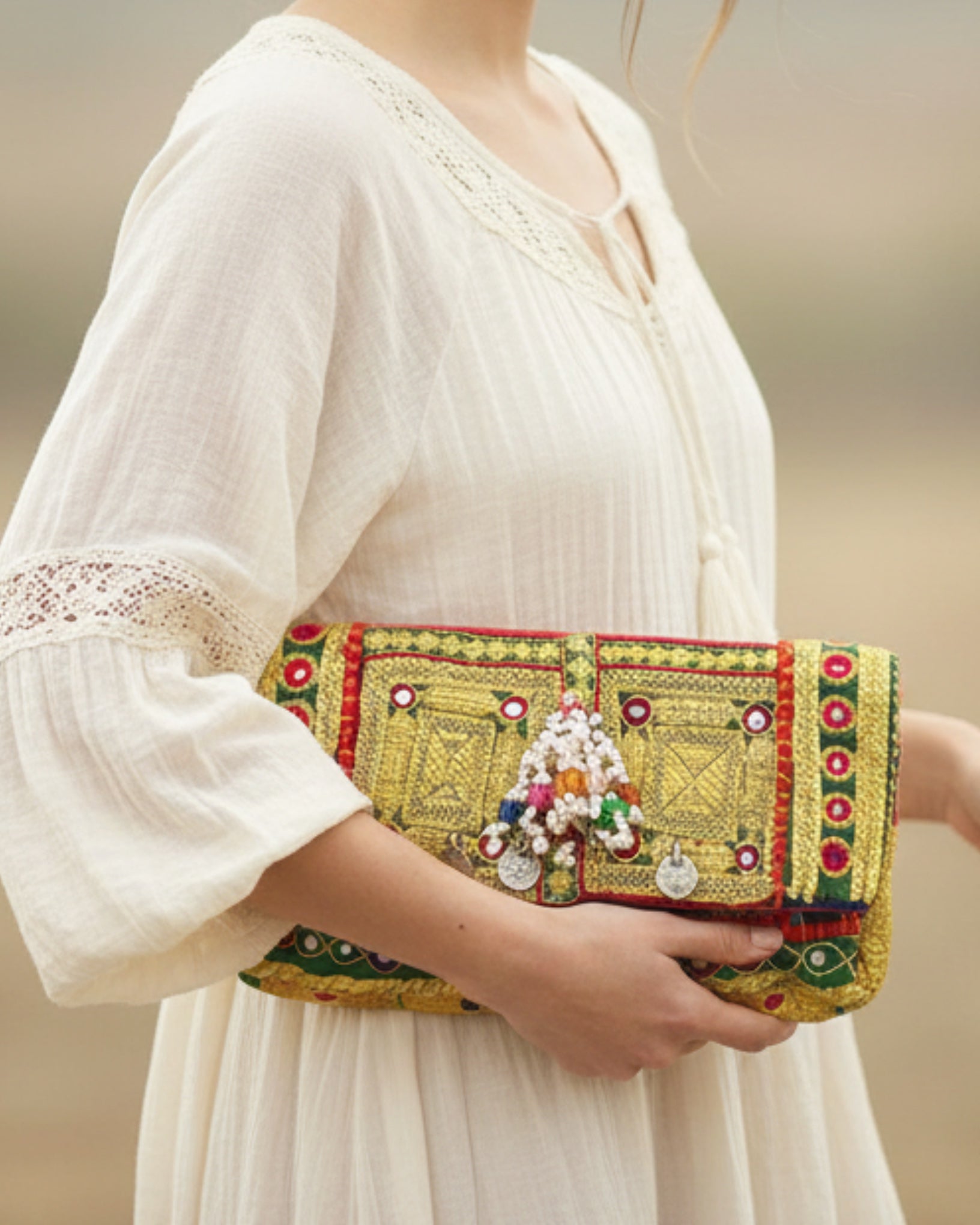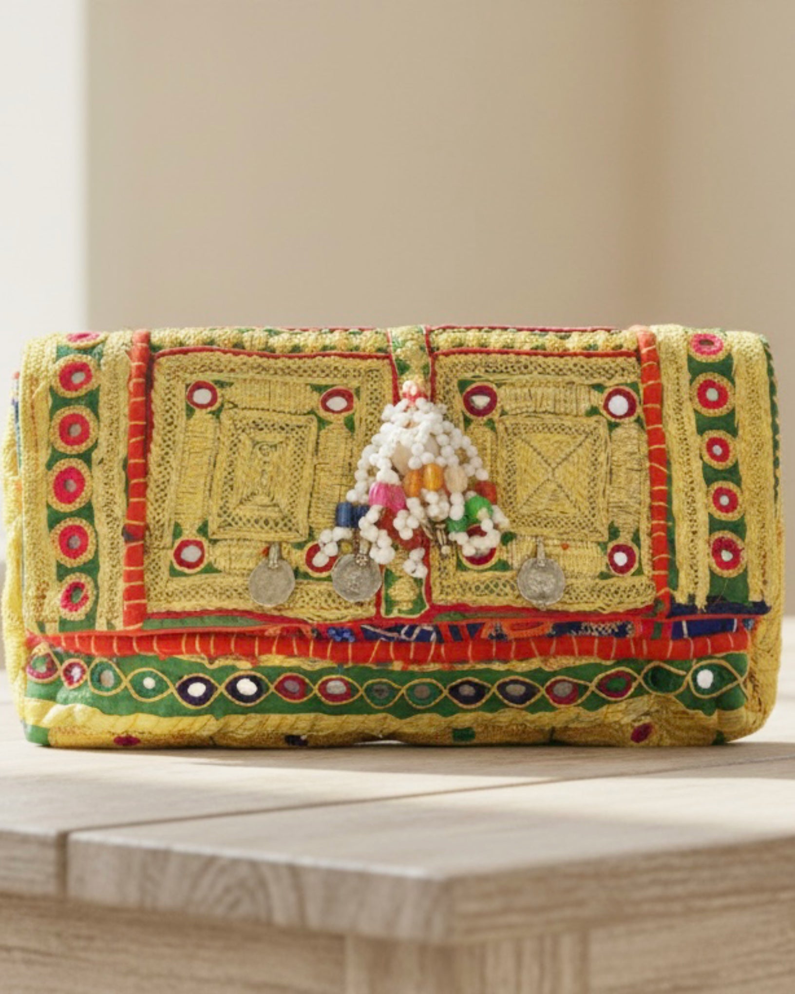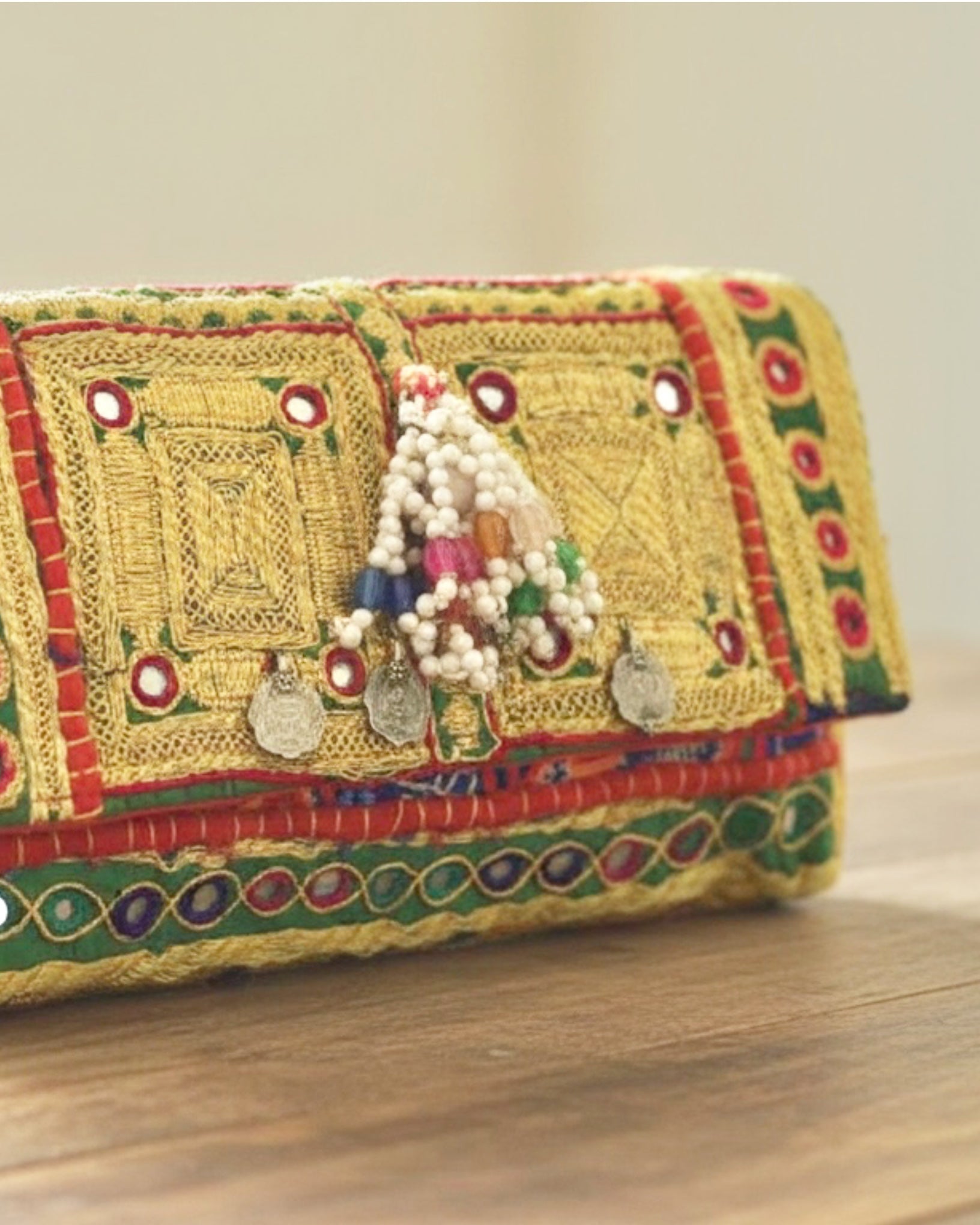 This colorful ethnic clutch bag was carefully handmade with vintage fabrics from Afghanistan and decorated with old tribal accessories on top.