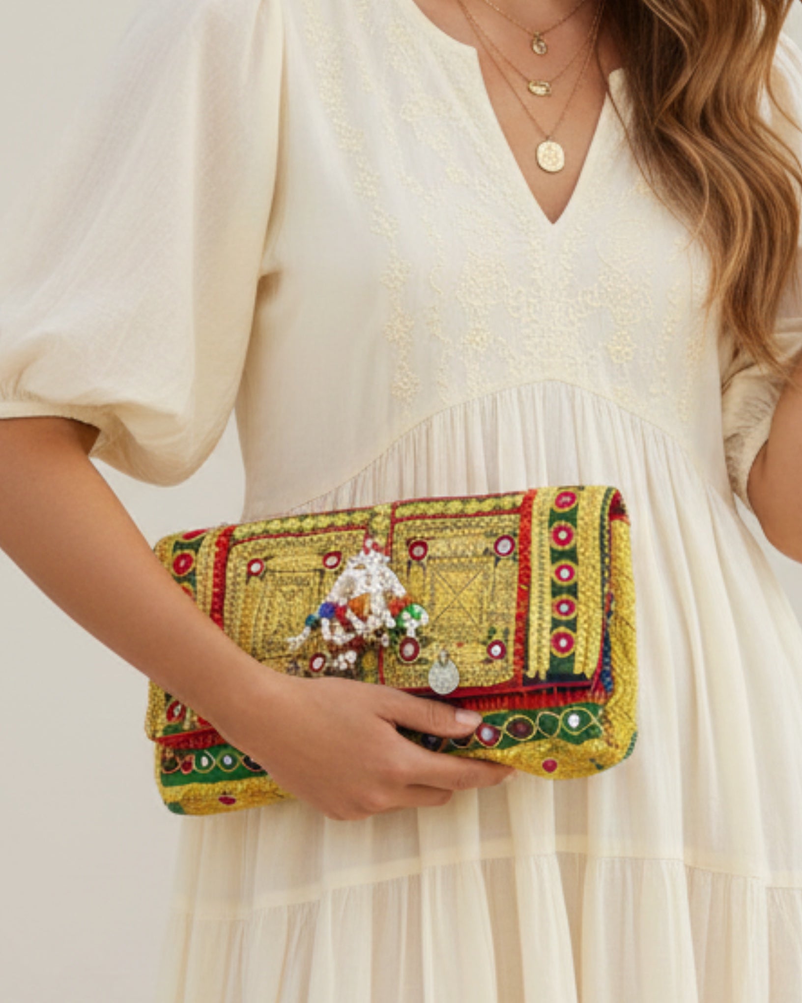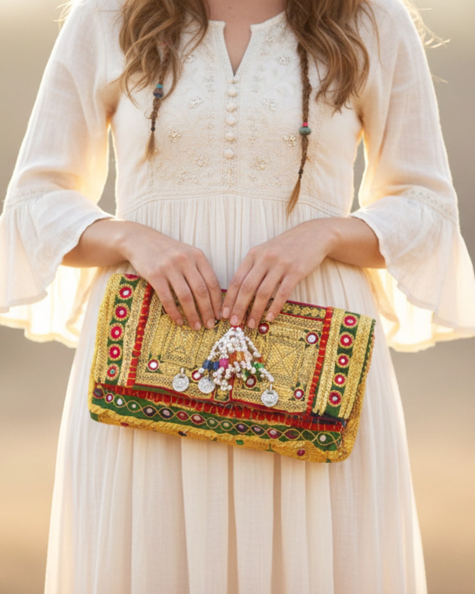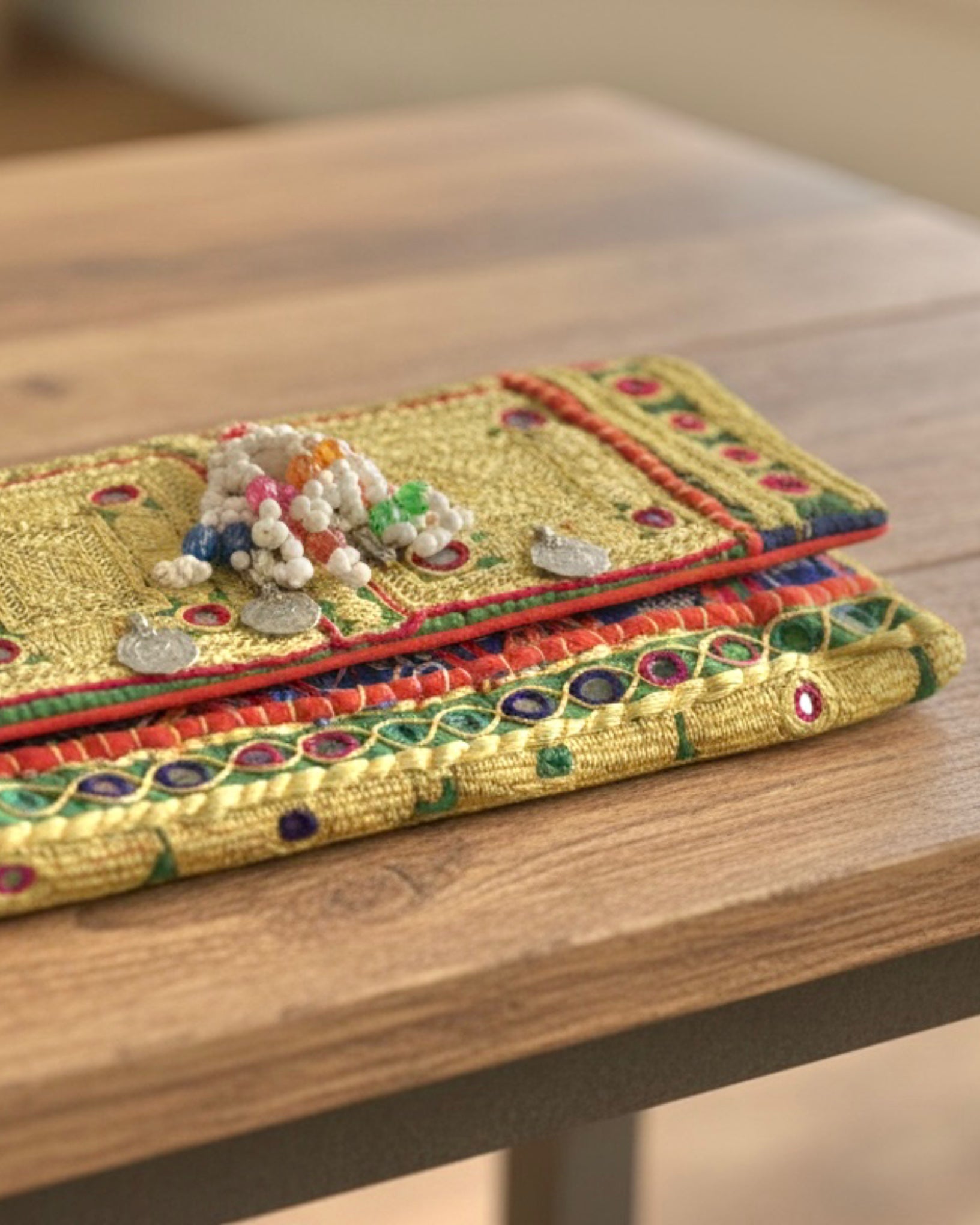 This colorful ethnic clutch bag was carefully handmade with vintage fabrics from Afghanistan and decorated with old tribal accessories on top.
