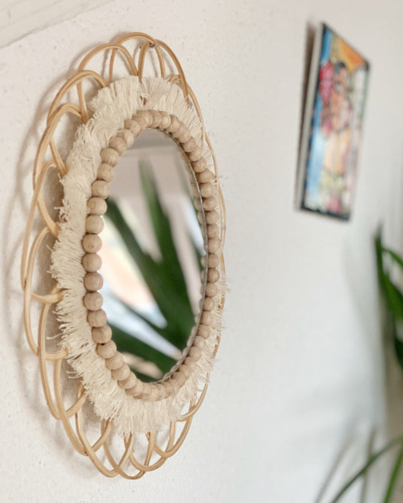 A handmade mirror like this can add warmth, texture, and character to any boho-inspired space.
